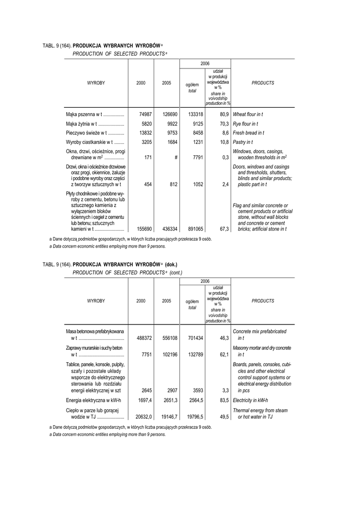 TABL. 9 (164). PRODUKCJA WYBRANYCH WYROBÓW a PRODUCTION OF SELECTED PRODUCTS a 2006 WYROBY Mąka pszenna w t ................. 2000 2005 udział w produkcji województwa w% share in voivodship production in % ogółem total PRODUCTS 74987 126690 133318 Mąka żytnia w t ..................... 5820 9922 9125 Pieczywo świeże w t ............. 13832 9753 8458 Wyroby ciastkarskie w t ........ 3205 1684 1231 Okna, drzwi, ościeżnice, progi drewniane w m2 ................ 171 # 7791 0,3 1052 Doors, windows and casings and thresholds, shutters, blinds and similar products; plastic part in t 2,4 891065 Flag and similar concrete or cement products or artificial stone, without wall blocks and concrete or cement 67,3 bricks; artificial stone in t Drzwi, okna i ościeżnice drzwiowe oraz progi, okiennice, żaluzje i podobne wyroby oraz części z tworzyw sztucznych w t Płyty chodnikowe i podobne wyroby z cementu, betonu lub sztucznego kamienia z wyłączeniem bloków ściennych i cegieł z cementu lub betonu; sztucznych kamieni w t ........................ 454 155690 812 436334 80,9 Wheat flour in t 70,3 Rye flour in t 8,6 Fresh bread in t 10,8 Pastry in t Windows, doors, casings, wooden thresholds in m2 a Dane dotyczą podmiotów gospodarczych, w których liczba pracujących przekracza 9 osób. a Data concern economic entities employing more than 9 persons. TABL. 9 (164). PRODUKCJA WYBRANYCH WYROBÓW a (dok.) PRODUCTION OF SELECTED PRODUCTS a (cont.) 2006 udział w produkcji województwa w% share in voivodship production in % 2000 2005 Masa betonowa prefabrykowana w t ..................................... 488372 556108 701434 46,3 Concrete mix prefabricated in t Zaprawy murarskie i suchy beton w t ..................................... 7751 102196 132789 62,1 Masonry mortar and dry concrete in t WYROBY Tablice, panele, konsole, pulpity, szafy i pozostałe układy wsporcze do elektrycznego sterowania lub rozdziału energii elektrycznej w szt ogółem total 2645 2907 3593 Energia elektryczna w kW•h 1697,4 2651,3 2564,5 Ciepło w parze lub gorącej wodzie w TJ ...................... 20632,0 19146,7 19796,5 a Dane dotyczą podmiotów gospodarczych, w których liczba pracujących przekracza 9 osób. a Data concern economic entities employing more than 9 persons. PRODUCTS Boards, panels, consoles, cubicles and other electrical control support systems or electrical energy distribution in pcs 3,3 83,5 Electricity in kW•h 49,5 Thermal energy from steam or hot water in TJ