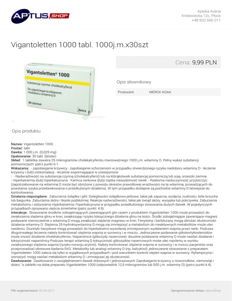 Apteka Avena Królewiecka 12c, Płock +48 502 666 011 Vigantoletten 1000 tabl. 1000j.m.x30szt Cena: 9,99 PLN Opis słownikowy Producent MERCK KGAA Opis produktu Nazwa: Vigantoletten 1000 Postać: tabl. Dawka: 1 000 j.m. (0,025 mg) Opakowanie: 30 tabl. (blister) Skład: 1 tabletka zawiera 25 mikrogramów cholekalcyferolu równoważnego 1000 j.m. witaminy D. Pełny wykaz substancji pomocniczych: patrz punkt 6.1. Wskazania: - zapobieganie krzywicy - zapobieganie schorzeniom w przypadku stwierdzonego ryzyka niedoboru witaminy D - leczenie krzywicy i (lub) osteomalacji - leczenie wspomagające w osteoporozie : - Nadwrażliwość na substancję czynną (cholekalcyferol) lub na którąkolwiek substancję pomocniczą lub soję, orzeszki ziemne. - Hiperkalcemia i(lub) hiperkalcynuria - Kamica nerkowa i(lub) ciężka niewydolność nerek. - Rzekoma niedoczynność przytarczyc (zapotrzebowanie na witaminę D może być obniżone z powodu okresów prawidłowej wrażliwości na tę witaminę, prowadzących do powstania ryzyka przedawkowania o przedłużonym działaniu). W tym przypadku dostępne są pochodne witaminy D łatwiejsze do kontrolowania. Działania niepożądane: Zaburzenia żołądka i jelit: Dolegliwości żołądkowo-jelitowe, takie jak zaparcia, wzdęcia, nudności, bóle brzucha lub biegunka. Zaburzenia skóry i tkanki podskórnej: Reakcje nadwrażliwości, takie jak świąd skóry, wysypka lub pokrzywka. Zaburzenia metabolizmu i odżywiania Hiperkalcemia i hiperkalcynuria w przypadku przedłużonego stosowania dużych dawek. W pojedynczych przypadkach opisywano zejścia śmiertelne (patrz punkt: 4.9). Interakcje: Stosowanie środków zobojętniających zawierających glin razem z produktem Vigantoletten 1000 może prowadzić do zwiększenia stężenia glinu w krwi, zwiększając ryzyko toksycznego działania glinu na kości. Środki zobojętniające zawierające magnez podawane równocześnie z witaminą D mogą zwiększać stężenie magnezu w krwi. Fenytoina i barbiturany mogą obniżać skuteczność działania witaminy D. Stężenia 25-hydroksywitaminy D mogą się zmniejszyć a metabolizm do nieaktywnych metabolitów może ulec nasileniu. Diuretyki tiazydowe mogą prowadzić do hiperkalcemii wywołanej zmniejszonym wydalaniem wapnia przez nerki. Podczas długotrwałego leczenia należy kontrolować stężenia wapnia w surowicy i w moczu. Jednoczesne podawanie glikokortykosteroidów może znosić działanie cholekalcyferolu. Naparstnica (glikozydy nasercowe): doustne podawanie witaminy D może nasilać działanie i toksyczność naparstnicy Podczas terapii witaminą D toksyczność glikozydów nasercowych może ulec nasileniu w wyniku zwiększonego stężenia wapnia (ryzyko rozwoju arytmii). Należy kontrolować stężenie wapnia w surowicy i w moczu pacjentów oraz przeprowadzać okresowe badania EKG. Metabolity lub analogi witaminy D (np. kalcytriol): jednoczesne stosowanie z preparatem Vigantoletten 1000 zaleca się tylko w wyjątkowych przypadkach i pod warunkiem kontroli stężeń wapnia w surowicy. Ryfampicyna i izoniazyd: mogą nasilać metabolizm witaminy D i zmniejszać jej skuteczność. Dawkowanie: Dawkowanie z uwzględnieniem dawek dobowych i jednorazowych Zapobieganie krzywicy u noworodków, niemowląt i dzieci: ½ tabletki na dobę preparatu Vigantoletten 1000 (odpowiednik 12,5 mikrogramów lub 500 j.m. witaminy D) (patrz punkt:4.4). Plik wygenerowano: 02-03-2017 Oprogramowanie sklepu: AptusShop Apteka Avena Królewiecka 12c, Płock +48 502 666 011 Zapobieganie schorzeniom w przypadku stwierdzonego ryzyka niedoboru witaminy D: ½- 1 tabletki na dobę Vigantoletten 1000 (odpowiednik 12,5 mikrogramów lub 500 j.m.- 25 mikrogramów lub 1000 j.m. witaminy D)(patrz punkt:4.4). Dawki lecznicze (powyżej 500 j.m. witaminy D na dobę) można stosować jedynie po stwierdzeniu hipokalcemii i niedoboru witaminy D. W terapii uzupełniającej osteoporozy: 1 tabletka na dobę preparatu Vigantoletten 1000 (odpowiednik około 25 mikrogramów lub 1000 j.m. witaminy D)(patrz punkt:4.4). Dawka powinna być określona przez lekarza prowadzącego. Wcześniaki z reguły otrzymują 1 tabletkę preparatu Vigantoletten 1000 (odpowiednik 25 mikrogramów lub 1000 j.m. witaminy D) celem profilaktyki krzywicy(patrz punkt: 4.4). Po osiągnięciu 40 tygodnia życia wieku skorygowanego dawkę profilaktyczną należy zmniejszyć. Podczas długotrwałej terapii preparatem Vigantoletten 1000 w dawkach dobowych przekraczających 500 j.m. należy systematycznie monitorować stężenie wapnia w surowicy i w moczu oraz kontrolować czynność nerek przez pomiar stężenia kreatyniny w surowicy. W razie potrzeby należy zmodyfikować dawkę na podstawie zmierzonych wartości stężenia wapnia w surowicy (patrz punkt: 4.4). Czas stosowania i sposób podawania Noworodki, niemowlęta i małe dzieci Należy rozpuścić tabletkę w wodzie na łyżeczce (do herbaty) i podać zawiesinę wodną dziecku bezpośrednio do ust, najlepiej podczas posiłku. Nie zaleca się dodawania tak sporządzonej zawiesiny wodnej do zawartości butelki niemowlęcia (noworodka) lub innego pokarmu, gdyż wówczas nie można zagwarantować przyjęcia całej dawki preparatu. Jeśli jednak Vigantoletten w tabletkach musi zostać podany z pokarmem (płynnym), konieczne jest wcześniejsze zagotowanie pokarmu (mleka). Przy wyznaczeniu dawki należy uwzględnić zawartość witaminy D w pokarmie, jeśli stosuje się równocześnie pokarm z dodatkiem witaminy D i preparat Vigantoletten w tabletkach. Noworodki karmione piersią, których matki przyjmowały witaminę D w ostatnim trymestrze ciąży, wymagają suplementacji witaminy D począwszy od trzeciego tygodnia życia. Noworodki karmione piersią, których matki nie otrzymywały witaminy D w ostatnim trymestrze ciąży, wymagają suplementacji witaminy D począwszy od pierwszych dni życia. Noworodki karmione mlekiem modyfikowanym, spożywające w ciągu doby objętość mleka, która zab