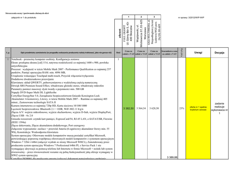 Streszczenia oceny i porównania złożonych ofert Notebook - przenośny komputer osobisty. Konfiguracja zestawu: Ekran: przekątna ekranu [cal] 15.6, natywna rozdzielczość co najmniej 1600 x 900, powłoka antyrefleksyjna Procesor: wydajność w teście Mobile Mark 2007 - Performance Qualification co najmniej 257 punktów, Pamięć operacyjna RAM: min. 4096 MB, Urządzenie wskazujące Touchpad multi-touch, Przycisk włączenia/wyłączenia Dodatkowe dwukierunkowe przewijanie Klawiatura: układ QWERTY, pełnowymiarowa z wydzieloną częścią numeryczną Dźwięk SRS Premium Sound Effect, wbudowane głośniki stereo, wbudowany mikrofon Parametry pamieci masowej: dysk twardy o pojemności min. 500 GB Napędy DVD-Super Multi DL LightScribe Certyfikat EnergyStar 5.0, Zarządzanie bezpieczeństwem Gniazdo Kensington Lock Akumulator: 6-komorowy, Litowy, w teście Mobile Mark 2007 - Runtime co najmniej 405 minut., Zastosowane technologie SATA II Kamera internetowa co najmniej 720p HD, Karta sieciowa 10/100/1000 Łączność bezprzewodowa: Bluetooth 2.1 + EDR, WiFi 802.11 b/g/n Złącza A/V: wejście mikrofonowe, wyjście słuchawkowe, wyjście D-Sub, wyjście DisplayPort, Złącza USB - 4x 2.0 Gniazda rozszerzeń: czytnik kart pamięci, ExpressCard/54, RJ-45 LAN, e-SATA/USB, Firewire (IEEE 1394a) Złącze dokowania, Złącze akumulatora dodatkowego, Port szeregowy Załączone wyposażenie: zasilacz + przewód; bateria (6-ogniwowy akumulator litowy min. 55 Wh), Konstrukcja: Wodoodporna klawiatura System operacyjny: Oferowane modele komputerów muszą posiadać certyfikat Microsoft, potwierdzający poprawną współpracę oferowanych modeli komputerów z systemem operacyjnym Windows 7 32bit i 64bit (załączyć wydruk ze strony Microsoft WHCL), Zainstalowany przez producenta system operacyjny Windows 7 Professional 64bit PL z Service Pack 1 nie wymagający aktywacji za pomocą telefonu lub Internetu w firmie Microsoft + nośnik lub system równoważny – przez równoważność rozumie się pełną funkcjonalność jaką oferuje wymagany w SIWZ system operacyjny Certyfikat ISO9001 dla producenta sprzętu (załączyć dokument potwierdzający spełnianie Ilość 3 GIGA MULTIMEDIA, al. Niepodległości/Armii Ludowej WGE paw. 26/28, 00-609 nr sprawy: 3/2012/WIP-WIP P aSzacunkowa cena Cena za Cena za Cena za całość z VAT całość z VAT całość z VAT r za całość z VAT a VAT (%) 1 Opis przedmiotu zamówienia (w przypadku wskazania producenta należy traktować, jako nie gorsze niż) F.H.U. GRAWIT Ul. Górny Bór 5, 43430 Skoczów oferent L.p. 2 STATIM Piotr Wypijewski, ul. Mickiewicza 37, 01-625 Warszawa 1 załącznik nr 1 do protokołu Uwagi Decyzja 23% oferta nr 1 spełnia kryterium cenowe zadanie realizuje wykonawca nr 1 1 3 382,50 3 564,54 3 628,50 3 389,88 2 Monitor LCD 23-24", technologia wykonania IPS, rozdzielczość min. 1920x1080, podświetlenie LED; wejścia: D-Sub 15pin, złącze cyfrowe DVI, czarny; nie gorszy niż iiyama ProLite X2377HDS LED IPS 16 13 776,00 11 197,92 10 627,20 23% oferta nr 3 spełnia kryterium cenowe 23% oferta nr 2 spełnia kryterium cenowe 23% oferta nr 1 spełnia kryterium cenowe 12 800,00 3 4 1 Monitor LCD 27", rozdzielczość min. 1920x1080, podświetlenie LED, wejścia: D-Sub 15pin, złącze cyfrowe DVI; nie gorszy niż iiyama ProLite E2773HDS LED czarny Tablica interaktywna: przekątna robocza 79" lub więcej, miltitouch (operowanie palcem i pisakiem), gwarancja 5 lat, oprogramowanie, projektor ultrakrótkoogniskowy, uchwyt montażowy, montaż zestawu w cenie 1 230,00 1 047,96 1 094,70 1 100,00 1 9 840,00 0,00 10 811,70 10 000,00 zadanie realizuje wykonawca nr 3 zadanie realizuje wykonawca nr 2 zadanie realizuje wykonawca nr 1