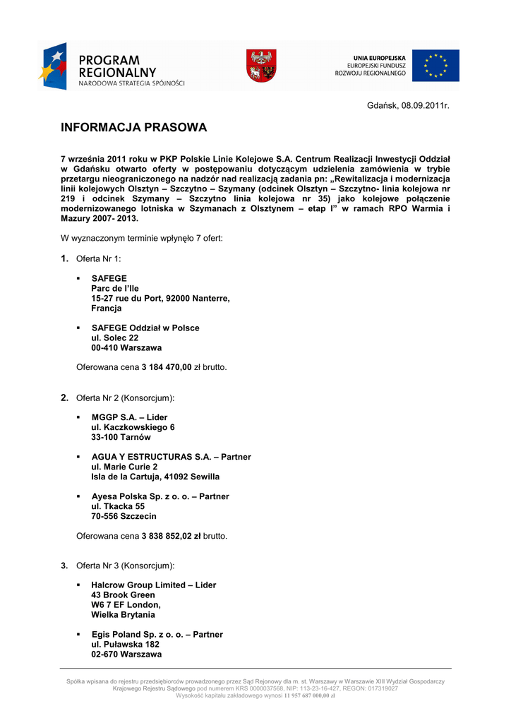 Gdańsk, 08.09.2011r. INFORMACJA PRASOWA 7 września 2011 roku w PKP Polskie Linie Kolejowe S.A. Centrum Realizacji Inwestycji Oddział w Gdańsku otwarto oferty w postępowaniu dotyczącym udzielenia zamówienia w trybie przetargu nieograniczonego na nadzór nad realizacją zadania pn: „Rewitalizacja i modernizacja linii kolejowych Olsztyn – Szczytno – Szymany (odcinek Olsztyn – Szczytno- linia kolejowa nr 219 i odcinek Szymany – Szczytno linia kolejowa nr 35) jako kolejowe połączenie modernizowanego lotniska w Szymanach z Olsztynem – etap I” w ramach RPO Warmia i Mazury 2007- 2013. W wyznaczonym terminie wpłynęło 7 ofert: 1. Oferta Nr 1: SAFEGE Parc de l’lle 15-27 rue du Port, 92000 Nanterre, Francja SAFEGE Oddział w Polsce ul. Solec 22 00-410 Warszawa Oferowana cena 3 184 470,00 zł brutto. 2. Oferta Nr 2 (Konsorcjum): MGGP S.A. – Lider ul. Kaczkowskiego 6 33-100 Tarnów AGUA Y ESTRUCTURAS S.A. – Partner ul. Marie Curie 2 Isla de la Cartuja, 41092 Sewilla Ayesa Polska Sp. z o. o. – Partner ul. Tkacka 55 70-556 Szczecin Oferowana cena 3 838 852,02 zł brutto. 3. Oferta Nr 3 (Konsorcjum): Halcrow Group Limited – Lider 43 Brook Green W6 7 EF London, Wielka Brytania Egis Poland Sp. z o. o. – Partner ul. Puławska 182 02-670 Warszawa Spółka wpisana do rejestru przedsiębiorców prowadzonego przez Sąd Rejonowy dla m. st. Warszawy w Warszawie XIII Wydział Gospodarczy Krajowego Rejestru Sądowego pod numerem KRS 0000037568, NIP: 113-23-16-427, REGON: 017319027 Wysokość kapitału zakładowego wynosi 11 957 687 000,00 zł Oferowana cena 4 108 251,66 zł brutto. 4. Oferta Nr 4 (Konsorcjum): TPF PLANEGE – Consultores de Engenharia e Gestào S.A. – Lider R. Laura Aloes 12, 8, 1050 – 138 Lisboa, Portugal TPF Sp. z o. o. – Partner ul. Szyszkowa 34 02-285 Warszawa Oferowana cena 3 339 841,36 zł brutto. 5. Oferta Nr 5 (Konsorcjum): Movares Polska Sp. z o. o. – Lider ul. Świętojerska 5/7 00-236 Warszawa Biuro Realizacji Inwestycji Koltech – Partner ul. Targowa 69 03-729 Warszawa Oferowana cena 3 638 340,00 zł brutto. 6. Oferta Nr 6 (Konsorcjum): Scott Wilson Sp. z o. o. – Lider ul. Rejtana 17 02-516 Warszawa URS Scott Wilson Ltd. – Partner reprezentowany przez: URS Scott Wilson Ltd Sp. z o. o. Scott House, Alencon Link, Basingstoke Hampshire RG21 7PP Wielka Brytania 880328 ul. Rejtana 17 02-516 Warszawa Transprojekt Gdańsk Sp. z o. o. – Partner ul. Partyzantów 72A 80-254 Gdańsk Oferowana cena 9 175 800,00 zł brutto. 7. Oferta Nr 7 (Konsorcjum): MOTT MACDONALD POLSKA Sp. z o. o. . – Lider ul. Walców 11 01-851 Warszawa MOTT MACDONALD LIMITED w imieniu i na rzecz której działa w Polsce MOTT MACDONALD LIMITED Sp. z o. o. MOTT MACDONALD HOUSE 8-10 SYDENHAM ROAD, CROYDON SURREY, CRO 2EE Wielka Brytania ul. Walców 11 00-851 Warszawa Spółka wpisana do rejestru przedsiębiorców prowadzonego przez Sąd Rejonowy dla m. st. Warszawy w Warszawie XIII Wydział Gospodarczy Krajowego Rejestru Sądowego pod numerem KRS 0000037568, NIP: 113-23-16-427, REGON: 017319027 Wysokość kapitału zakładowego wynosi 11 957 687 000,00 zł Oferowana cena 1 426 800,00 zł brutto. Zamawiający zamierza przeznaczyć na sfinansowanie zamówienia kwotę brutto 5 224 142,10 zł . Komisja przetargowa rozpoczęła analizowanie złoŜonych ofert pod kątem ich zgodności z wymogami formalnymi i technicznymi. Jedynym kryterium wyboru ofert jest cena. Nadzór w okresie projektowania i realizacji robót budowlanych oraz odbioru wynosi 20 miesięcy oraz w okresie zgłaszania wad do 31.05.2015r. Informacje dla mediów Ewa Symonowicz-Ginter PKP Polskie Linie Kolejowe S.A. Centrum Realizacji Inwestycji Oddział w Gdańsku ul. Dyrekcyjna 2-4 80-958 Gdańsk tel. 058 721 92 07, 694 480 211 e-mail: [email protected] Projekt współfinansowany ze środków Unii Europejskiej – Europejskiego Funduszu Rozwoju Regionalnego w ramach Regionalnego Programu Operacyjnego Warmia i Mazury na lata 2007-2013 „Warmia i Mazury regionem zjednoczonej Europy” Spółka wpisana do rejestru przedsiębiorców prowadzonego przez Sąd Rejonowy dla m. st. Warszawy w Warszawie XIII Wydział Gospodarczy Krajowego Rejestru Sądowego pod numerem KRS 0000037568, NIP: 113-23-16-427, REGON: 017319027 Wysokość kapitału zakładowego wynosi 11 957 687 000,00 zł