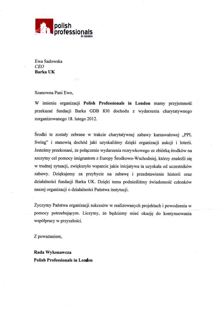 oolish Professio;r,gl"q Ewa Sadowska CEO Barka UK Szanowna Pani Ewo, W imieniu oryanizacji Polish Professionals in London mamy przyjemnoSd przekazal fundacji Barka GDB 830 dochodu z wydarzenia charytatyrxmego zorgatizowanego 18. lutego 2012. Srodki Swing" te zostaly zebrane w i stanowi4 doch6d trakcie charytatywnej zabav,ry karnawalowej ,,PPL jaki uzyskaliSmy dzigki organzacji aukcji i loterii. JesteSmy przekonani,2e polqczenie wydarzenia rozrywkowego ze zbi6rkqSrodk6w na szczytny cel pomocy imigrantom z Europy Srodkowo-Wschodniej ,ld6rzy znale2li sig w trudnej sytuacji, zwigkszylo wsparcie jakie inicjatywa ta uzyskala od uczestnik6w zabawy. Dzigkujemy za przybycie na zabawg i przedstawienie historii oraz dzialalnoSci fundacji Barka UK. DziEki temu podnieSli5my Swiadomo5i czlonk6w naszej organizacji o dzialalnoSci Paristwa instytucji. Zyczymy Paristwa oryanizacji sukces6w w realizowanych projektach i powodzenia w pomoay potrzebuj4cym; Liczymy, 2e bgdziemy mied okazjg do kontynuowania wsp6lpracy w przyszloSci. Zpowu2antem, Rada Wykonawcza Polish Professionals in London