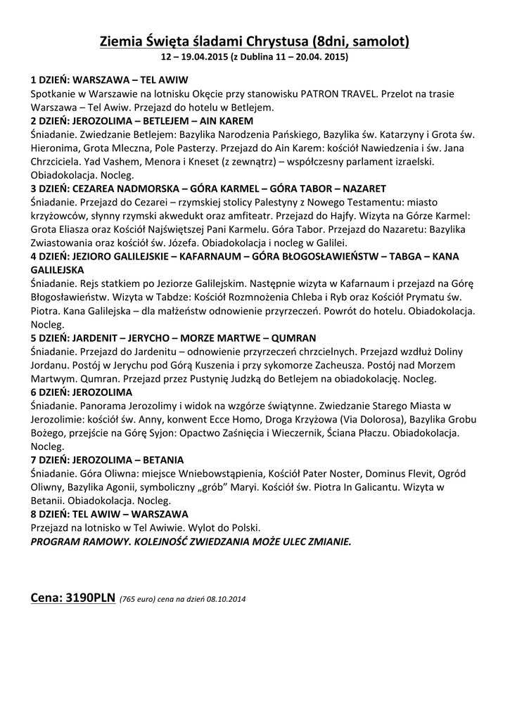 Ziemia Święta śladami Chrystusa (8dni, samolot) 12 – 19.04.2015 (z Dublina 11 – 20.04. 2015) 1 DZIEŃ: WARSZAWA – TEL AWIW Spotkanie w Warszawie na lotnisku Okęcie przy stanowisku PATRON TRAVEL. Przelot na trasie Warszawa – Tel Awiw. Przejazd do hotelu w Betlejem. 2 DZIEŃ: JEROZOLIMA – BETLEJEM – AIN KAREM Śniadanie. Zwiedzanie Betlejem: Bazylika Narodzenia Pańskiego, Bazylika św. Katarzyny i Grota św. Hieronima, Grota Mleczna, Pole Pasterzy. Przejazd do Ain Karem: kościół Nawiedzenia i św. Jana Chrzciciela. Yad Vashem, Menora i Kneset (z zewnątrz) – współczesny parlament izraelski. Obiadokolacja. Nocleg. 3 DZIEŃ: CEZAREA NADMORSKA – GÓRA KARMEL – GÓRA TABOR – NAZARET Śniadanie. Przejazd do Cezarei – rzymskiej stolicy Palestyny z Nowego Testamentu: miasto krzyżowców, słynny rzymski akwedukt oraz amfiteatr. Przejazd do Hajfy. Wizyta na Górze Karmel: Grota Eliasza oraz Kościół Najświętszej Pani Karmelu. Góra Tabor. Przejazd do Nazaretu: Bazylika Zwiastowania oraz kościół św. Józefa. Obiadokolacja i nocleg w Galilei. 4 DZIEŃ: JEZIORO GALILEJSKIE – KAFARNAUM – GÓRA BŁOGOSŁAWIEŃSTW – TABGA – KANA GALILEJSKA Śniadanie. Rejs statkiem po Jeziorze Galilejskim. Następnie wizyta w Kafarnaum i przejazd na Górę Błogosławieństw. Wizyta w Tabdze: Kościół Rozmnożenia Chleba i Ryb oraz Kościół Prymatu św. Piotra. Kana Galilejska – dla małżeństw odnowienie przyrzeczeń. Powrót do hotelu. Obiadokolacja. Nocleg. 5 DZIEŃ: JARDENIT – JERYCHO – MORZE MARTWE – QUMRAN Śniadanie. Przejazd do Jardenitu – odnowienie przyrzeczeń chrzcielnych. Przejazd wzdłuż Doliny Jordanu. Postój w Jerychu pod Górą Kuszenia i przy sykomorze Zacheusza. Postój nad Morzem Martwym. Qumran. Przejazd przez Pustynię Judzką do Betlejem na obiadokolację. Nocleg. 6 DZIEŃ: JEROZOLIMA Śniadanie. Panorama Jerozolimy i widok na wzgórze świątynne. Zwiedzanie Starego Miasta w Jerozolimie: kościół św. Anny, konwent Ecce Homo, Droga Krzyżowa (Via Dolorosa), Bazylika Grobu Bożego, przejście na Górę Syjon: Opactwo Zaśnięcia i Wieczernik, Ściana Płaczu. Obiadokolacja. Nocleg. 7 DZIEŃ: JEROZOLIMA – BETANIA Śniadanie. Góra Oliwna: miejsce Wniebowstąpienia, Kościół Pater Noster, Dominus Flevit, Ogród Oliwny, Bazylika Agonii, symboliczny „grób” Maryi. Kościół św. Piotra In Galicantu. Wizyta w Betanii. Obiadokolacja. Nocleg. 8 DZIEŃ: TEL AWIW – WARSZAWA Przejazd na lotnisko w Tel Awiwie. Wylot do Polski. PROGRAM RAMOWY. KOLEJNOŚĆ ZWIEDZANIA MOŻE ULEC ZMIANIE. Cena: 3190PLN (765 euro) cena na dzień 08.10.2014 CENA ZAWIERA: przelot samolotem ; opłaty lotniskowe; transfery autokarem; 7 noclegów w hotelach 2*/3* (pokoje 2-‐, 3-‐osobowe); 6 śniadań i 7 obiadokolacji; opiekę księdza; opiekę przewodnika; ubezpieczenie KL i NNW; podatek VAT CENA NIE ZAWIERA: biletów wstępu i innych kosztów realizacji programu -‐ 90 USD (płatne kontrahentowi po przylocie na miejsce); posiłków i napojów na pokładzie samolotu; napojów do obiadokolacji; zwyczajowych napiwków; dodatkowego ubezpieczenia kosztów rezygnacji (2,5% lub 7,5% ceny); dopłaty do pokoju jednoosobowego (650PLN); wydatków osobistych Na czas wyjazdu należy posiadać paszport ważny minimum 6 miesięcy od daty powrotu z pielgrzymki. Paszport nie może zawierać pieczątek m.in. syryjskich i libańskich! Ponieważ wycenę programu przygotowujemy z dużym wyprzedzeniem czasowym względem jego realizacji, chcielibyśmy zwrócić uwagę, że w razie wzrostu cen paliwa, opłat lotniskowych, kursu walut itp., podana cena może ulec zmianie. Do ceny naszego wyjazdu należy doliczyć: - bilet samolot – Dublin – Warszawa – Dublin – ok 160 – 200 euro - 2 x nocleg w Warszawie Całość powinna zamknąć się w kwocie 1100 Euro Zgłoszenia do końca października z wpłatą zaliczki (bezzwrotnej) na konto 250 euro. Reszta kwoty płatna do 12 marca 2015 – miesiąc przez pielgrzymką