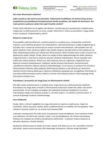 Kto może sfinansować szkolenie? Jeden zawód na całe życie to już przeszłość. Podnoszenie kwalifikacji, ich zmiana lub po prostu uzupełnienie już posiadanych kompetencji jest bardzo przydatne, ale zwykle też kosztowne. Kto może pomóc w pokryciu całości lub części kosztów szkoleń? Osoby, które aktualnie nie są nigdzie zatrudnione i zarejestrują się w powiatowym urzędzie pracy, mogą liczyć na dofinansowanie ze strony urzędu. Natomiast ci, którzy są zatrudnieni, mogą szukać innych rozwiązań. Podpowiadamy, jakich! Wsparcie urzędu pracy W przypadku osób bezrobotnych, zarejestrowanych w urzędzie pracy, istnieją dwie możliwości wsparcia, są to szkolenia grupowe oraz indywidualne. Listę tych pierwszych urzędy przygotowują na początku roku i zazwyczaj umieszczają na swoich stronach internetowych. Jeśli spodoba nam się jakieś szkolenie z listy, wystarczy zgłosić chęć udziału swojemu doradcy klienta, który pokieruje nas dalej. Najważniejszą zaletą tych szkoleń jest sfinansowanie całości kosztów przez urząd, minusem zaś ograniczony wybór szkoleń. Osoby, które nie znajdą na liście odpowiedniego dla siebie szkolenia, mogą skorzystać z innej formy wsparcia, jaką jest szkolenie indywidualne. W tym wypadku sami wybieramy rodzaj szkolenia. Ważne jest, aby instytucja, która je organizuje, znajdowała się w Rejestrze Instytucji Szkoleniowych. Kolejnym, bardzo ważnym elementem, jest konieczność uzasadnienia celowości odbycia szkolenia indywidualnego. Co to oznacza w praktyce? Do wniosku o sfinansowanie szkolenia należy dołączyć deklarację pracodawcy o zatrudnieniu po ukończeniu szkolenia lub też własną deklarację o założeniu działalności gospodarczej. Szczegółowe informacje nt. warunków dofinansowania można znaleźć na stronie internetowej Centrum Informacyjnego Służb Zatrudnienia Zielona Linia. Pracodawcy i pracownicy też mogą liczyć na sfinansowanie szkoleń Nie tylko osoby zarejestrowane w urzędzie pracy mogą starać się o dofinansowanie szkolenia. Pracodawcy też mogą złożyć wniosek o sfinansowanie wybranych szkoleń dla siebie i dla swoich pracowników. W tym wypadku wymogiem jest spełnianie kryteriów dostępnych na stronie internetowej urzędu oraz złożenie wniosku w terminie naboru. Te szkolenia są finansowane w ramach Krajowego Funduszu Szkoleniowego. Inne możliwości Osoby, które z różnych względów nie mogą skorzystać ze wsparcia urzędu pracy, mają inne możliwości. Warto poszukać szkoleń, które są dofinansowane ze środków Unii Europejskiej. Takie szkolenia możemy znaleźć np. na stronie internetowej PARP. Ciekawym rozwiązaniem dla osób, które chcą podnosić swoje kwalifikacje, są też szkolenia online oraz webinaria. Ich oferta jest szeroka i wiele z nich jest bezpłatnych. Na stronie internetowej Zielonej Linii znajduje się unikalna wyszukiwarka webinariów – w jednym miejscu skupione są aktualne szkolenia z różnych dziedzin. Możliwości dofinansowania szkoleń jest wiele. Nawet, jeśli okaże się, że nie z wszystkich możemy skorzystać, zawsze warto poszukać alternatywnego rozwiązania. Wartym uwagi sposobem nabywania kompetencji są praktyki i staże. Podnoszenie kwalifikacji jest przede wszystkim kwestią chęci, a dopiero w dalszej kolejności - środków. Więcej praktycznych artykułów i najnowszych wiadomości z rynku pracy można znaleźć na: https://www.facebook.com/zielonalinia19524. Joanna Niemyjska (Zielona Linia 19524, Centrum Informacyjne Służb Zatrudnienia)