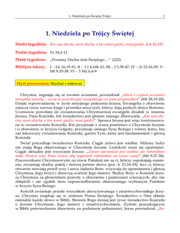 1. Niedziela po Świętej Trójcy 1 1. Niedziela po Trójcy Świętej Hasło tygodnia: Kto was słucha, mnie słucha, a kto wami gardzi, mną gardzi. (Łk 10,15) Psalm tygodnia: Ps 34,2-11 Pieśń tygodnia: „Prosimy Ducha dziś Świętego…“ (222) Biblijne teksty: I − Łk 16,19-31; II − 1 J 4,16b-21; III − J 5,39-47; IV − Jr 23,16-29; V− Mt 9,35-38; VI − 5 Mż 6,4-9 Myśl przewodnia: Słuchać i miłować Chrystus, żegnając się ze swoimi uczniami, powiedział: „Idźcie i czyńcie uczniami wszystkie narody,... ucząc je przestrzegać wszystkiego, co wam przykazałem” (Mt 28,19.20). Dzięki wprowadzeniu w życie misyjnego polecenia Jezusa, Ewangelia o zbawieniu zatacza coraz szersze kręgi i przenika serca tych, którzy dają posłuch słowu Bożemu. Uczniowie powołani do zwiastowania Chrystusowej ewangelii działali w imieniu Jezusa, Pana Kościoła. Ich świadectwo jest głosem samego Zbawiciela. „Kto was słucha, mnie słucha, a kto wami gardzi, mną gardzi”. Sprawa Jezusa jest więc kontynuowana w zwiastowaniu Kościoła. Kto przyjmuje z wiarą poselstwo o Chrystusie Jezusie i o zbawieniu w krzyżu Golgoty, przyjmuje samego Syna Bożego i wierzy Jemu, kto zaś lekceważy zwiastowanie Kościoła, gardzi Tym, który jest fundamentem i głową Kościoła. Świat potrzebuje świadectwa Kościoła. Ciągle żniwo jest wielkie. Miliony ludzi nie znają Boga objawionego w Chrystusie Jezusie. Ludzkość musi się upamiętać. Ciągle aktualne jest wezwanie Jezusa: „Żniwo wprawdzie jest wielkie, ale robotników mało. Proście więc Pana żniwa, aby wyprawił robotników na żniwo swoje” (Mt 9,37.38). Pracownikami Chrystusowymi na niwie Pańskiej nie są ci, którzy uspokajają sumienia, zwiastują złudny pokój i mówią próżne słowa (por. Jr 23,16-29), lecz ci, którzy otwarcie stawiają przed oczy i serca żądania Boże, wzywają do upamiętania i głoszą Chrystusa, Jego krzyż i zbawczą wartość Jego śmierci. Słudzy Boży w Kościele Jezusa Chrystusa są głosicielami prawdy o zbawieniu i pasterzami wierzących, aby nie zbłądzili i nie zgubili daru usprawiedliwienia ofiarowanego wybranym Pańskim w krzyżu Syna Bożego. Kościół zwiastuje przede wszystkim ukrzyżowanego i zmartwychwstałego Jezusa. Chrystus znajduje się w centrum Pisma Świętego. Świadectwo o Nim składa niemalże każde słowo w Biblii. Słowem Boga dzisiaj jest żywe świadectwo Kościoła o Jezusie Chrystusie, Jego śmierci i zmartwychwstaniu. Żydom poszukującym w Biblii potwierdzenia zbawienia na podstawie pobożności, Jezus powiedział: „Ba- 2 1. Niedziela po Świętej Trójcy dacie Pisma, bo sądzicie, że macie w nich żywot wieczny; a one składają świadectwo o mnie” (J 5,39). Głoszenie na ambonie ludzkich spraw i ziemskiej nadziei, jest zdradą ewangelii Jezusa. Chrystus żyje w Kościele w zwiastowanej ewangelii o krzyżu i zwycięstwie nad grzechem i śmiercią. Jest blisko tych, którzy znajdują się pod działaniem Jego słowa. Wielu chrześcijan bierze do ręki Pismo Święte, aby znaleźć w nim, podobnie jak Żydzi, potwierdzenie dla swoich przekonań religijnych i domniemanej sprawiedliwości. I chociaż Chrystus przychodzi do nich w imieniu Boga, to jednak Go nie przyjmują jako swojego suwerennego Pana i Zbawiciela. Wtedy pozostaje On na zewnątrz ich serca, pełnego własnej sprawiedliwości. Pycha, egoizm i połowiczne nawrócenie wykopują przepaść pomiędzy Chrystusem a Jego uczniami. Nie każdy, kto woła do Chrystusa: „Panie, Panie!”, wejdzie do Królestwa Bożego. Królestwo Niebios jest dla tych, którzy czynią wolę Ojca niebieskiego (por. Mt 7,21) Żydzi codziennie składali świadectwo swojej wiary: „Słuchaj Izraelu! Pan jest Bogiem naszym, Pan jedynie! Będziesz tedy miłował Pana, Boga swego, z całego serca swego i z całej duszy swojej, i z całej siły swojej” (5 Mż 6,4.5), a jednak nie przyjęli świadectwa Bożego o Jezusie i nie postępowali zgodnie z ewangelią Chrystusa. Duch Boży w 1. Niedzielę po Trójcy Świętej przypomina wszystkim wyznawcom Jezusa Chrystusa przypowieść ich Pana o bogaczu i Łazarzu. Celem tej przypowieści nie jest pochwała ubóstwa i potępienie bogactwa. Bogacz cierpiał męki po śmierci nie dlatego, że posiadał liczne dobra. Łazarz nie został przeniesiony na łono Abrahama ze względu na swoje ubóstwo. Bogacz nie zmiłował się na Łazarzem i dlatego cierpiał męki. Łazarzowi zaś Bóg okazał miłosierdzie, ponieważ cierpiąc niedostatek z pokorą znosił nałożony na niego krzyż i ciężar ubóstwa. Bogacz z przypowieści Jezusa uważał darowane mu przez Boga dobra za wyłącznie swoje i zapomniał o przykazaniu miłości bliźniego (3 Mż 19,18). Co czynimy bliźniemu, czynimy Chrystusowi (por. Mt 25,32nn). Słowo Boże uczy nas, że w ubogim przychodzi do nas sam Chrystus (por. Mt 25,31-46). Dlatego autor Listu do Hebrajczyków napominał: „Miłość braterska niechaj trwa, gościnności nie zapominajcie; przez nią bowiem niektórzy, nie wiedząc o tym, aniołów gościli” (13,1.2). W 1. Niedzielę po Trójcy Świętej Kościół z naciskiem przypomina, że nasze deklaracje o miłości do Boga są pustymi słowami, jeśli nie są związane w życiu z miłością do bliźniego. „Jeśli kto mówi: Miłuję Boga, a nienawidzi brata swego, kłamcą jest; albowiem kto nie miłuje brata swego, którego widzi, nie może miłować Bo a, którego nie widzi” (1 J 4,20). Św. Jan zapewnia nas, że „to przykazanie mamy od Chrystusa, aby ten, kto miłuje Boga, miłował i brata swego” (1 J 4,21). To przykazanie na naszej drodze ku wieczności, jako wyraz woli suwerennego Boga, powinno nam w zupełności wystarczyć, gdyż ma ono nieskończenie większą wartość, aniżeli jakiekolwiek inne słowo lub świadectwo. Chrześcijanin poszukujący poza słowem Pisma Świętego potwierdzenia prawdziwości swojej wiary i wskazanego mu przez wszechmogącego Boga modelu ż