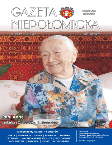 EGZEMPLARZ BEZP£ATNY NR 04 KWIECIEÑ 2009 ISSN 1429-0049 Pani Anna stulatka z Zabierzowa Bocheñskiego Sami piszemy Gazetê: 43 autorów FAKTY | MAGISTRAT | OPINIE | EDUKACJA | KULTURA CZYTELNIA | KWESTIONARIUSZ PROUSTA | WOLONTARIAT MÓJ PORTFEL | ZDROWIE | SPORT | KALENDARIUM W numerze: Idealny czas na inwestycje Wywiad z Beat¹ Kukl¹, szefow¹ Referatu Inwestycji Gminnych i Remontów Dodatek - Trzykropek str. 39 Gazeta Niepołomicka | kwiecień 2009 Młodzieżowe Centrum Kariery oferuje bezpłatne poradnictwo zawodowe indywidualne i grupowe ● Określenie predyspozycji zawodo- wych. ● Pomoc w sporządzaniu dokumentów aplikacyjnych (cv, list motywacyjny). ● Przygotowanie do rozmowy kwalifi- kacyjnej. ● Autoprezentacja i asertywność w miejscu pracy. ● Bilans mocnych i słabych stron. ● Zakładanie własnej firmy. Młodzieżowe Biuro Pracy w Niepołomicach To biuro pośrednictwa pracy dla młodzieży uczącej się, studentów oraz osób bezrobotnych. Wystarczy przyjść do biura i wypełnić ankietę „poszukującego pracy”. Informacja dla pracodawców. Do Młodzieżowego Biura Pracy trafiają osoby poszukujące: ● pracy stałej (absolwenci różnych ty- pów szkół, osoby bezrobotne) ● pracy w czasie wolnym od nauki (ferie, wakacje, weekendy) ● pracy zleconej krótkoterminowej (np. kolportaż, promocje) Święta Wielkanocne to czas odrodzenia. Aby nikomu nie zabrakło wiary w to, że my sami tworzymy swoje szczęście. Marek Ciastoń Przewodniczący Rady Miejskiej Stanisław Kracik Burmistrz Niepołomic Pracodawcy zgłaszający miejsca pracy mogą zrobić to osobiście, telefonicznie lub poprzez e-mail. Istnieje możliwość zorganizowania w naszym biurze giełdy pracy lub rozmowy kwalifikacyjnej z kandydatami do pracy. Biuro nie pobiera opłat od pracodawców i poszukujących pracy! Młodzieżowe Centrum Kariery Młodzieżowe Biuro Pracy w Niepołomicach 32-005 Niepołomice ul. 3 Maja 4 tel/fax: 012 281-37-90 [email protected] str. 1 Gazeta Niepołomicka | kwiecień 2009 Na początek Spis treści FAKTY Pomyślności i 200 lat! | 2 Obwieszczenie o akcji promocyjnej Funty Niepołomickie | 2 Godzina piąta, minut trzydzieści | 2 Czego potrzeba mieszkańcom Boryczowa | 3 Wtrącone trzy grosze | 3 MAGISTRAT Jak to jest? | 4 Nowy portal nie tyle miasta, co jego mieszkańców | 5 Podziękowanie | 5 Idealny czas na inwestycje | 6 Informacja dla przedsiębiorców | 7 OPINIE Kobiety w polityce | 8 43 autorów pisze dla Państwa w tym numerze Gazety Niepołomickiej. Nasze hasło – „Razem piszemy swoją gazetę” – stało się faktem. Czekamy na kolejnych. Łamy Gazety Niepołomickiej są otwarte dla wszystkich, także i dla tych, którzy mają odmienne zdanie. Dziękujemy za uwagi dotyczące nowej formuły Gazety. Wszystkie głosy, i pochwalne, i przede wszystkim krytyczne, są dla nas bardzo ważne. Prosimy Państwa o dalsze opinie. Pomagają nam pracować nad jakością Gazety. Część uwag już uwzględniliśmy, ich autorzy zapewne zauważą je w tym numerze. Pewne elementy sami dołożyliśmy, między innymi tzw. złote myśli. Jedną przytoczę na początek, Billa Cosby’ego: „kluczem do klęski jest chcieć zadowolić wszystkich”. W kwietniowej Gazecie piszemy m.in. o kryzysie, inwestycjach miejskich, zmianach w maturach i egzaminie zawodowym, mediacji, kartach bankowych. Poruszamy temat żółtaczki i zmian w pogotowiu ratunkowym. Przedstawiamy sukcesy Niepołomiczan. Zapraszamy na wydarzenia, zebrane w szczegółowych kalendariach. Zapraszam do lektury. Święta Wielkanocne to czas odrodzenia. Życzymy Państwu, aby nikomu nie zabrakło wiary w to, że to my sami tworzymy swoje szczęście. Artur Negri GAZETA NIEPOŁOMICKA www.gazeta.niepolomice.com Pismo należy do Polskiego Stowarzyszenia Prasy Lokalnej. Nakład: 4000 egz. Wydawca: Urząd Miasta i Gminy w Niepołomicach, Pl. Zwycięstwa 13, 32-005 Niepołomice Adres redakcji: 32-005 Niepołomice, Rynek 8, tel. 012 378 35 01, faks 012 281 19 91, e-mail: [email protected] Redaktor naczelny: Artur Negri Sekretarz redakcji: Joanna Kocot Tekstów niezamówionych redakcja nie zwraca, ponadto zastrzega sobie prawo do skracania artykułów i korespondencji oraz opatrywania ich własnym tytułem. Reklama: 012 281 00 86, 0502 23 43 49 Za treść ogłoszeń i reklam redakcja nie odpowiada. Skład oraz druk: IHG, ul. Kościuszki 47, 32-005 Niepołomice tel. 012 281 00 86, 012 263 72 03, e-mail: [email protected] EDUKACJA Matura i egzamin zawodowy – co nowego? | 9 Zachęcam do gruntownego przeglądu swojego biurka i półek … | 10 II edycja „Szkoły dobrych obyczajów” | 11 Sześciolatki do szkoły! | 11 Marszałek Piłsudski – myśli, idee, czyny | 12 Zakończenie projektu „Szkolenie – Praktyka – Zatrudnienie – Rozwój” | 13 Najlepsi bajkopisarze | 13 Zlot Puchalszczaków | 14 Pięknie powiedziane | 14 Alternatywa dla agresji | 15 Co to są mediacje? | 16 Najpiękniejsze „Ilustracje do utworów Joanny Papuzińskiej” | 16 Ekologiczne powitanie wiosny | 16 Prawdziwy „smak życia” | 17 Egzamin na kartę rowerową | 17 Do przedszkola … czas zapisów | 18 Dzień Otwarty w Hufcu | 18 Z okazji Święta Pań | 18 KULTURA Byłem tylko pomocnikiem Puchalskiego | 19 Puchalski na II Festiwalu Polarnym | 19 Pojechać na grób ojca… | 20 Podróż do Tyduszen | 20 Apokryf Agłai | 21 Zimowe warsztaty chóru Cantata | 21 Na kapliczkowym szlaku | 22 Młodzi filharmonicy na rzecz walki z mukowiscydozą | 23 Gdybym był poetą … | 23 CZYTELNIA Z Felicjanek 10… | 24 Do czytania… | 25 Wykłady historyczne | 25 Kalendarium Biblioteki | 25 KWESTIONARIUSZ Odpowiada Marek Ciastoń | 26 WOLONTARIAT Żyjemy obok siebie, zacznijmy żyć razem | 27 Szukamy wolontariuszy na wakacje! | 27 Kampania parkingowa | 28 Nowa premiera | 28 PORTFEL Karty bankowe, ich rodzaje i główne cechy | 29 ZDROWIE Żółtaczka? A może lepiej się zaszczepić? | 30 Karetka to nie przychodnia na kółkach | 31 SPORT Wielk