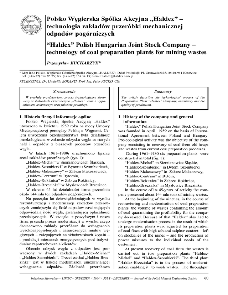 Z N LI IE TOWAR SK TWO PR ÓBKI KOPA ER S ZY Polsko Węgierska Spółka Akcyjna „Haldex” – technologia zakładów przeróbki mechanicznej odpadów pogórniczych PO L “Haldex” Polish Hungarian Joint Stock Company – technology of coal preparation plants for mining wastes Przemysław KUCHARZYK 1) 1) Mgr inż.; Polsko-Węgierska Górnicza Spółka Akcyjna „HALDEX”; Dział Produkcji; Pl. Grunwaldzki 8/10; 40-951 Katowice; tel. (+48-32) 786 95 25; fax. (+48-32) 258 34 13; e-mail:[email protected] RECENZENCI: Dr. Ljudmilla BOKANYI; Prof. Ing. Peter FEČKO, CSc Streszczenie Summary W artykule przedstawiono proces technologiczny stosowany w Zakładach Przeróbczych „Haldex” wraz z wyposażeniem technicznym oraz jakością produkcji. The article describes the technological process of the Preparation Plant “Haldex” Company, machinery and the quality of production. 1. Historia firmy i informacje ogólne Polsko Węgierską Spółkę Akcyjną „Haldex” utworzono w kwietniu 1959 roku na mocy Umowy Międzyrządowej pomiędzy Polską a Węgrami. Celem utworzenia przedsiębiorstwa była działalność proekologiczna w zakresie odzysku węgla ze starych hałd i odpadów z bieżących procesów przeróbki węgla. W latach 1961–1980r uruchomiono łącznie sześć zakładów przeróbczych (rys. 1): „Haldex-Michał” w Siemianowicach Śląskich, „Haldex-Szombierki” w Bytomiu Szombierkach, „Haldex-Makoszowy” w Zabrzu Makoszowach, „Haldex-Centrum” w Bytomiu, „Haldex-Rokitnica” w Zabrzu Rokitnicy, „Haldex-Brzezinka” w Mysłowicach Brzezince. W okresie 45 lat działalności firma przerobiła około 144 mln ton odpadów pogórniczych. Na początku lat dziewięćdziesiątych w wyniku restrukturyzacji i modernizacji zakładów przeróbczych zmniejszyła się ilość odpadów zawierających odpowiednią ilość węgla, gwarantującą opłacalność przedsięwzięcia. W związku z powyższym i nasza firma przeszła proces modernizacji w wyniku czego dostosowano zakłady przeróbcze do wzbogacania wysokozapopielonych i zasiarczonych miałów węglowych – zalegających na składowiskach kopalń – i produkcji mieszanek energetycznych pod indywidualne zapotrzebowania klientów. Obecnie odzysk węgla z odpadów jest prowadzony w dwóch zakładach „Haldex-Michał” i „Haldex-Szombierki”. Trzeci zakład „Haldex-Brzezinka” jest w trakcie modernizacji umożliwiającej wzbogacanie odpadów. Zdolność przerobowa 1. History of the company and general information “Haldex” Polish Hungarian Joint Stock Company was founded in April 1959 on the basis of International Agreement between Poland and Hungary. Pro-ecological activity was the objective of the company consisting in recovery of coal from old heaps and wastes from current coal preparation processes. During 1961–1980 six preparation plants were constructed in total (fig. 1): “Haldex-Michał” in Siemianowice Śląskie, “Haldex-Szombierki” in Bytom Szombierki “Haldex-Makoszowy” in Zabrze Makoszowy, “Haldex-Centrum” in Bytom, “Haldex-Rokitnica” in Zabrze Rokitnica, “Haldex-Brzezinka” in Mysłowice Brzezinka. In the course of its 45-years of activity the company processed about 144 mln tons of mining wastes. At the beginning of the nineties, in the course of restructuring and modernisation of coal preparation plants, the volume of wastes containing the amount of coal quarantining the profitability for the company decreased. Because of that “Haldex” also had to undergo modernisation process in the result of which its preparation plants were adjusted for preparation of coal fines with high ash and sulphur content – left on stockpiles of the mines – and the production of power mixtures to the individual needs of the customers. At present recovery of coal from the wastes is carried out in two preparation plants “HaldexMichał” and “Haldex-Szombierki”. The third plant “Haldex-Brzezinka” is in the process of modernisation enabling it to wash wastes. The throughput Inżynieria Mineralna — LIPIEC – GRUDZIEŃ < 2004 > JULY – DECEMBER — Journal of the Polish Mineral Engineering Society 60 zakładów przeróbczych to 2800 t na dobę na każdy zakład. Powyższe zakłady przystosowane są również do wzbogacania miałów a czas potrzebny na przestawienie technologii to 8 godzin. of preparation plants is 2800 tons per day in each plant. The above mentioned plants are also adjusted to prepare fine coals and the time necessary for re-adjustment of the technology is 8 hours. Z-4 HALDEX CENTRUM Z-2 HALDEX SZOMBIERKI Z-1 HALDEX MICHAŁ HALDEX KATOWICE Z-3 HALDEX MAKOSZOWY Z-5 HALDEX BRZEZINKA Z-6 CARBO KONCENTRAT Rys. 1 Lokalizacja Zakładów Przeróbczych „Haldex” ______________ Fig. 1 The location of “Haldex” Preparation Plants ______________ 2. Opis przeróbki odpadów węglowych i miałów wysokozapopielonych 2. Description of preparation of coal wastes and coal fines with high ash content Odpady węglowe i miały wysokozapopielone dowożone są do zakładów przeróbczych transportem samochodowym lub wagonowym. Samochody rozładowywane są bezpośrednio na placu składowym materiału surowego, a wagony rozładowywane są na lejach rozładunkowych skąd materiał odstawiany jest taśmociągami na plac składowy materiału surowego. Na placu składowym znajdują się leje zasypowe, pod którymi są zamontowane podajniki posuwistozwrotne dozujące materiał surowy na taśmociągi ciągu technologicznego. Ciąg technologiczny składa się z następujących głównych procesów technologicznych: – przygotowanie i klasyfikacja materiału surowego, – wzbogacanie nadawy 20–0mm w hydrocyklonach, – odwadnianie i klasyfikacja produktów wzbogacania, – zagęszczanie i odwadnianie mułów. Materiał surowy dozowany podajnikami posuwistozwrotnymi jest transportowany taśmociągami do stacji przygotowania nadawy (sortowni) gdzie Coal wastes and coal fines with high ash