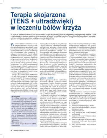 FIZYKOTERAPIA Terapia skojarzona (TENS + ultradźwięki) w leczeniu bólów krzyża W artykule omówiono wyniki oceny skuteczności terapii skojarzonej (przezskórnej elektrycznej stymulacji nerwów TENS + ultradźwięki) w leczeniu bólów krzyża. Oceniano jej wpływ na poziom natężenia dolegliwości bólowych oraz stan funkcjonalny chorych ze zmianami zwyrodnieniowymi kręgosłupa. W ostatnich latach w dziedzinie fizykoterapii powszechna staje się tendencja do kompleksowego oddziaływania przez łączenie różnych zabiegów, głównie w celu intensyfikacji efektu leczniczego dzięki stosowaniu kilku czynników fizykalnych równocześnie. Należy jednak stwierdzić, że nie zawsze istnieją w pełni udokumentowane podstawy naukowe do łączenia ze sobą bodźców fizykalnych i jednoczesnego aplikowania ich na organizm ludzki. Wciąż pozostaje szereg wątpliwości, czy efekt zsumowanego (synergicznego) oddziaływania różnych rodzajów energii jest zasadny i naukowo wiarygodny oraz czy ma istotną klinicznie przewagę w stosunku do tradycyjnego i oddzielnego zastosowania. Terapia skojarzona (prąd elektryczny + ultradźwięki) polega na jednoczesnym zastosowaniu fali dźwiękowej i prądów impulsowych. Wielu autorów twierdzi, że pod wpływem połączonego i wspólnego oddziaływania komponentu fali mechanicznej oraz oddziaływania elektrycznego uzyskuje się w tkankach synergistyczny efekt leczniczy, który ma być znacznie skuteczniejszy niż oddzielne wykonywanie zabiegów. Naszym zdaniem na obecnym Streszczenie W artykule omówiono wyniki oceny skuteczności terapii skojarzonej (TENS + ultradźwięki) we wspomaganiu leczenia pacjentów z chorobą zwyrodnieniową odcinka lędźwiowo-krzyżowego kręgosłupa. Do badań zakwalifikowano 37 chorych, których poddano serii 10 zabiegów terapii skojarzonej. Po zakończeniu leczenia zaobserwowano istotny wpływ zastosowanych zabiegów na zmniejszenie dolegliwości bólowych. Stwierdzono również znaczną poprawę zakresu ruchomości w stawie biodrowym. Słowa kluczowe bóle krzyża, terapia skojarzona, TENS, ultradźwięki 38 REHABILITACJA W PRAKTYCE 4/2008 etapie pogląd ten wydaje się anegdotyczny i wysoce niepewny. Natomiast niewątpliwą korzyścią łącznego wykorzystania ultradźwięków i prądu elektrycznego jest możliwość prowadzenia zabiegu u każdego pacjenta indywidualnie, ponieważ czynnik elektryczny jest aplikowany za pomocą ruchomej głowicy ultradźwiękowej, a nie przy użyciu standardowej elektrody. Dzięki temu bodziec elektroterapeutyczny można doprowadzić do tkanek w sposób dynamiczny, a wykonujący zabieg decyduje, do których struktur zmienionych chorobowo czynniki fizykalne mają być doprowadzone intensywniej, a do których w mniejszym stopniu. Natomiast wykonanie jakiegokolwiek zabiegu elektroterapeutycznego w sposób tradycyjny nie daje takich możliwości. Materiał i metody Badania przeprowadzono z udziałem pacjentów Zakładu Lecznictwa Ambulatoryjnego Poradni Rehabilitacyjnej w Chrzanowie. Do leczenia włączono 37 chorych (29 kobiet, 8 mężczyzn). Wiek pacjentów wynosił średnio 51,35 lat (29-72 lata), masa ciała chorych średnio 72,52 kg (52-95 kg), wzrost średnio 166,75 cm (152-185 cm). Podstawą kwalifikacji było badanie przedmiotowe i podmiotowe oraz analiza wyników badań pomocniczych (RTG, MRI, TK). Badanie przeprowadzono przed rozpoczęciem leczenia i po jego zakończeniu. Osoby poddane badaniom skarżyły się na ból o różnym natężeniu w przebiegu choroby krążka międzykręgowego na poziomie L5-S1 kręgosłupa. Kryteria włączenia i wykluczenia uczestników z badań przedstawia tabela 1. Przeprowadzając badanie, przed zabiegami zwracano uwagę na rozmieszczenie bólu bądź jego promieniowanie. Umiejscowienie dolegliwości przed leczeniem przedstawia tabela 2. Wszystkich chorych poddano zabiegom terapii skojarzonej przy pomocy aparatów Duoter Mini oraz Sonoter firmy Astar-ABR. Na potrzeby badań wymienione generatory zostały ze sobą sprzężone, aby uzyskać urządzenie do terapii skojarzonej. Zabiegi wykonywano raz dziennie, codziennie przez 10 kolejnych dni. Stosowano następujące parametry zabiegowe: – TENS konwencjonalny (czas trwania impulsu – 75 μs, częstotliwość – 100 Hz), – ultradźwięki (fala ciągła – 0,5 W/cm2). Zabiegi wykonywano w pozycji leżącej. Elektrodą czynną była głowica ultradźwiękowa podłączona do bieguna ujemnego (katoda). Natomiast elektroda bierna (anoda) ułożona była na skórze przez mokry podkład. Zabieg prowadzono metodą labilną, gdzie obszarem zabiegowym była okolica promieniowania bólu, tzn. w przypadku promieniowania bólu do lewego pośladka terapia skojarzona wykonywana byłą na tę okolicę, natomiast anoda znajdowała się przykręgosłupowo po stronie przeciwnej. Do zabiegu wykorzystywano żel jako środek sprzęgający. Natężenie prądu było dobierane subiektywnie do odczuć pacjenta – uczucie delikatnego mrowienia, bez efektów ruchowych ze strony mięśni. Czas pojedynczego zabiegu wynosił 30 minut. Wyniki oceniano zarówno metodami subiektywnymi, jak i obiektywnymi. Parametrem subiektywnym było badanie odczucia bólu. Do tego celu wykorzystano skalę VAS (Visual Analogue Scale), która pozwalała na określenie poziomu bólu w 10 stopniach: 0 – brak bólu, 1 – niewielki ból występujący rzadko, 2 – niewielki ból występujący z niewielkimi przerwami, 3 – stały niewielki ból, 4 – stały niewielki ból z okresowymi nasileniami, 5 – stały umiarkowany ból ograniczający sprawność ruchową, 6 – stały umiarkowany ból ograniczający sprawność ruchową z okresowymi nasileniami, 7 – stały ból narastający przy zmianie pozycji ciała, FIZYKOTERAPIA Kryteria włączenia Lokalizacja Odcinek lędźwiowo-krzyżowy Pośladek prawy Pośladek lewy Kończyna dolna prawa do biodra Kończyna dolna lewa do biodra Kończyna dolna prawa do uda Kończyna dolna lewa do uda Ko