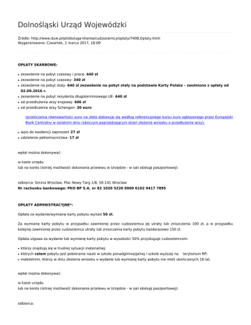 Dolnośląski Urząd Wojewódzki Źródło: http://www.duw.pl/pl/obsluga-klienta/cudzoziemcy/oplaty/7408,Oplaty.html Wygenerowano: Czwartek, 2 marca 2017, 18:09 OPŁATY SKARBOWE: ● zezwolenie na pobyt czasowy i pracę- 440 zł ● zezwolenie na pobyt czasowy- 340 zł ● zezwolenie na pobyt stały- 640 zł zezwolenie na pobyt stały na podstawie Karty Polaka – zwolniono z opłaty od 02.09.2016 r. ● zezwolenie na pobyt rezydenta długoterminowego UE- 640 zł ● od przedłużenia wizy krajowej- 406 zł ● od przedłużenia wizy Schengen- 30 euro (przeliczenia równowartości euro na złote dokonuje się według referencyjnego kursu euro ogłoszonego przez Europejski Bank Centralny w ostatnim dniu roboczym poprzedzającym dzień złożenia wniosku o przedłużenie wizy), ● wpis do ewidencji zaproszeń 27 zł ● udzielenie pełnomocnictwa- 17 zł wpłat można dokonywać: w kasie urzędu lub na konto (istniej możliwość dokonania przelewu w Urzędzie - w sali obsługi paszportowej): odbiorca: Gmina Wrocław, Plac Nowy Targ 1/8, 50-141 Wrocław Nr rachunku bankowego: PKO BP S.A. nr 82 1020 5226 0000 6102 0417 7895 OPŁATY ADMINISTRACYJNE*: Opłata za wydanie/wymianę karty pobytu wynosi 50 zł. Za wymianę karty pobytu w przypadku zawinionej przez cudzoziemca jej utraty lub zniszczenia 100 zł, a w przypadku kolejnej zawinionej przez cudzoziemca utraty lub zniszczenia karty pobytu każdorazowo 150 zł. Opłata ulgowa za wydanie lub wymianę karty pobytu w wysokości 50% przysługuje cudzoziemcom: ● którzy znajdują się w trudnej sytuacji materialnej; ● których celem pobytu jest pobieranie nauki w szkole ponadgimnazjalnej i szkole wyższej na ● małoletnim, którzy w dniu złożenia wniosku o wydanie lub wymianę karty pobytu nie mieli ukończonych 16 lat. wpłat można dokonywać: w kasie urzędu lub na konto (istniej możliwość dokonania przelewu w Urzędzie - w sali obsługi paszportowej): odbiorca: terytorium RP; Dolnośląski Urząd Wojewódzki we Wrocławiu Wydział Organizacji i Rozwoju Nr rachunku bankowego: 42 1010 1674 0000 7122 3100 0000 *podstawa prawna: Rozporządzenia Ministra Spraw Wewnętrznych z dnia 25.04.2014r. w sprawie opłat pobieranych w Rzeczypospolitej Polskiej od cudzoziemców za wydanie i wymianę dokumentów, które mogą być wydawane cudzoziemcom oraz tryby ich uiszczania, (Dz. U. z 2014r., poz. 563) Drukuj Generuj PDF Powiadom znajomego Wstecz liczba wejść: 27612