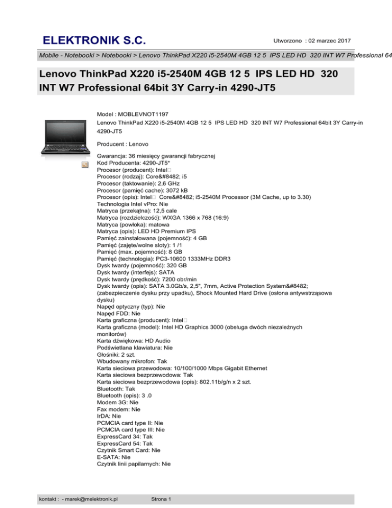 ELEKTRONIK S.C. Utworzono : 02 marzec 2017 Mobile - Notebooki > Notebooki > Lenovo ThinkPad X220 i5-2540M 4GB 12 5 IPS LED HD 320 INT W7 Professional 64 Lenovo ThinkPad X220 i5-2540M 4GB 12 5 IPS LED HD 320 INT W7 Professional 64bit 3Y Carry-in 4290-JT5 Model : MOBLEVNOT1197 Lenovo ThinkPad X220 i5-2540M 4GB 12 5 IPS LED HD 320 INT W7 Professional 64bit 3Y Carry-in 4290-JT5 Producent : Lenovo Gwarancja: 36 miesięcy gwarancji fabrycznej Kod Producenta: 4290-JT5* Procesor (producent): Intel� Procesor (rodzaj): Core™ i5 Procesor (taktowanie): 2,6 GHz Procesor (pamięć cache): 3072 kB Procesor (opis): Intel� Core™ i5-2540M Processor (3M Cache, up to 3.30) Technologia Intel vPro: Nie Matryca (przekątna): 12,5 cale Matryca (rozdzielczość): WXGA 1366 x 768 (16:9) Matryca (powłoka): matowa Matryca (opis): LED HD Premium IPS Pamięć zainstalowana (pojemność): 4 GB Pamięć (zajęte/wolne sloty): 1 /1 Pamięć (max. pojemność): 8 GB Pamięć (technologia): PC3-10600 1333MHz DDR3 Dysk twardy (pojemność): 320 GB Dysk twardy (interfejs): SATA Dysk twardy (prędkość): 7200 obr/min Dysk twardy (opis): SATA 3.0Gb/s, 2,5", 7mm, Active Protection System™ (zabezpieczenie dysku przy upadku), Shock Mounted Hard Drive (osłona antywstrząsowa dysku) Napęd optyczny (typ): Nie Napęd FDD: Nie Karta graficzna (producent): Intel� Karta graficzna (model): Intel HD Graphics 3000 (obsługa dwóch niezależnych monitorów) Karta dźwiękowa: HD Audio Podświetlana klawiatura: Nie Głośniki: 2 szt. Wbudowany mikrofon: Tak Karta sieciowa przewodowa: 10/100/1000 Mbps Gigabit Ethernet Karta sieciowa bezprzewodowa: Tak Karta sieciowa bezprzewodowa (opis): 802.11b/g/n x 2 szt. Bluetooth: Tak Bluetooth (opis): 3 .0 Modem 3G: Nie Fax modem: Nie IrDA: Nie PCMCIA card type II: Nie PCMCIA card type III: Nie ExpressCard 34: Tak ExpressCard 54: Tak Czytnik Smart Card: Nie E-SATA: Nie Czytnik linii papilarnych: Nie kontakt : - [email protected] Strona 1 ELEKTRONIK S.C. Utworzono : 02 marzec 2017 Mobile - Notebooki > Notebooki > Lenovo ThinkPad X220 i5-2540M 4GB 12 5 IPS LED HD 320 INT W7 Professional 64 Lenovo ThinkPad X220 i5-2540M 4GB 12 5 IPS LED HD 320 INT W7 Professional 64bit 3Y Carry-in 4290-JT5 Platforma szyfrująca TPM: Tak Kensington Lock: Tak Display Port: Tak DVI-D: Nie HDMI: Nie VGA (RGB): Tak S-video/TV-out: Nie AV-in (Tuner TV): Nie Line-in: Nie Line-out: Tak Wejście mikrofonu: Tak S/PDIF: Nie LPT (równoległy): Nie RS232 (szeregowy): Nie Moduł GPS: Nie Czytnik kart pamięci: Tak Czytnik kart pamięci (opis): 4-in-1 (SD, SDHC, SDXC, MMC) Panel klawiszy multimedialnych: Nie Złącze replikatora portów: Tak Fire-Wire (IEEE1394): Nie USB 2.0: 3 szt. System operacyjny: Windows 7 Professional 64 bit System operacyjny (wer. Językowa): polski Dodatkowe oprogramowanie: Norton™ Internet Security 2011 ( 30 dni); Skype™ for Windows; Corel� WinDVD� (DVD�RW); Corel Burn.Now™ Lenovo Edition , ThinkVantage System Update; ThinkVantage Power Manager; ThinkVantage Toolbox; Microsoft Office 2010 Starter; Adobe� Reader�; Rescue and Recovery™; Access Connections™; Wbudowana kamera: Tak Wbudowana kamera (opis): HD720p Wbudowana kamera obrotowa: Nie Urządzenie wskazujące: Multitouch Touchpad UltraNav™,TrackPoint Akumulator (technologia): litowo-jonowy 6cell 62.4WHr (Czas pracy do 9h) Akumulator (czas pracy): 9 h Wymiary (wysokość): 19-35 mm Wymiary (szerokość): 305 mm Wymiary (głębokość): 207 mm Waga: 1,5 kg Gwarancja: 36 mies Gwarancja międzynarodowa: Tak Gwarancja baterii: 12 mies Wyposażenie: zasilacz sieciowy 65-watt AC, Karta gwarancyjna, Opcjonalne wyposażenie: stacja dokująca ThinkPad Ultrabase Series 3 (0A33932), napęd w stacji ThinkPad DVD Burner Ultrabay Slim 9,5mm (43N3229), bateria 29++ (9 Cell) (0A36283), Modem WWAN (0A36186) Opis: WWAN Opcja, 2x2 WLAN, Oświetlana klawiatura odporna na zalanie, Obudowa z magnezu Serwis producenta: http://www.lenovo.com/service... Cena : 4.882,40 zł Brutto ( 4.001,97 zł Netto) kontakt : - [email protected] Strona 2 ELEKTRONIK S.C. Utworzono : 02 marzec 2017 Mobile - Notebooki > Notebooki > Lenovo ThinkPad X220 i5-2540M 4GB 12 5 IPS LED HD 320 INT W7 Professional 64 Lenovo ThinkPad X220 i5-2540M 4GB 12 5 IPS LED HD 320 INT W7 Professional 64bit 3Y Carry-in 4290-JT5 Dostępność: Produkt dostępny w naszym sklepie od 23 czerwiec 2012 kontakt : - [email protected] Strona 3
