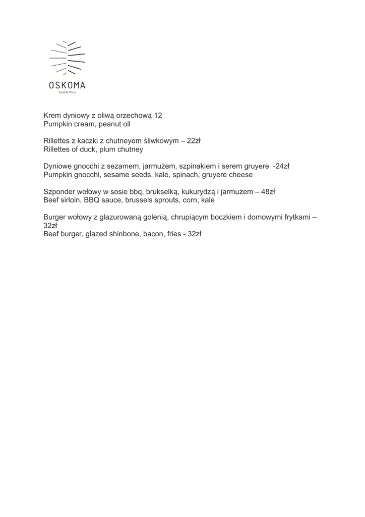 Krem dyniowy z oliwą orzechową 12 Pumpkin cream, peanut oil Rillettes z kaczki z chutneyem śliwkowym – 22zł Rillettes of duck, plum chutney Dyniowe gnocchi z sezamem, jarmużem, szpinakiem i serem gruyere -24zł Pumpkin gnocchi, sesame seeds, kale, spinach, gruyere cheese Szponder wołowy w sosie bbq, brukselką, kukurydzą i jarmużem – 48zł Beef sirloin, BBQ sauce, brussels sprouts, corn, kale Burger wołowy z glazurowaną golenią, chrupiącym boczkiem i domowymi frytkami – 32zł Beef burger, glazed shinbone, bacon, fries - 32zł