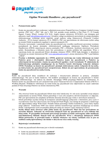 Ogólne Warunki Handlowe „my paysafecard“ Stan na dzień: 10/2013 1. Postanowienia ogólne 1.1. Konto my paysafecard jest wydawane i administrowane przez Prepaid Services Company Limited (zwaną poniżej „PSC Ltd.“, „PSC“ lub „my“). PSC Ltd. posiada swoją siedzibę w Part Floor 27, 25 Canada Square, Canary Wharf, London E14 5LQ, Anglia (numer rejestrowy 05761861), jest dostępna pod adresem e-mail [email protected] i świadczy usługi na podstawie pozwolenia na emisje pieniądza elektronicznego wydanego przez angielski urząd nadzoru usług finansowych (Financial Conduct Authority - FCA) (numer rejestrowy FCA: 900021). PSC jest upoważnione do oferowania tychże usług na terenie Polski na podstawie regulacji w sprawie paszportu UE. Otwarcie, korzystanie i zamykanie konta my paysafecard oraz wszelkie możliwości powrotnej wymiany posiadanych na koncie pieniędzy elektronicznych podlegają niniejszym Ogólnym Warunkom Handlowym (OWH) stanowiącym umowę pomiędzy PSC a Klientem. Językiem umownym jest język polski. Komunikacja z Klientem może być prowadzona w języku polskim lub angielskim. Wraz z rejestracją konta my paysafecard Klient akceptuje niniejsze OWH. OWH będą dostępne w aktualnym brzmieniu na stronie internetowej PSC www.paysafecard.com/pl („strona internetowa PSC”) pod linkiem „OWH”. Prosimy o dokładne zapoznanie się z OWH, ponieważ zawierają one ważne informacje na temat Państwa praw i obowiązków dotyczących Państwa konta my paysafecard, a Państwo są zobowiązani do korzystania z konta my paysafecard zgodnie z tymi warunkami. W odniesieniu do elektronicznego pieniądza znajdującego się na Państwa koncie obowiązują wyłącznie niniejsze OWH. Posiadany na koncie my paysafecard pieniądz elektroniczny należy wyłącznie do tej osoby, na którą konto my paysafecard jest zarejestrowane. Klient nie jest upoważniony do przenoszenia konta my paysafecard na osobę trzecią. 1.2. 1.3. Uwaga: Konto my paysafecard służy zasadniczo do realizacji i otrzymywania płatności za pomocą pieniądza elektronicznego. Nie jest to konto bankowe. Od środków posiadanych na koncie my paysafecard w formie pieniądza elektronicznego nie nalicza się odsetek. Akceptując OWH przyjmują Państwo do wiadomości, że Państwa konto my paysafecard nie jest zarejestrowane przez Financial Services Compensation Scheme (FSCS) w Wielkiej Brytanii. Dodatkowe informacje na temat konta my paysafecard oraz odpowiedzi na często zadawane pytania (FAQ) otrzymają Państwo na stronie internetowej PSC. 2. Warunki 2.1. Aby otworzyć konto my paysafecard, Klient musi mieć ukończony 16. rok życia i posiadać swoje miejsce zamieszkania na terenie Polski. Klient potrzebuje w tym celu urzędowy dowód tożsamości ze zdjęciem. PSC jest upoważnione do zażądania od Klienta okazania dowodu jego wieku w dowolnym momencie. Klient potrzebuje uzyskać dostęp do komputera umożliwiającego połączenie z Internetem, przy czym w wyszukiwarce musi być aktywowany Java-Script lub Flash Plugin, oraz dostęp do programu e-mailowego lub odpowiedniej usługi Web-Client. Ponadto Klient potrzebuje telefon komórkowy, przez który będzie mógł odbierać wiadomości SMS oraz numer telefonu komórkowego operatora działającego na terenie Polski. Udostępnienie tych (ewentualnie płatnych) usług nie stanowi części niniejszej Umowy. Każdy Klient może otworzyć tylko jedno konto my paysafecard. Musi ono być prowadzone na nazwisko Klienta. Zabrania się otwierania kolejnych kont my paysafecard na rzecz Klienta lub innej osoby. W przypadku naruszenia powyższego przepisu wyraźnie zastrzegamy sobie możliwość natychmiastowej blokady danych kont my paysafecard. Wraz z akceptacją niniejszych OWH Klient potwierdza, że prowadzi konto w imieniu własnym i na własny rachunek oraz że jest on osobiście osobą upoważnioną i nie działa w ukryciu na rzecz osoby trzeciej. 2.2. 2.3. 3. Rejestracja i uruchomienie 3.1. Konto my paysafecard oferowane jest w dwóch wariantach: • konto my paysafecard o statusie „standard“ • konto my paysafecard o statusie „unlimited“ 1 3.2. 3.2.1. 3.2.2. 3.2.3. 3.2.4. 3.3. 3.3.1. 3.3.2. 3.3.3. Rejestracja konta my paysafecard o statusie „standard“: Rejestracja online: W celu założenia konta my paysafecard konieczna jest jednorazowa rejestracja online na stronie internetowej PSC. Przy rejestracji Klient jest zobowiązany do podania prawdziwych danych. PSC jest upoważnione do zażądania dowodów tożsamości Klienta i jego miejsca zamieszkania, a także innych dokumentów potwierdzających dane konieczne do rejestracji. W ramach rejestracji klient zostanie poproszony do wybrania nazwy użytkownika i podania hasła. Dla własnego dobra Klient powinien utrzymywać te dane w tajemnicy przed osobami trzecimi (patrz w szczególności punkt 9). Zawarcie Umowy: Poprzez wysłanie formularza rejestracji online Klient przekazuje PSC ofertę zawarcia Umowy na podstawie niniejszych OWH. PSC weryfikuje dane wprowadzone przy rejestracji, przy czym do Klienta na numer telefonu komórkowego podany na formularzu rejestracji online zostaje wysłany SMS-em kod. Po wprowadzeniu prawidłowego kodu na stronie internetowej PSC i pomyślnej weryfikacji wszystkich danych Klient otrzymuje e-mail, w którym jego oferta zostaje przyjęta. Aktywacja konta my paysafecard: Wraz z przyjęciem oferty zawarcia Umowy, Klient otrzymuje link potwierdzający do aktywacji konta my paysafecard o statucie „standard”. Limity: Dla konta my paysafecard o statusie „standard“ dla doładowań (zgodnie z punktem 4. i 6.) przewidziano limity transakcyjne (punkt 5) w wysokości 9.000 PLN w każdym roku kalendarzowym. Obowiązuje maksymalny limit środków posiadanych na koncie w wysokości 9.000 PLN. Rejestracja konta my paysafecard o statusie „unlimited“: Aktualizacja: Dla transakcji wykraczających ponad limity określone w punkcie 3.2.4 konieczna jest aktualizacja kont