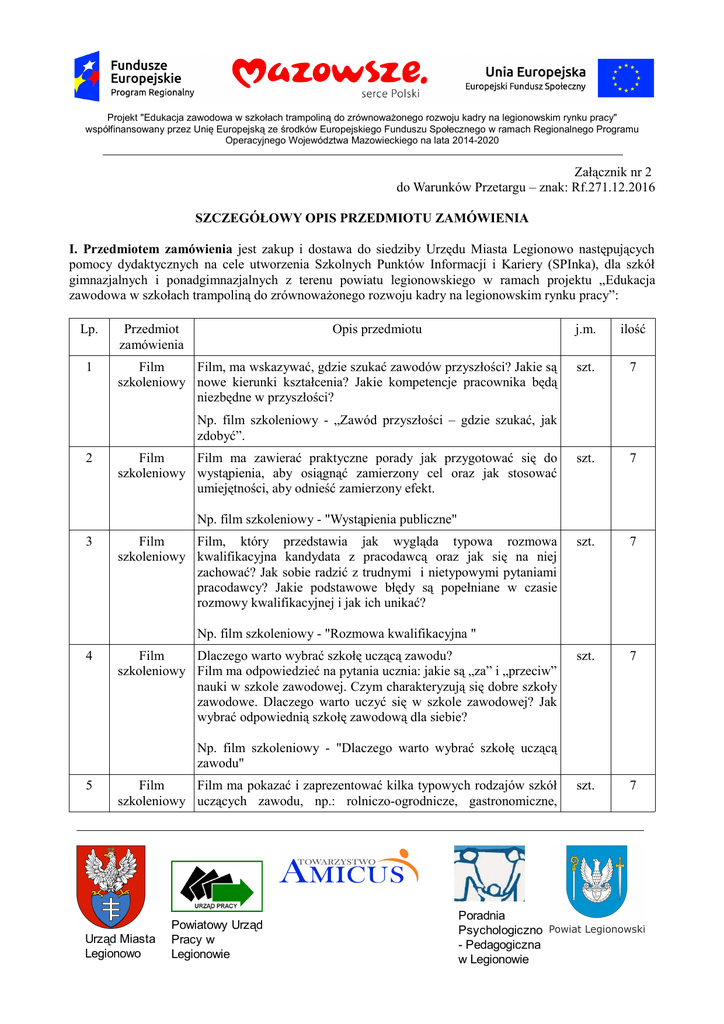 Projekt "Edukacja zawodowa w szkołach trampoliną do zrównoważonego rozwoju kadry na legionowskim rynku pracy" współfinansowany przez Unię Europejską ze środków Europejskiego Funduszu Społecznego w ramach Regionalnego Programu Operacyjnego Województwa Mazowieckiego na lata 2014-2020 Załącznik nr 2 do Warunków Przetargu – znak: Rf.271.12.2016 SZCZEGÓŁOWY OPIS PRZEDMIOTU ZAMÓWIENIA I. Przedmiotem zamówienia jest zakup i dostawa do siedziby Urzędu Miasta Legionowo następujących pomocy dydaktycznych na cele utworzenia Szkolnych Punktów Informacji i Kariery (SPInka), dla szkół gimnazjalnych i ponadgimnazjalnych z terenu powiatu legionowskiego w ramach projektu „Edukacja zawodowa w szkołach trampoliną do zrównoważonego rozwoju kadry na legionowskim rynku pracy”: Lp. 1 Przedmiot zamówienia Opis przedmiotu Film Film, ma wskazywać, gdzie szukać zawodów przyszłości? Jakie są szkoleniowy nowe kierunki kształcenia? Jakie kompetencje pracownika będą niezbędne w przyszłości? j.m. ilość szt. 7 szt. 7 szt. 7 szt. 7 szt. 7 Np. film szkoleniowy - „Zawód przyszłości – gdzie szukać, jak zdobyć”. 2 Film Film ma zawierać praktyczne porady jak przygotować się do szkoleniowy wystąpienia, aby osiągnąć zamierzony cel oraz jak stosować umiejętności, aby odnieść zamierzony efekt. Np. film szkoleniowy - "Wystąpienia publiczne" 3 Film Film, który przedstawia jak wygląda typowa rozmowa szkoleniowy kwalifikacyjna kandydata z pracodawcą oraz jak się na niej zachować? Jak sobie radzić z trudnymi i nietypowymi pytaniami pracodawcy? Jakie podstawowe błędy są popełniane w czasie rozmowy kwalifikacyjnej i jak ich unikać? Np. film szkoleniowy - "Rozmowa kwalifikacyjna " 4 Film Dlaczego warto wybrać szkołę uczącą zawodu? szkoleniowy Film ma odpowiedzieć na pytania ucznia: jakie są „za” i „przeciw” nauki w szkole zawodowej. Czym charakteryzują się dobre szkoły zawodowe. Dlaczego warto uczyć się w szkole zawodowej? Jak wybrać odpowiednią szkołę zawodową dla siebie? Np. film szkoleniowy - "Dlaczego warto wybrać szkołę uczącą zawodu" 5 Film Film ma pokazać i zaprezentować kilka typowych rodzajów szkół szkoleniowy uczących zawodu, np.: rolniczo-ogrodnicze, gastronomiczne, Urząd Miasta Legionowo Powiatowy Urząd Pracy w Legionowie Poradnia Psychologiczno - Pedagogiczna w Legionowie Projekt "Edukacja zawodowa w szkołach trampoliną do zrównoważonego rozwoju kadry na legionowskim rynku pracy" współfinansowany przez Unię Europejską ze środków Europejskiego Funduszu Społecznego w ramach Regionalnego Programu Operacyjnego Województwa Mazowieckiego na lata 2014-2020 mechaniczne, budowlane, elektryczno-elektroniczne, regionalne i inne. Np. film szkoleniowy - "Kalejdoskop szkół uczących zawodu" 6 Program Test, który ma pomóc odpowiedzieć na pytania: jakie są komputerowy dominujące cechy osobowości zawodowej osoby badanej, jaki rodzaj i styl pracy lubi, jaki rodzaj kontaktów interpersonalnych w różnych sytuacjach społecznych preferuje. Osoba badana (uczeń szkoły gimnazjalnej i ponadgimnazjalnej) ma się dowiedzieć, które z opisanych rodzajów preferencji zawodowych (przedmiotowe, społeczne, przedsiębiorcze, twórcze, wykonawcze, analityczne) są u niej dominujące i w jakich sytuacjach zawodowych prognozują one efektywną adaptację oraz odniesienie sukcesu. szt. 7 szt. 7 szt. 7 Np. program komputerowy: "Test kariery – preferencji i predyspozycji zawodowych". Licencja nie mniej niż na 2 lata i nie mniej niż na 2 stanowiska komputerowe w obrębie tylko jednej lokalizacji nabywcy. 7 Program Test, który będzie narzędziem umożliwiającym uczniom klas komputerowy gimnazjalnych i ponadgimnazjalnych samodzielne poznanie i sklasyfikowanie własnych zainteresowań dotyczących wyboru przyszłego zawodu. Wyniki uzyskane w kilku skalach zainteresowań mają być podstawą do opracowania indywidualnej ścieżki edukacyjnej i kariery zawodowej i będą stanowić podstawę do rozmowy i wsparcia ze strony doradcy zawodowego Np. program komputerowy: "Test Samoocena zainteresowań zawodowych" Licencja nie mniej niż na 2 lata i nie mniej niż na 2 stanowiska komputerowe w obrębie tylko jednej lokalizacji nabywcy. 8 Program Test, który będzie narzędziem pozwalającym na samodzielne komputerowy poznanie własnych kompetencji (umiejętności), niezbędnych do skutecznego planowania i realizowania kariery edukacyjno – zawodowej. Wynik testu ma pomóc uświadomić uczniom, jakie kompetencje przyszłości (myślenie twórcze, efektywne zarządzanie czasem, myślenie logiczne, umiejętność ciągłego doskonalenia swojej wiedzy i umiejętności, obsługa komputera) to mocne filary, które pomogą odnieść sukces, a które należy Urząd Miasta Legionowo Powiatowy Urząd Pracy w Legionowie Poradnia Psychologiczno - Pedagogiczna w Legionowie Projekt "Edukacja zawodowa w szkołach trampoliną do zrównoważonego rozwoju kadry na legionowskim rynku pracy" współfinansowany przez Unię Europejską ze środków Europejskiego Funduszu Społecznego w ramach Regionalnego Programu Operacyjnego Województwa Mazowieckiego na lata 2014-2020 doskonalić od najmłodszych lat, by stały się solidną podstawą kariery zawodowej. Np. program komputerowy:Test "Kompetencjie – filary sukcesu" Licencja nie mniej niż na 2 lata i nie mniej niż na 2 stanowiska komputerowe w obrębie tylko jednej lokalizacji nabywcy 9 Program Program ma analizować zagadnienia związane z trudną sztuką komputerowy wyboru zawodu oraz zawierać informacje dotyczące rynku pracy, zmian na nim zachodzących oraz tendencji rozwojowych. Dzięki temu programowi uczniowie będą mogli zapoznać się z branżami zawodowymi oraz wybranymi zawodami. W programie mają znaleźć się także informacje niezbędne do budowania własnej ścieżki rozwoju, kształtowania kompetencji zawodowych, zdobywania doświadczeń oraz skutecznego poszukiwania pr