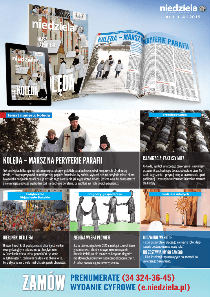 niedziela T Y G O D N nr 1 K K A T KOLĘDA – MARSZ NA PERYFERIE PARAFII Tuż po świętach Bożego Narodzenia rozpoczął się w polskich parafiach czas wizyt kolędowych. „Trudno się dziwić, że kolęda przywodzi na myśl prośbę papieża Franciszka, by Kościół wyszedł dziś na peryferie miast, skoro blokowiska miejskich parafii pasują dziś do tego określenia jak nigdy dotąd. Chodzi jeszcze o to, by duszpasterze z nie mniejszą odwagą wychodzili dziś na duchowe peryferie, by spotkać na nich swoich parafian...”. L I C K I 4 I 2015 prognozy gospodarcze ISLAMIZACJA: FAKT CZY MIT? Al-Kaida, symbol światowego terroryzmu i największy przeciwnik zachodniego świata, odeszła w cień. Na czoło zagrożenia – przynajmniej w przekonaniu opinii publicznej – wysunęło się Państwo Islamskie, również dla Europy. niedziela mlodych KIERUNEK: BETLEJEM ZIELONA WYSPA PŁOWIEJE ODDZWONIĘ WKRÓTCE... Orszak Trzech Króli podbija nasze ulice i jest wielkim ewangelizacyjnym sukcesem. W ubiegłym roku w Orszakach wzięło udział ponad 600 tys. osób w 180 miastach. Zadaniem na dziś jest dbanie o to, by 6 stycznia na trwałe miał chrześcijański charakter. Już w pierwszej połowie 2015 r. nastąpi spowolnienie gospodarcze. I choć w nowym roku recesja nie dotknie Polski, to nie ma też co liczyć na złagodzenie głównych problemów społeczno-ekonomicznych. A na horyzoncie są już nowe wyzwania. NIE ZOSTAWIAJMY GO SAMEGO ZAMÓW O prześladowania temat numeru: kolęda świątecznie Objawienie Pańskie I – czyli przewrotnie: dlaczego nie warto robić dziejowych postanowień na nowy rok ;) – kilka inspiracji zapraszających do adoracji Najświętszego Sakramentu PRENUMERATĘ (34 324-36-45) WYDANIE CYFROWE (e.niedziela.pl) Zapraszamy do lektury „Niedzieli” nr 1 na 4 stycznia 2015 r. Proponujemy m.in. artykuły: Temat numeru: Kolęda Kolęda – marsz na peryferie parafii Tuż po świętach Bożego Narodzenia rozpoczął się w polskich parafiach czas wizyt kolędowych. „Trudno się dziwić, że kolęda przywodzi na myśl prośbę papieża Franciszka, by Kościół wyszedł dziś na peryferie miast, skoro blokowiska miejskich parafii pasują dziś do tego określenia jak nigdy dotąd. Chodzi jeszcze o to, by duszpasterze z nie mniejszą odwagą wychodzili dziś na duchowe peryferie, by spotkać na nich swoich parafian...”. Słuchajmy sumienia, a nie religii medialnej „Kościół nie chce być żadną siłą polityczną, nie chce stawać po jednej stronie przeciwko drugiej. Kościół chce być wspólnotą ludzi modlących się i tym samym odpowiedzialnych w sumieniu przed Bogiem za siebie i za innych” – mówił abp Wacław Depo w homilii na Jasnej Górze 13 grudnia 2014 r., w rocznicę stanu wojennego. Tekst homilii został wydrukowany w „Niedzieli”. Islamizacja: fakt czy mit? Al-Kaida, symbol światowego terroryzmu i największy przeciwnik zachodniego świata, odeszła w cień. Na czoło zagrożenia – przynajmniej w przekonaniu opinii publicznej – wysunęło się Państwo Islamskie, również dla Europy. Tam pokój zawsze był najważniejszy Jerozolima i Betlejem to dwa ogromnie ważne dla chrześcijan miejsca w Ziemi Świętej. Właśnie tam polskie siostry elżbietanki prowadzą sierocińce dla dzieci dotkniętych traumą i bolesnymi skutkami wojny w najbardziej obfitym w konflikty miejscu na świecie – w ojczyźnie Chrystusa. Kierunek: Betlejem Orszak Trzech Króli podbija nasze ulice i jest wielkim ewangelizacyjnym sukcesem. W ubiegłym roku w Orszakach wzięło udział ponad 600 tys. osób w 180 miastach. Zadaniem na dziś jest dbanie o to, by 6 stycznia na trwałe miał chrześcijański charakter. Zielona wyspa płowieje Już w pierwszej połowie 2015 r. nastąpi spowolnienie gospodarcze. I choć w nowym roku recesja nie dotknie Polski, to nie ma też co liczyć na złagodzenie głównych problemów społeczno-ekonomicznych. A na horyzoncie są już nowe wyzwania. Onkologia czy science fiction? Pakiet onkologiczny ma od grudnia 2014 r. swój spot reklamowy w telewizji, przygotowany przez Ministerstwo Zdrowia, i swoje logo. Jednak czy naprawdę wejdzie z początkiem 2015 r., nie jest takie pewne. Na papierze może tak, w praktyce będzie różnie, bo znaczna część środowisk lekarskich uznała pakiet za science fiction, PR i onkologię polityczną. W „Niedzieli Młodych”: * ODDZWONIĘ WKRÓTCE... – czyli przewrotnie: dlaczego nie warto robić dziejowych postanowień na nowy rok ;) * NIE ZOSTAWIAJMY GO SAMEGO – kilka inspiracji zapraszających do adoracji Najświętszego Sakramentu.