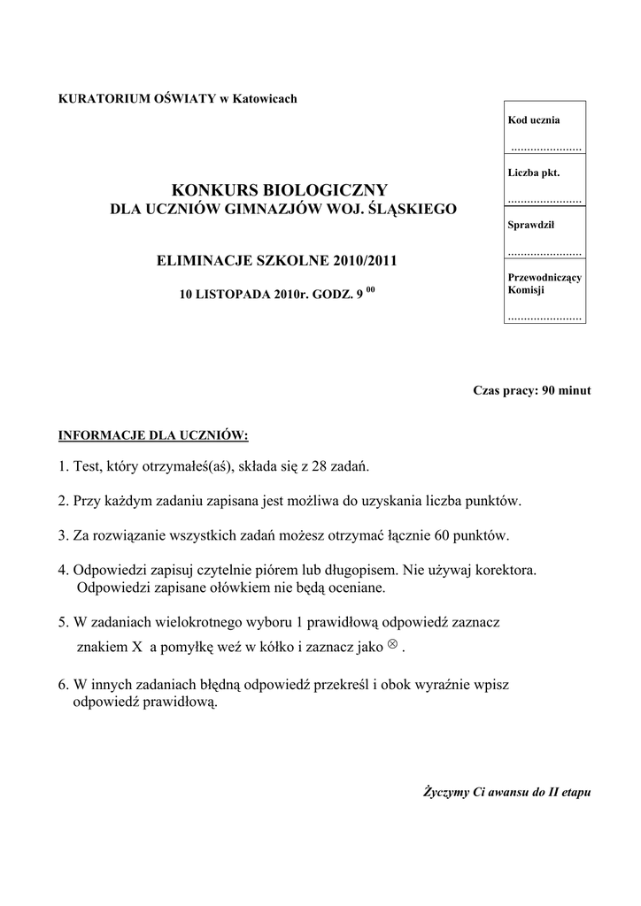 KURATORIUM OŚWIATY w Katowicach Kod ucznia ...................... Liczba pkt. KONKURS BIOLOGICZNY ....................... DLA UCZNIÓW GIMNAZJÓW WOJ. ŚLĄSKIEGO Sprawdził ....................... ELIMINACJE SZKOLNE 2010/2011 10 LISTOPADA 2010r. GODZ. 9 Przewodniczący Komisji 00 ....................... Czas pracy: 90 minut INFORMACJE DLA UCZNIÓW: 1. Test, który otrzymałeś(aś), składa się z 28 zadań. 2. Przy każdym zadaniu zapisana jest możliwa do uzyskania liczba punktów. 3. Za rozwiązanie wszystkich zadań możesz otrzymać łącznie 60 punktów. 4. Odpowiedzi zapisuj czytelnie piórem lub długopisem. Nie używaj korektora. Odpowiedzi zapisane ołówkiem nie będą oceniane. 5. W zadaniach wielokrotnego wyboru 1 prawidłową odpowiedź zaznacz znakiem X a pomyłkę weź w kółko i zaznacz jako ⊗ . 6. W innych zadaniach błędną odpowiedź przekreśl i obok wyraźnie wpisz odpowiedź prawidłową. Życzymy Ci awansu do II etapu Zadanie 1. ( 0–1 pkt ) Schemat przedstawia budowę komórki roślinnej. Podaj nazwę i oznaczenie literowe struktury zawierającej największą ilość DNA. …………………………………………………………………………………………………. Zadanie 2. ( 0–2 pkt.) W widocznej na rysunku strukturze komórkowej (organellum) odbywa się proces wytwarzania energii. Duża liczba tych organelli występuje np. w komórkach serca. a) Nazwij przedstawione na rysunku organellum. ............................................................................................ b) Podkreśl jedno prawidłowe zdanie. Duża liczba tych organelli jest związana z funkcją zapasową komórek serca. Duża liczba tych organelli jest związana z funkcją wydalniczą komórek serca. Duża liczba tych organelli jest związana z rytmicznymi skurczami komórek serca. Duża liczba tych organelli jest związana z intensywnymi podziałami komórek serca. -1- Zadanie 3. (0–2 pkt.) Na schemacie zaznaczono kość, która stanowi jeden z odcinków kręgosłupa człowieka. Podaj nazwę oraz funkcję wskazanej kości. nazwa kości: ………………………………………………………………………………………… funkcja: ……………………………………………………………………………………………….. Zadanie 4. ( 0–2 pkt.) Bezpieczne korzystanie z promieni słonecznych ma szczególne znaczenie dla młodych, rozwijających się organizmów dzieci, gdyż jest niezbędne do prawidłowego przebiegu procesu kostnienia. Nadmierne przebywanie na słońcu powoduje zwiększenie produkcji melaniny, co skutkuje zmianą zabarwienia skóry. a) Wyjaśnij, w jaki sposób promieniowanie słoneczne działa przeciwkrzywiczo. …………………………………………………………………………………………………………… …………………………………………………………………………………………………………… b) Wyjaśnij, jakie znaczenie ma obecność melaniny w skórze. …………………………………………………………………………………………………………. ………………………………………………………………………………………………………….. -2- Zadanie 5. ( 0–2 pkt.) Do korzenia włosa przyczepione są mięśnie zwane stroszycielami włosa. W niektórych sytuacjach, np. pod wpływem silnych przeżyć psychicznych, może nastąpić skurcz tych mięśni. Wówczas na skórze pojawia się tzw. gęsia skórka i włosy ulegają nastroszeniu. Nazwij rodzaj tkanki mięśniowej, która tworzy mięśnie stroszące włos. Odpowiedź uzasadnij odpowiednim argumentem. rodzaj tkanki mięśniowej: ………………………………………………………………………….. uzasadnienie: ……………………………………………………………………………………… ……………………………………………………………………………………………………… Zadanie 6. ( 0 –3 pkt.) Budowa tkanek mięśniowych jest ściśle połączona z ich funkcją. Wymień trzy cechy budowy wspólne dla prezentowanych tkanek mięśniowych widoczne na rysunku. 1…………………………………………………………………………………………………… 2…………………………………………………………………………………………………….. 3……………………………………………………………………………………………………. Zadanie 7. ( 0–2 pkt.) Środki anaboliczne stosuje się w medycynie między innymi w przypadku dystrofii mięśniowej ( zanik mięśni). Stosowanie tych środków przez osoby zdrowe w celu przyrostu masy mięśniowej jest niebezpieczne dla zdrowia i życia człowieka. Wymień dwa negatywne skutki stosowania takich środków anabolicznych dla układu ruchu zdrowego człowieka. 1…………………………………………………………………………………………………… 2…………………………………………………………………………………………………… -3- Zadanie 8. ( 0–1 pkt ) Przeczytaj informację. Ten pierwiastek jest bardzo rozpowszechniony w przyrodzie, może występować w wodzie, glebie, roślinach i innych organizmach żywych. W przypadku nadmiaru tego pierwiastka występuje cętkowanie szkliwa nazębnego, przy niedoborze rozwija się próchnica zębów. Podaj nazwę opisanego pierwiastka. ………………………………………………………………………………… Zadanie 9. ( 0–3 pkt) Schemat przedstawia wzór zębowy dorosłego człowieka. 3 2 3 2 1 2 2 1 2 3 1 2 2 1 2 3 a) Podaj, jaki rodzaj zębów oznaczają cyfry 1 oraz 3, powtarzające się w każdej z czterech części wzoru zębowego. 1……………………………….. 3………………………………….