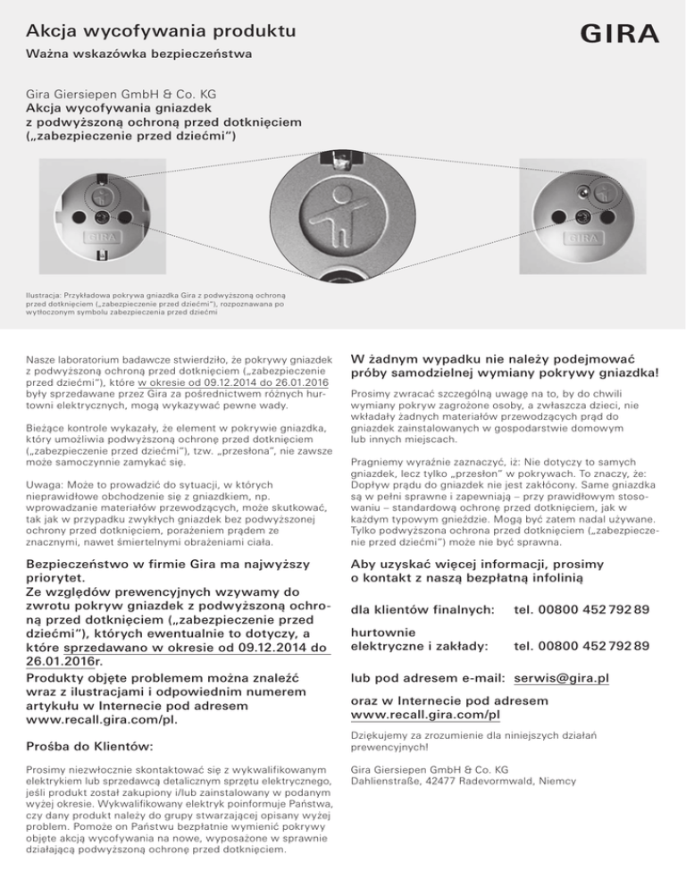Akcja wycofywania produktu Ważna wskazówka bezpieczeństwa Gira Giersiepen GmbH & Co. KG Akcja wycofywania gniazdek z podwyższoną ochroną przed dotknięciem („zabezpieczenie przed dziećmi“) Ilustracja: Przykładowa pokrywa gniazdka Gira z podwyższoną ochroną przed dotknięciem („zabezpieczenie przed dziećmi“), rozpoznawana po wytłoczonym symbolu zabezpieczenia przed dziećmi Nasze laboratorium badawcze stwierdziło, że pokrywy gniazdek z podwyższoną ochroną przed dotknięciem („zabezpieczenie przed dziećmi“), które w okresie od 09.12.2014 do 26.01.2016 były sprzedawane przez Gira za pośrednictwem różnych hurtowni elektrycznych, mogą wykazywać pewne wady. Bieżące kontrole wykazały, że element w pokrywie gniazdka, który umożliwia podwyższoną ochronę przed dotknięciem („zabezpieczenie przed dziećmi“), tzw. „przesłona”, nie zawsze może samoczynnie zamykać się. Uwaga: Może to prowadzić do sytuacji, w których nieprawidłowe obchodzenie się z gniazdkiem, np. wprowadzanie materiałów przewodzących, może skutkować, tak jak w przypadku zwykłych gniazdek bez podwyższonej ochrony przed dotknięciem, porażeniem prądem ze znacznymi, nawet śmiertelnymi obrażeniami ciała. Bezpieczeństwo w firmie Gira ma najwyższy priorytet. Ze względów prewencyjnych wzywamy do zwrotu pokryw gniazdek z podwyższoną ochroną przed dotknięciem („zabezpieczenie przed dziećmi“), których ewentualnie to dotyczy, a które sprzedawano w okresie od 09.12.2014 do 26.01.2016r. Produkty objęte problemem można znaleźć wraz z ilustracjami i odpowiednim numerem artykułu w Internecie pod adresem www.recall.gira.com/pl. Prośba do Klientów: Prosimy niezwłocznie skontaktować się z wykwalifikowanym elektrykiem lub sprzedawcą detalicznym sprzętu elektrycznego, jeśli produkt został zakupiony i/lub zainstalowany w podanym wyżej okresie. Wykwalifikowany elektryk poinformuje Państwa, czy dany produkt należy do grupy stwarzającej opisany wyżej problem. Pomoże on Państwu bezpłatnie wymienić pokrywy objęte akcją wycofywania na nowe, wyposażone w sprawnie działającą podwyższoną ochronę przed dotknięciem. W żadnym wypadku nie należy podejmować próby samodzielnej wymiany pokrywy gniazdka! Prosimy zwracać szczególną uwagę na to, by do chwili w ymiany pokryw zagrożone osoby, a zwłaszcza dzieci, nie wkładały żadnych materiałów przewodzących prąd do gniazdek zainstalowanych w gospodarstwie domowym lub innych miejscach. Pragniemy wyraźnie zaznaczyć, iż: Nie dotyczy to samych gniazdek, lecz tylko „przesłon” w pokrywach. To znaczy, że: Dopływ prądu do gniazdek nie jest zakłócony. Same gniazdka są w pełni sprawne i zapewniają – przy prawidłowym stosowaniu – standardową ochronę przed dotknięciem, jak w każdym typowym gnieździe. Mogą być zatem nadal używane. Tylko podwyższona ochrona przed dotknięciem („zabezpieczenie przed dziećmi”) może nie być sprawna. Aby uzyskać więcej informacji, prosimy o kontakt z naszą bezpłatną infolinią dla klientów finalnych: tel. 00800 452 792 89 hurtownie elektryczne i zakłady: tel. 00800 452 792 89 lub pod adresem e-mail: [email protected] oraz w Internecie pod adresem www.recall.gira.com/pl Dziękujemy za zrozumienie dla niniejszych działań p rewencyjnych! Gira Giersiepen GmbH & Co. KG Dahlienstraße, 42477 Radevormwald, Niemcy