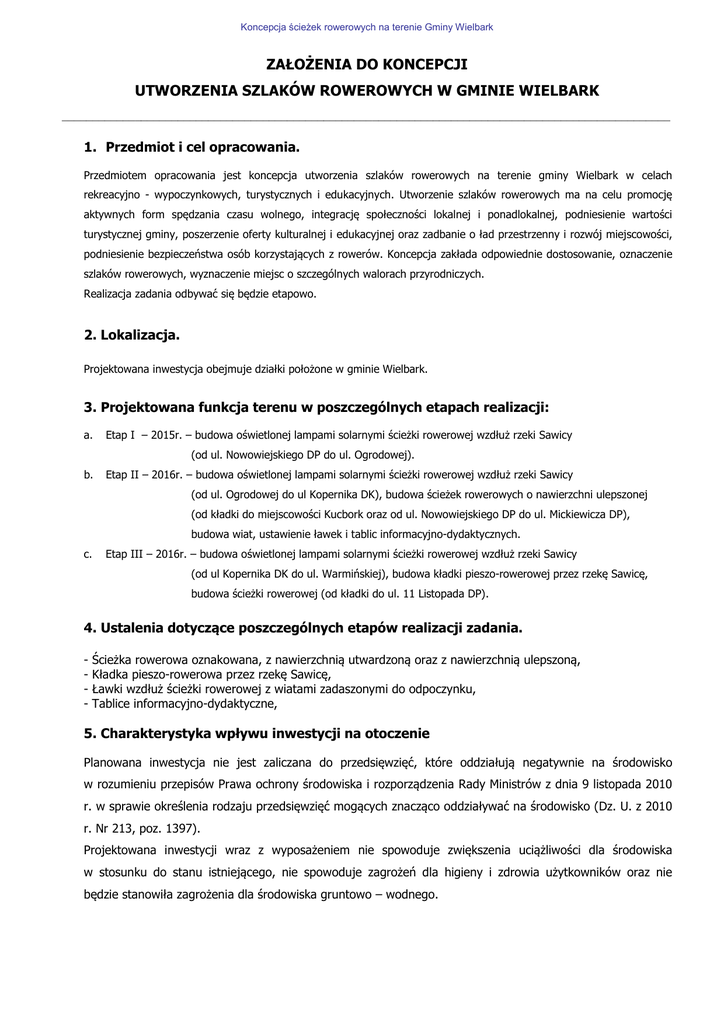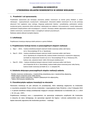 Koncepcja ścieżek rowerowych na terenie Gminy Wielbark ZAŁOŻENIA DO KONCEPCJI UTWORZENIA SZLAKÓW ROWEROWYCH W GMINIE WIELBARK ____________________________________________________________________________________________________ 1. Przedmiot i cel opracowania. Przedmiotem opracowania jest koncepcja utworzenia szlaków rowerowych na terenie gminy Wielbark w celach rekreacyjno - wypoczynkowych, turystycznych i edukacyjnych. Utworzenie szlaków rowerowych ma na celu promocję aktywnych form spędzania czasu wolnego, integrację społeczności lokalnej i ponadlokalnej, podniesienie wartości turystycznej gminy, poszerzenie oferty kulturalnej i edukacyjnej oraz zadbanie o ład przestrzenny i rozwój miejscowości, podniesienie bezpieczeństwa osób korzystających z rowerów. Koncepcja zakłada odpowiednie dostosowanie, oznaczenie szlaków rowerowych, wyznaczenie miejsc o szczególnych walorach przyrodniczych. Realizacja zadania odbywać się będzie etapowo. 2. Lokalizacja. Projektowana inwestycja obejmuje działki położone w gminie Wielbark. 3. Projektowana funkcja terenu w poszczególnych etapach realizacji: a. Etap I – 2015r. – budowa oświetlonej lampami solarnymi ścieżki rowerowej wzdłuż rzeki Sawicy (od ul. Nowowiejskiego DP do ul. Ogrodowej). b. Etap II – 2016r. – budowa oświetlonej lampami solarnymi ścieżki rowerowej wzdłuż rzeki Sawicy (od ul. Ogrodowej do ul Kopernika DK), budowa ścieżek rowerowych o nawierzchni ulepszonej (od kładki do miejscowości Kucbork oraz od ul. Nowowiejskiego DP do ul. Mickiewicza DP), budowa wiat, ustawienie ławek i tablic informacyjno-dydaktycznych. c. Etap III – 2016r. – budowa oświetlonej lampami solarnymi ścieżki rowerowej wzdłuż rzeki Sawicy (od ul Kopernika DK do ul. Warmińskiej), budowa kładki pieszo-rowerowej przez rzekę Sawicę, budowa ścieżki rowerowej (od kładki do ul. 11 Listopada DP). 4. Ustalenia dotyczące poszczególnych etapów realizacji zadania. - Ścieżka rowerowa oznakowana, z nawierzchnią utwardzoną oraz z nawierzchnią ulepszoną, Kładka pieszo-rowerowa przez rzekę Sawicę, Ławki wzdłuż ścieżki rowerowej z wiatami zadaszonymi do odpoczynku, Tablice informacyjno-dydaktyczne, 5. Charakterystyka wpływu inwestycji na otoczenie Planowana inwestycja nie jest zaliczana do przedsięwzięć, które oddziałują negatywnie na środowisko w rozumieniu przepisów Prawa ochrony środowiska i rozporządzenia Rady Ministrów z dnia 9 listopada 2010 r. w sprawie określenia rodzaju przedsięwzięć mogących znacząco oddziaływać na środowisko (Dz. U. z 2010 r. Nr 213, poz. 1397). Projektowana inwestycji wraz z wyposażeniem nie spowoduje zwiększenia uciążliwości dla środowiska w stosunku do stanu istniejącego, nie spowoduje zagrożeń dla higieny i zdrowia użytkowników oraz nie będzie stanowiła zagrożenia dla środowiska gruntowo – wodnego. Koncepcja ścieżek rowerowych na terenie Gminy Wielbark L.p. Urządzenie/materiał Sztuk/m2 Cena brutto PLN ROK 2015 - ETAP I 1 2 Ścieżka rowerowa - kostka betonowa (od ul. Nowowiejskiego DP do ul. Ogrodowej). Oświetlenie parkowe typu solar 2 083 m2 120zł/m2x2083=249 960zł 17 szt. 7650zł x 17=130 050 zł RAZEM 2015 380 010 zł 980 m2 120zł/m2x980=117 600zł ROK 2016 - ETAP II 1 Ścieżka rowerowa - kostka betonowa (od ul. Ogrodowej do ul Kopernika DK) 2 Oświetlenie parkowe typu solar 9 szt. 7650zł x 9= 68 850 zł 3 Ścieżka rowerowa – nawierzchnia ulepszona poprowadzona wzdłuż dróg leśnych ok. 4 km i dróg gminnych ok. 2,5 km ok. 6,5 km 150 000 zł (od kładki do miejscowości Kucbork oraz od ul. Nowowiejskiego DP do ul. Mickiewicza DP) 4 Ławki wzdłuż ścieżki rowerowej 15 szt 200 zł x 15 = 3 000 zł 5 Tablice informacyjno-dydaktyczne 5 szt. 500 zł x 5 = 2 500 zł 6 Wiaty zadaszone 2 szt. 2 000 zł x 2 = 4 000 zł RAZEM 2016 345 950 zł 2 450 m2 120zł/m2x2450=294 000zł ROK 2017 - ETAP III 1 Ścieżka rowerowa - kostka betonowa (od ul Kopernika DK do ul. Warmińskiej 2 Oświetlenie parkowe typu solar 25 szt. 7650zł x 25=191 250 zł 3 Kładka pieszo-rowerowa 1 szt. 50 000 zł RAZEM 2017 535 250 zł 2