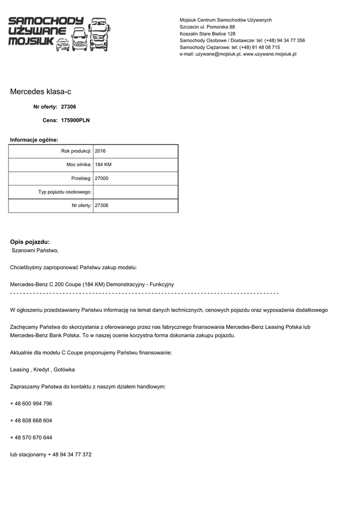 Mojsiuk Centrum Samochodów Używanych Szczecin ul. Pomorska 88 Koszalin Stare Bielice 128 Samochody Osobowe / Dostawcze: tel: (+48) 94 34 77 356 Samochody Ciężarowe: tel: (+48) 91 48 08 715 e-mail: [email protected], www.uzywane.mojsiuk.pl Mercedes klasa-c Nr oferty: 27306 Cena: 175900PLN Informacje ogólne: Rok produkcji: 2016 Moc silnika: 184 KM Przebieg: 27000 Typ pojazdu osobowego: Nr oferty: 27306 Opis pojazdu: Szanowni Państwo, Chcielibyśmy zaproponować Państwu zakup modelu: Mercedes-Benz C 200 Coupe (184 KM) Demonstracyjny - Funkcyjny ---------------------------------------------------------------------------------W ogłoszeniu przedstawiamy Państwu informację na temat danych technicznych, cenowych pojazdu oraz wyposażenia dodatkowego Zachęcamy Państwa do skorzystania z oferowanego przez nas fabrycznego finansowania Mercedes-Benz Leasing Polska lub Mercedes-Benz Bank Polska. To w naszej ocenie korzystna forma dokonania zakupu pojazdu. Aktualnie dla modelu C Coupe proponujemy Państwu finansowanie: Leasing , Kredyt , Gotówka Zapraszamy Państwa do kontaktu z naszym działem handlowym: + 48 600 994 796 + 48 608 668 604 + 48 570 670 644 lub stacjonarny + 48 94 34 77 372 Jesteśmy do Państwa dyspozycji ---------------------------------------------------------------------------------C 200 Coupe (184KM) Demonstracyjny 2016 Lakier: 996 Czerwień hiacyntu metalik Tapicerka: 105 Tapicerka ARTICO - beżowa Osłony przeciwsłoneczne 5 zagłówków Usługa Remote Online System aktywnego serwisowania pojazdu - Assyst Moduł Mercedes-Benz Connect me Schowek na okulary Centralny zamek z blokadą od wewnątrz Bezpośrednie przełożenie układu kierowniczego PARKTRONIC z aktywnym asystentem parkowania Przednie fotele regulowane elektrycznie Zegar analogowy na tunelu centralnym CPA - system zapobiegający kolizjom Brak oznaczenia modelu na pokrywie bagażnika Antena GPS Poduszka powietrzna chroniąca kolana Schowek z gniazdem 12V Wycieraczka przedniej szyby sterowana czujnikiem deszczu Telefon bezpieczeństwa Mercedes-Benz Garmin® MAP PILOT - przygotowanie do montażu 7G-TRONIC PLUS - 7-biegowa, automatyczna skrzynia biegów Tempomat Touchpad do sterowania systemem telemtycznym Wskaźnik zużycia klocków hamulcowych Ogrzewanie szyby tylnej z przełącznikiem czasowym Podsufitka materiałowa - czarna Audio 20 CD Zaczep na torby THERMATIC - klimatyzacja automatyczna Reflektory w technologii LED, statyczne Zamontowana gaśnica Poszerzone nadkola dla obręczy AMG Odtwarzacz CD Tylne szyby mocno przyciemniane Podgrzewane fotele przednie Zbiornik paliwa o zwiększonej pojemności (66l) Bezpośredni wtrysk paliwa Norma czystości spalin EU6 Funkcja start/stop Chromowana końcówka układu wydechowego TIREFIT with tyre inflation compressor Live Traffic Information Gaśnica Elementy wykończenia wnętrza - drewno jesionu, brązowe Adaptacyjne światła hamowania (migające) Pakiet AMG - elementy wewnętrzne 287 Składana tylna kanapa 876 Pakiet oświetlenia wnętrza U26 Dywaniki AMG Pakiet AMG - elementy zewnętrzne 5U4 Diamentowa osłona chłodnicy 677 Zawieszenie z selektywnym systemem tłumienia drgań, obniżone 772 Stylizacja AMG 782 Obręcze kół AMG ze stopów metali lekkich, 18\" B59 DYNAMIC SELECT z możliwością wyboru 5 programów jazdy Pakiet zabezpieczenia pojazdu 551 Alarm antywłamaniowy (EDW) 882 Zabezpieczenie wnętrza pojazdu Pakiet komfortowych siedzeń U22 4-stopniowa regulacja wypchnięcia odcinka lędźwiowego Opony letnie Tylne światła stop i przeciwmgielne w technologii LED Ochrona przeciw błędnemu zatankowaniu paliwa \"Diesel\" Automatyczne podajniki pasów bezpieczeństwa dla przednich foteli automatyczna dezaktywacja przedniej poduszki powietrznej pasażera Uchwyt na butelki Ochrona pieszych ---------------------------------------------------------------------------------Niniejsze ogłoszenie jest wyłącznie informacją handlową i nie stanowi oferty w myśl art. 66, § 1. Kodeksu Cywilnego. Sprzedający nie odpowiada za ewentualne błędy lub nie aktualność ogłoszenia. Jest to informacja handlowa nie stanowiąca oferty w rozumieniu prawa cywilnego, kolory na zdjęciach mogą być inne niż w rzeczywistości. Oferta nie przedstawia rzeczywistych stanów magazynowych