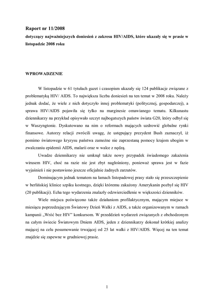 Raport nr 11/2008 dotyczący najważniejszych doniesień z zakresu HIV/AIDS, które ukazały się w prasie w listopadzie 2008 roku WPROWADZENIE W listopadzie w 61 tytułach gazet i czasopism ukazały się 124 publikacje związane z problematyką HIV/ AIDS. To największa liczba doniesień na ten temat w 2008 roku. Należy jednak dodać, że wiele z nich dotyczyło innej problematyki (politycznej, gospodarczej), a sprawa HIV/AIDS pojawiła się tylko na marginesie omawianego tematu. Kilkunastu dziennikarzy na przykład opisywało szczyt najbogatszych państw świata G20, który odbył się w Waszyngtonie. Dyskutowano na nim o reformach mających uzdrowić globalne rynki finansowe. Autorzy relacji zwrócili uwagę, że ustępujący prezydent Bush zaznaczył, iż pomimo światowego kryzysu państwa zamożne nie zaprzestaną pomocy krajom ubogim w zwalczaniu epidemii AIDS, malarii oraz w walce z nędzą. Uwadze dziennikarzy nie umknął także nowy przypadek świadomego zakażenia wirusem HIV, choć na razie nie jest zbyt nagłośniony, ponieważ sprawa jest w fazie wyjaśnień i nie postawiono jeszcze oficjalnie żadnych zarzutów. Dominującym jednak tematem na łamach listopadowej prasy stało się przeszczepienie w berlińskiej klinice szpiku kostnego, dzięki któremu zakażony Amerykanin pozbył się HIV (20 publikacji). Echa tego wydarzenia znalazły odzwierciedlenie w większości dzienników. Wiele miejsca poświęcono także działaniom profilaktycznym, mającym miejsce w miesiącu poprzedzającym Światowy Dzień Walki z AIDS, a także organizowanym w ramach kampanii „Wróć bez HIV” konkursom. W przeddzień wydarzeń związanych z obchodzonym na całym świecie Światowym Dniem AIDS, jeden z dziennikarzy dokonał krótkiej analizy mającej na celu posumowanie trwającej od 25 lat walki z HIV/AIDS. Więcej na ten temat znajdzie się zapewne w grudniowej prasie. 1 Tabela 1. Tytuły gazet i czasopism publikujących więcej niż dwie informacje na temat HIV/AIDS w listopadzie 2008 roku Miejsce 1. 2. 3. 4. 5. 6. 7. 8. 9. 10. 11. Tytuł Polska Gazeta Wyborcza Nasz Dziennik Dziennik Nowości Głos Koszaliński Trybuna Expres Bydgoski Rzeczpospolita Dziennik Wschodni Gość Niedzielny Ilość publikacji 13 10 6 5 4 4 3 3 3 3 3 * zestawienie obejmuje lokalne wydania Gazety Wyborczej i dziennika Polska Wykres 1. Ranking gazet i czasopism zawierających więcej niż dwie publikacje na temat HIV/AIDS w listopadzie 2008 roku Gość Niedzielny 3 3 3 3 3 Dziennik Wschodni Rzeczpospolita Express Bydgoski Trybuna Głos Koszaliński Nowości 4 4 5 Dziennik Nasz Dziennik 6 Gazeta Wyborcza 10 13 Polska 0 5 10 15 EPIDEMIOLOGIA 25 lat walki z AIDS Rok 1983, w którym prof. Luc Montagnier z Instytutu Pasteura i Amerykanin Robert Gallo odkryli wirusa wywołującego AIDS stał się rokiem przełomowym i początkiem walki z tą groźną chorobą. Badacze przypuszczają, że choroba jest znacznie starsza - przeniosła się z małp na ludzi mniej więcej sto lat temu. Doszli oni do takiego wniosku, modelując przebieg 2 mutacji wirusa w komputerze. Przez dziesięciolecia HIV przenosił się między ludźmi żyjącymi w małych wioskach środkowej Afryki. W latach 60-tych, kiedy kontynent otworzył się na świat, wirus „wydostał się ze swej kryjówki” i zaatakował najpierw kraje Afryki, a później rozprzestrzenił się na całym świecie. Już 25 lat naukowcy i politycy walczą z epidemią HIV/AIDS. Obchodząc tę rocznicę, można pokusić się o krótkie podsumowanie i odpowiedzieć na pytanie, co udało się osiągnąć przez te lata walki: · Największym osiągnięciem jest wynalezienie leków antyretrowirusowych, które skutecznie atakują HIV, znacznie przedłużają życie chorego i pozwalają mu prowadzić normalne życie. · Na świecie epidemia została wyhamowana, nawet w państwach Afryki – w niektórych, jak np. w Ugandzie, wyraźnie spadła liczba nowych zakażeń, a w Kenii sytuacja się ustabilizowała. Globalnie osób zakażonych wciąż przybywa, ale mniej niż w latach 90-tych. Epidemiolodzy wyjaśniają to zjawisko, przedstawiając dwie wersje: pierwsza głosi, że zadziałały kampanie edukacyjne i strach – ludzie zaczęli częściej używać prezerwatyw i mają mniej partnerów seksualnych, druga – zakazili się już wszyscy lub prawie wszyscy, którzy ze względu na tryb życia mogli się zakazić. · Ruszyły programy leczenia zakażonych. Dzięki 15 mld dolarów z amerykańskiego budżetu w Afryce leczy się na stałe 1,7 mln osób, a matki zakażone HIV urodziły 200 tys. zdrowych dzieci. Amerykańska inicjatywa jest największym tego typu programem na świecie. Duże programy leczenia mają także rządy niektórych krajów, jak np. Brazylia czy RPA. W sumie w najbiedniejszych krajach leczy się już 3 mln ludzi z blisko 9 mln, które potrzebują leczenia. · Aktywistom walczącym z AIDS udało się zmusić koncerny farmaceutyczne do obniżenia cen leków. Dziesięć lat temu skuteczna kuracja kosztowała 20 tys. dolarów na osobę rocznie. Dziś najbiedniejsze kraje płacą specjalne stawki za leki i mogą kupować generyki (kopie opatentowanych przez zachodnie korporacje preparatów), dzięki czemu kuracja kosztuje od kilku do kilkudziesięciu dolarów rocznie. · Niestety, nie udało się do tej pory stworzyć szczepionki – wirus jest zbyt zmienny, żeby mogła być skuteczna. Podejmowano co prawda różne próby i testowano kilka 3 specyfików, ale żadna nie okazała się skuteczna. Naukowcy są zdania, że w najbliższej przyszłości takiej szczepionki nie uda się stworzyć. 1 KAMPANIA „WRÓC BEZ HIV” Komiksy o AIDS Wojewódzka Stacja Sanitarno-Epidemiologiczna w Poznaniu ogłosiła konkurs pod hasłem „HIV/AIDS nie zna granic”. Projekt zakładał wyłonienie najlepszego komiksu edukacyjnego w ramach multimedialnej kampanii społecznej „Wróć bez HIV”. Głównym adresatem projektu byli uczniowie pierwszych i drugich klas szkół gimnazjaln