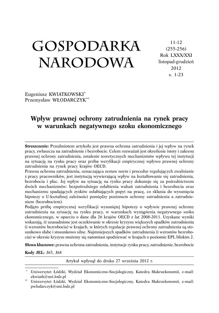 GOSPODARKA NARODOWA 11-12 (255-256) Rok LXXX/XXI listopad-grudzień 2012 s. 1-23 Eugeniusz KWIATKOWSKI* Przemysław WŁODARCZYK** Wpływ prawnej ochrony zatrudnienia na rynek pracy w warunkach negatywnego szoku ekonomicznego Streszczenie: Przedmiotem artykułu jest prawna ochrona zatrudnienia i jej wpływ na rynek pracy, zwłaszcza na zatrudnienie i bezrobocie. Celem rozważań jest określenie istoty i zakresu prawnej ochrony zatrudnienia, ustalenie teoretycznych mechanizmów wpływu tej instytucji na sytuację na rynku pracy oraz próba weryfikacji empirycznej wpływu prawnej ochrony zatrudnienia na rynek pracy krajów OECD. Prawna ochrona zatrudnienia, oznaczająca zestaw norm i procedur regulujących zwalnianie z pracy pracowników, jest instytucją wywierającą wpływ na kształtowanie się zatrudnienia, bezrobocia i płac. Jej wpływ na sytuację na rynku pracy dokonuje się za pośrednictwem dwóch mechanizmów: bezpośredniego osłabienia wahań zatrudnienia i bezrobocia oraz mechanizmu spadających zysków osłabiających popyt na pracę, co skłania do wysunięcia hipotezy o U-kształtnej zależności pomiędzy poziomem ochrony zatrudnienia a zatrudnieniem (bezrobociem). Podjęto próbę empirycznej weryfikacji wysuniętej hipotezy o wpływie prawnej ochrony zatrudnienia na sytuację na rynku pracy, w warunkach wystąpienia negatywnego szoku ekonomicznego, w oparciu o dane dla 26 krajów OECD z lat 2008-2011. Uzyskane wyniki wskazują, iż uzasadnione jest oczekiwanie w okresie kryzysu większych spadków zatrudnienia (i wzrostów bezrobocia) w krajach, w których regulacje prawnej ochrony zatrudnienia są stosunkowo słabe i stosunkowo silne. Najmniejszych spadków zatrudnienia (i wzrostów bezrobocia) w okresie kryzysu możemy się natomiast spodziewać w krajach o poziomie EPL bliskim 2. Słowa kluczowe: prawna ochrona zatrudnienia, instytucje rynku pracy, zatrudnienie, bezrobocie Kody JEL: J65, J68 Artykuł wpłynął do druku 27 września 2012 r. * ** Uniwersytet Łódzki, Wydział Ekonomiczno-Socjologiczny, Katedra Makroekonomii, e-mail: [email protected] Uniwersytet Łódzki, Wydział Ekonomiczno-Socjologiczny, Katedra Makroekonomii, e-mail: [email protected] 2 GOSPODARKA NARODOWA Nr 11-12/2012 Wstęp Prawna ochrona zatrudnienia należy do instytucji rynku pracy, obok płac minimalnych, opodatkowania pracy czy też zasiłków dla bezrobotnych, mających ważne znaczenie dla funkcjonowania i rezultatów rynku pracy. Wszystkie te instytucje wywierają istotny wpływ na zachowania i decyzje podmiotów gospodarczych działających na rynku pracy i w rezultacie mogą oddziaływać na stan podstawowych zmiennych makroekonomicznych rynku pracy, w szczególności zatrudnienia i bezrobocia. Przyczyn wzrostu zainteresowania teorii ekonomii problematyką prawnej ochrony zatrudnienia w ostatnim czasie można upatrywać w kilku czynnikach. Po pierwsze, jest to związane z rozwojem i wzrostem znaczenia ekonomii instytucjonalnej w teorii ekonomii. Po drugie, jest to związane z niezadowalającym objaśnieniem sytuacji na rynkach pracy, a w szczególności bezrobocia i podejmowaniem różnorodnych poszukiwań teoretycznych nad ich lepszym wytłumaczeniem. Po trzecie, problemy prawnej ochrony zatrudnienia wpisują się bezpośrednio w stary spór teoretyczny na temat roli rynku i państwa w gospodarce oraz regulacji i deregulacji rynku pracy. Choć doświadczenia regulacji i deregulacji rynku pracy są już dosyć bogate, to jednak poglądy ekonomistów na temat wpływu wspomnianych instytucji rynku pracy na zatrudnienie i bezrobocie nadal nie są jednoznaczne. Przedmiotem artykułu jest prawna ochrona zatrudnienia i jej wpływ na rynek pracy, zwłaszcza na zatrudnienie i bezrobocie. Celem rozważań jest określenie istoty, zakresu i tendencji zmian prawnej ochrony zatrudnienia, ustalenie teoretycznych mechanizmów wpływu tej instytucji na sytuację na rynku pracy oraz próba weryfikacji wpływu prawnej ochrony zatrudnienia na rynek pracy na przykładzie 26 krajów OECD w okresie negatywnego szoku ekonomicznego. Artykuł rozpoczyna się od rozważań dotyczących istoty, zakresu i pomiaru prawnej ochrony zatrudnienia. Analizie zostały poddane tendencje dotyczące jej restrykcyjności obserwowane w krajach OECD w latach 2000-2008. Następnie przedstawiono mechanizmy wpływu ochrony zatrudnienia na rynek pracy, których podstawą są uznane teorie ekonomiczne. W kolejnej części artykułu dokonano przeglądu wyników dotychczasowych badań empirycznych w literaturze dotyczących wpływu prawnej ochrony zatrudnienia na rynek pracy. Podjęto również próbę empirycznej weryfikacji hipotezy o wpływie prawnej ochrony zatrudnienia na sytuację na rynku pracy w warunkach wystąpienia negatywnego szoku ekonomicznego w oparciu o dane statystyczne 26 krajów OECD z lat 2008-2011. Ostatnia część artykułu zawiera podsumowanie najważniejszych wniosków wynikających z rozważań. Istota i pomiar prawnej ochrony zatrudnienia Pojęcie prawnej ochrony zatrudnienia (z ang. Employment Protection Legislation – EPL) jest przedmiotem wielu analiz w literaturze. Ograniczając się w tym względzie do literatury ekonomicznej, można zwrócić uwagę na dwa ujęcia tej kategorii: szersze i węższe. Eugeniusz Kwiatkowski, Przemysław Włodaczyk, Wpływ prawnej ochrony zatrudnienia... 3 W ujęciu szerszym EPL oznacza „restrykcje narzucone na możliwość wykorzystania pracy przez pracodawcę” [Addison, Teixeira, 2001, s. 2], obejmując swym zakresem regulacje dotyczące zwolnień z pracy, czasu pracy, możliwości stosowania umów na czas określony, warunków bezpieczeństwa pracy, zwolnień chorobowych i innych. W ujęciu węższym natomiast „prawna ochrona zatrudnienia jest zbiorem obowiązkowych restrykcji rządzących zwolnieniami pracowników z pracy” [Cahuc, Zylberberg, 2004, s. 734]. Chodzi tutaj o normy i procedury postępowania, które muszą być przestrzegane przez pracodawców 