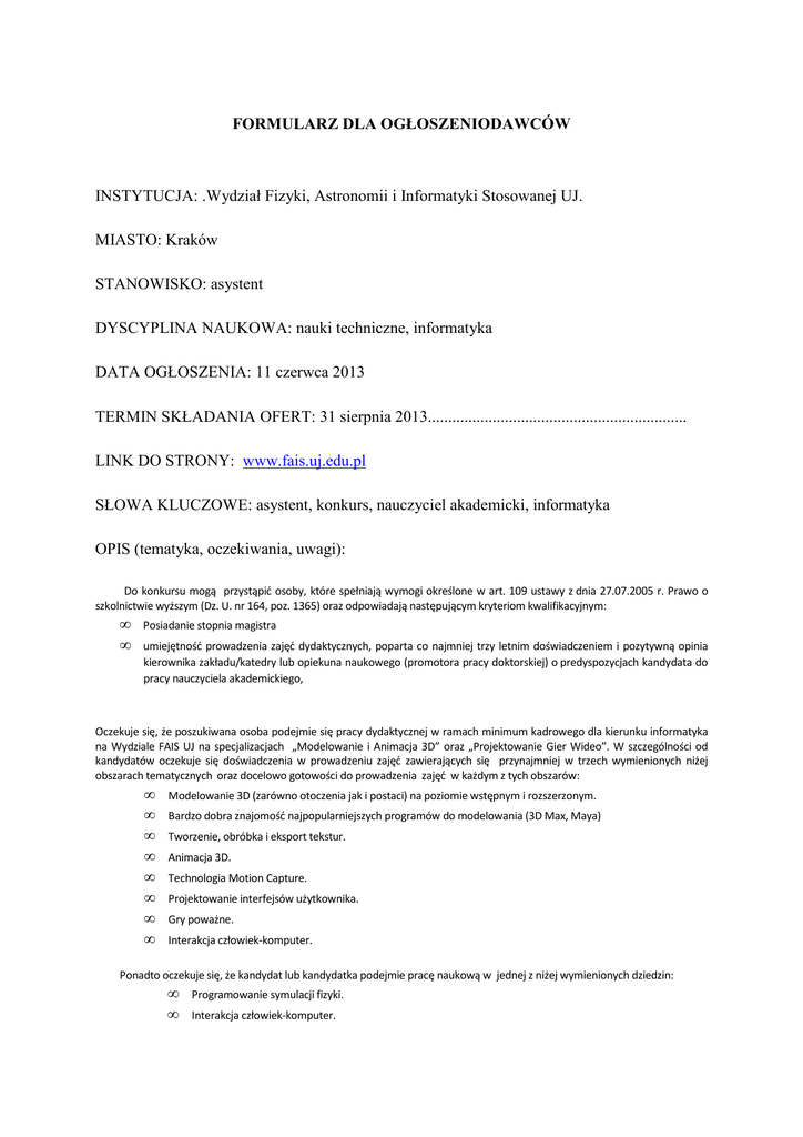 FORMULARZ DLA OGŁOSZENIODAWCÓW INSTYTUCJA: .Wydział Fizyki, Astronomii i Informatyki Stosowanej UJ. MIASTO: Kraków STANOWISKO: asystent DYSCYPLINA NAUKOWA: nauki techniczne, informatyka DATA OGŁOSZENIA: 11 czerwca 2013 TERMIN SKŁADANIA OFERT: 31 sierpnia 2013................................................................ LINK DO STRONY: www.fais.uj.edu.pl SŁOWA KLUCZOWE: asystent, konkurs, nauczyciel akademicki, informatyka OPIS (tematyka, oczekiwania, uwagi): Do konkursu mogą przystąpić osoby, które spełniają wymogi określone w art. 109 ustawy z dnia 27.07.2005 r. Prawo o szkolnictwie wyższym (Dz. U. nr 164, poz. 1365) oraz odpowiadają następującym kryteriom kwalifikacyjnym: • • Posiadanie stopnia magistra umiejętność prowadzenia zajęć dydaktycznych, poparta co najmniej trzy letnim doświadczeniem i pozytywną opinia kierownika zakładu/katedry lub opiekuna naukowego (promotora pracy doktorskiej) o predyspozycjach kandydata do pracy nauczyciela akademickiego, Oczekuje się, że poszukiwana osoba podejmie się pracy dydaktycznej w ramach minimum kadrowego dla kierunku informatyka na Wydziale FAIS UJ na specjalizacjach „Modelowanie i Animacja 3D” oraz „Projektowanie Gier Wideo”. W szczególności od kandydatów oczekuje się doświadczenia w prowadzeniu zajęć zawierających się przynajmniej w trzech wymienionych niżej obszarach tematycznych oraz docelowo gotowości do prowadzenia zajęć w każdym z tych obszarów: • • • • • • • • Modelowanie 3D (zarówno otoczenia jak i postaci) na poziomie wstępnym i rozszerzonym. Bardzo dobra znajomość najpopularniejszych programów do modelowania (3D Max, Maya) Tworzenie, obróbka i eksport tekstur. Animacja 3D. Technologia Motion Capture. Projektowanie interfejsów użytkownika. Gry poważne. Interakcja człowiek-komputer. Ponadto oczekuje się, że kandydat lub kandydatka podejmie pracę naukową w jednej z niżej wymienionych dziedzin: • • Programowanie symulacji fizyki. Interakcja człowiek-komputer. • • • Programowanie Procesorów Graficznych. Gry poważne. Badanie struktur gier komputerowych. Mile widziane jest doświadczenie w pracy naukowej poparte publikacjami i/lub wystąpieniami na konferencjach naukowych. Zastrzega się, że preferowana będzie osoba, dla której Uniwersytet Jagielloński będzie jedynym miejscem pracy. Kandydaci przystępujący do konkursu winni złożyć w Dziekanacie Wydziału Fizyki, Astronomii i Informatyki Stosowanej UJ , 30-059 Kraków, ul. Reymonta 4, pokój 016a następujące dokumenty: 1. 2. 3. 4. 5. 6. 7. podanie/list motywacyjny, 8. oświadczenie o znajomości i akceptacji zasad dotyczących własności intelektualnej i ochrony prawnej dóbr intelektualnych. Curriculum Vitae, wykaz publikacji, kwestionariusz osobowy, oświadczenie stwierdzające, że UJ będzie podstawowym miejscem pracy w przypadku wygrania konkursu, oświadczenie w trybie art. 109 ust. 1 ustawy Prawo o szkolnictwie wyższym. oświadczenie o wyrażeniu zgody na zaliczenie do minimum kadrowego dla potrzeb ustalenia uprawnień do nadawania stopnia doktora i doktora habilitowanego i/lub dla potrzeb utworzenia/prowadzenia kierunku studiów wyższych, w przypadku wygrania konkursu. Termin składania zgłoszeń upływa z dniem 31 sierpnia 2013 r. Rozstrzygnięcie konkursu nastąpi do dnia 26 września 2013 r. Na podaniu należy dopisać: „Wyrażam zgodę na przetwarzanie moich danych osobowych zawartych w mojej ofercie pracy dla potrzeb niezbędnych do realizacji procesu rekrutacji” ( zgodnie z ustawą z dnia 29 sierpnia 1997 roku o ochronie danych osobowych, Dz. U. Nr 133, poz. 883 z późniejszymi zmianami).