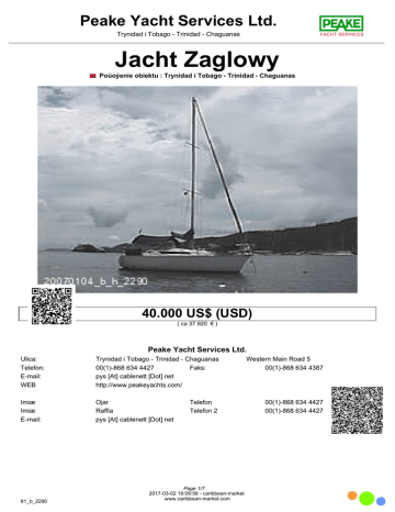 Peake Yacht Services Ltd. Trynidad i Tobago - Trinidad - Chaguanas Jacht Zaglowy Poùoýenie obiektu : Trynidad i Tobago - Trinidad - Chaguanas 40.000 US$ (USD) ( ca 37.920 € ) Peake Yacht Services Ltd. Ulica: Telefon: E-mail: WEB Trynidad i Tobago - Trinidad - Chaguanas 00(1)-868 634 4427 Faks: pys [At] cablenett [Dot] net http://www.peakeyachts.com/ Imiæ Imiæ E-mail: Ojar Raffia pys [At] cablenett [Dot] net 81_b_2290 Telefon Telefon 2 Page 1/7 2017-03-02 18:09:56 - caribbean-market www.caribbean-market.com Western Main Road 5 00(1)-868 634 4387 00(1)-868 634 4427 00(1)-868 634 4427 Peake Yacht Services Ltd. Trynidad i Tobago - Trinidad - Chaguanas Typ ùodzi Numer kodu Typ ùodzi Producent: Model Designer Stan Materiaù Olinowanie Rok Kolor Dùugoúã LOA Dùugoúã LWL Wysokoúã pomieszczeñ Waga 81_b_2290 Jacht Zaglowy Jeanneau Sunlight potrzebne CSF Slup 1988 biaùy 30,00 ft ( 9,1 m ) Numer kodu Zgùoú Ksztaùt kadùuba Kokpit Naprawianych roku Kontrola Szerokoúã Szkic Waga (Ballast) Dane na temat silnika - Napædy Proste Prædkoúã maksymalna Tankdaten Iloúã paliwa Woda Kanalizacja 81_b_2290 Page 2/7 2017-03-02 18:09:56 - caribbean-market www.caribbean-market.com Belgia Jednokadùubowy Kokpit Aft 2003 Peake Yacht Services Ltd. Trynidad i Tobago - Trinidad - Chaguanas Sprzæt Okræty Instruments Zaloguj Compass GPS Anemometr Scoreboard Sonar Radar Ploter NavText Fax Pogoda VHF Radio SSB Pactor El Autopilot Wiatr Kontroli Fishfinder AIS Komputer Wyposaýenie techniczne Odtwarzacz CD Radio Telewizja Ùàcznoúã satelitarna Systemu 12 V DC Systemu 24 V DC Ùadowarka Solar Cells Wiatr Generator Wave Generator Generator 110-220 V Invertor 110-220 V Moc Shore Ogrzewanie Klimatyzacja Druckwasseranlage Systemu ciepùej wody Gazowniæ Watermaker Ster strumieniowy Divecompressor Bilgepump elektrycznie Bilgepump Maunel 81_b_2290 Urzadzenie & podzial Boat Equipment 2 Kabiny 4 Koje 1 Toalety Zùy Wùaúciciele kabiny Spiýarnia Zatopiã Kuchenka gazowa Kuchenka elektryczna Piec Benzyna Piekarnik gazowy Piekarnik Elektryczny Lodówka Zamraýarka Kuchenka mikrofalowa Zmywarka Pralnia 1 Anchor Winda kotwiczna Teak Kàpieliska Ladder Prysznic rufowy Rack Equipment Trap Daivits Davit Ùódki Ùódki m. AB Bukszpryt Trim Tabs Wyposaýenie wnætrz Flybridge 2. Helm na lot Boat Trailer Bezpieczeñstwo Inne dodatki Kamizelki ratunkowe Liferaft EPRIB Szperacze System Gaúnice Page 3/7 2017-03-02 18:09:56 - caribbean-market www.caribbean-market.com Szyber dach Hafenpersenning Latajàcy most Ganzpersenning Cieñ niedz Fly Markiza na rufie pokùad Bimini Sprayhood Peake Yacht Services Ltd. Trynidad i Tobago - Trinidad - Chaguanas 81_b_2290 Page 4/7 2017-03-02 18:09:56 - caribbean-market www.caribbean-market.com Peake Yacht Services Ltd. Trynidad i Tobago - Trinidad - Chaguanas 81_b_2290 Page 5/7 2017-03-02 18:09:56 - caribbean-market www.caribbean-market.com Peake Yacht Services Ltd. Trynidad i Tobago - Trinidad - Chaguanas 81_b_2290 Page 6/7 2017-03-02 18:09:56 - caribbean-market www.caribbean-market.com Peake Yacht Services Ltd. Trynidad i Tobago - Trinidad - Chaguanas 81_b_2290 Page 7/7 2017-03-02 18:09:56 - caribbean-market www.caribbean-market.com
