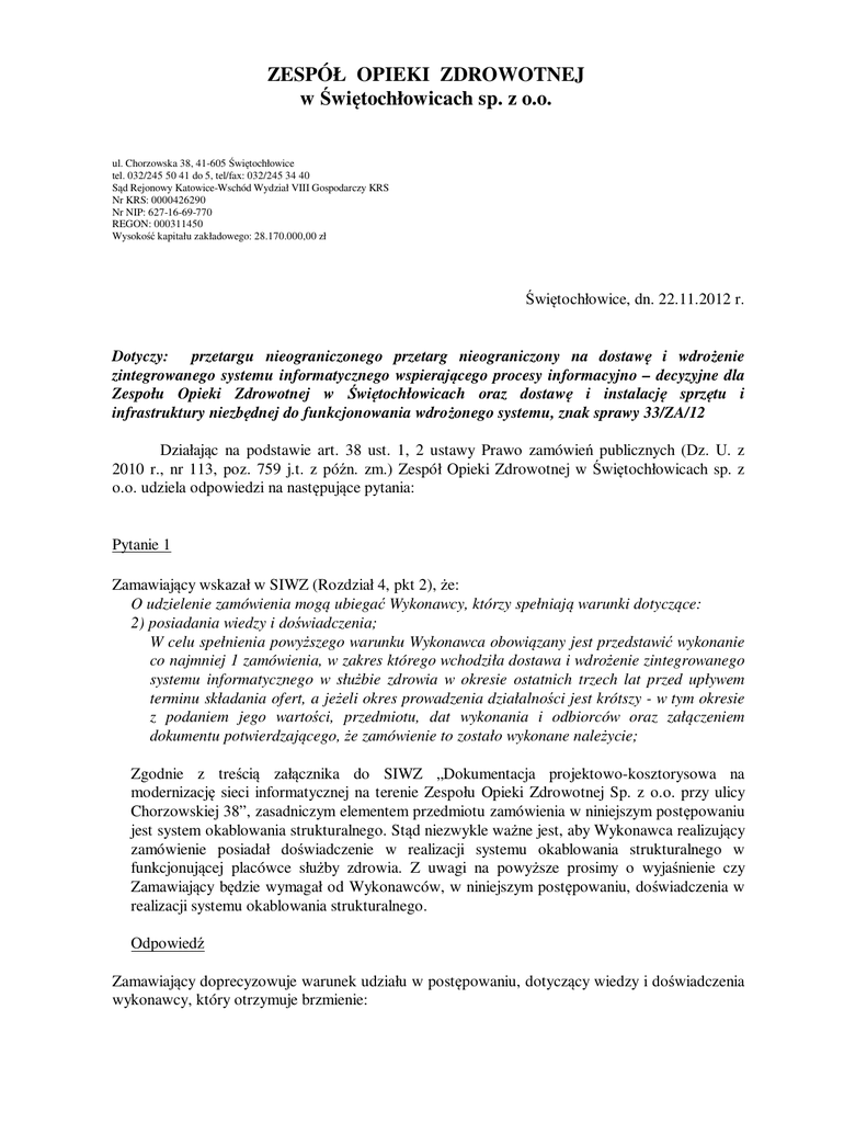 ZESPÓŁ OPIEKI ZDROWOTNEJ w Świętochłowicach sp. z o.o. ul. Chorzowska 38, 41-605 Świętochłowice tel. 032/245 50 41 do 5, tel/fax: 032/245 34 40 Sąd Rejonowy Katowice-Wschód Wydział VIII Gospodarczy KRS Nr KRS: 0000426290 Nr NIP: 627-16-69-770 REGON: 000311450 Wysokość kapitału zakładowego: 28.170.000,00 zł Świętochłowice, dn. 22.11.2012 r. Dotyczy: przetargu nieograniczonego przetarg nieograniczony na dostawę i wdrożenie zintegrowanego systemu informatycznego wspierającego procesy informacyjno – decyzyjne dla Zespołu Opieki Zdrowotnej w Świętochłowicach oraz dostawę i instalację sprzętu i infrastruktury niezbędnej do funkcjonowania wdrożonego systemu, znak sprawy 33/ZA/12 Działając na podstawie art. 38 ust. 1, 2 ustawy Prawo zamówień publicznych (Dz. U. z 2010 r., nr 113, poz. 759 j.t. z późn. zm.) Zespół Opieki Zdrowotnej w Świętochłowicach sp. z o.o. udziela odpowiedzi na następujące pytania: Pytanie 1 Zamawiający wskazał w SIWZ (Rozdział 4, pkt 2), że: O udzielenie zamówienia mogą ubiegać Wykonawcy, którzy spełniają warunki dotyczące: 2) posiadania wiedzy i doświadczenia; W celu spełnienia powyższego warunku Wykonawca obowiązany jest przedstawić wykonanie co najmniej 1 zamówienia, w zakres którego wchodziła dostawa i wdrożenie zintegrowanego systemu informatycznego w służbie zdrowia w okresie ostatnich trzech lat przed upływem terminu składania ofert, a jeżeli okres prowadzenia działalności jest krótszy - w tym okresie z podaniem jego wartości, przedmiotu, dat wykonania i odbiorców oraz załączeniem dokumentu potwierdzającego, że zamówienie to zostało wykonane należycie; Zgodnie z treścią załącznika do SIWZ „Dokumentacja projektowo-kosztorysowa na modernizację sieci informatycznej na terenie Zespołu Opieki Zdrowotnej Sp. z o.o. przy ulicy Chorzowskiej 38”, zasadniczym elementem przedmiotu zamówienia w niniejszym postępowaniu jest system okablowania strukturalnego. Stąd niezwykle ważne jest, aby Wykonawca realizujący zamówienie posiadał doświadczenie w realizacji systemu okablowania strukturalnego w funkcjonującej placówce służby zdrowia. Z uwagi na powyższe prosimy o wyjaśnienie czy Zamawiający będzie wymagał od Wykonawców, w niniejszym postępowaniu, doświadczenia w realizacji systemu okablowania strukturalnego. Odpowiedź Zamawiający doprecyzowuje warunek udziału w postępowaniu, dotyczący wiedzy i doświadczenia wykonawcy, który otrzymuje brzmienie: O udzielenie zamówienia mogą ubiegać się Wykonawcy, którzy spełniają warunki dotyczące: 2) posiadania wiedzy i doświadczenia; W celu spełnienia powyższego warunku Wykonawca obowiązany jest przedstawić wykonanie, w okresie ostatnich trzech lat przed upływem terminu składania ofert, a jeżeli okres prowadzenia działalności jest krótszy - w tym okresie, co najmniej dwóch zamówień, w tym co najmniej: - 1 zamówienie polegające na dostawie i wdrożeniu zintegrowanego systemu informatycznego w placówce służby zdrowia, - 1 zamówienie polegające na wykonaniu okablowania strukturalnego wraz z dostawą urządzeń aktywnych i uruchomieniem sieci, wykorzystującej zarówno okablowanie miedziane kategorii 7 (klasa F) jak i światłowodowe, o wartości nie mniejszej niż 200 000 zł brutto z wyłączeniem kosztów urządzeń aktywnych, wykonane w czynnym budynku służby zdrowia z podaniem ich wartości, przedmiotu, dat wykonania i odbiorców oraz załączeniem dokumentu potwierdzającego, że zamówienia te zostały wykonane należycie. Zamawiający zgodnie z zapisami art. 12 ust. 4 ustawy Prawo zamówień publicznych (Dz. U. z 2010 r., nr 113, poz. 759 j.t. z późn. zm) modyfikuje treść ogłoszenia o zamówieniu. Lp. Miejsce modyfikacji III.2.3) Zamiast Powinno być Kwalifikacja techniczne Informacje i formalności konieczne do dokonania oceny spełniania wymogów: a) wypełniony załącznik przedstawiający wykonanie co najmniej 1 zamówienia, w zakres którego wchodziła dostawa i wdrożenie zintegrowanego systemu informatycznego w służbie zdrowia w okresie ostatnich trzech lat przed upływem terminu składania ofert, a jeżeli okres prowadzenia działalności jest krótszy – w tym okresie z podaniem jego wartości, przedmiotu, dat wykonania i odbiorców oraz załączeniem dokumentu potwierdzającego, że zamówienie to zostało wykonane należycie; b) certyfikat zarządzania jakością ISO 9001 lub równoważny dokument potwierdzający posiadanie wdrożonego systemu zarządzania jakością w zakresie dostaw, wdrażania i serwisu sieci komputerowych lub systemów teleinformatycznych; Kwalifikacja techniczne Informacje i formalności konieczne do dokonania oceny spełniania wymogów: wypełniony załącznik przedstawiający wykonanie , w okresie ostatnich trzech lat przed upływem terminu składania ofert, a jeżeli okres prowadzenia działalności jest krótszy - w tym okresie, co najmniej dwóch zamówień, w tym co najmniej: - 1 zamówienie polegające na dostawie i wdrożeniu zintegrowanego systemu informatycznego w placówce służby zdrowia, - 1 zamówienie polegające na wykonaniu okablowania strukturalnego wraz z dostawą urządzeń aktywnych i uruchomieniem sieci, wykorzystującej zarówno okablowanie miedziane kategorii 7 (klasa F) jak i światłowodowe, o wartości nie mniejszej niż 200 000 zł brutto z wyłączeniem kosztów urządzeń aktywnych, wykonane w czynnym budynku służby zdrowia z podaniem ich wartości, przedmiotu, c) wypełniony załącznik przedstawiający zatrudnienie co najmniej 1 pracownika posiadającego kwalifikacje zawodowe w zakresie obsługi serwerów i macierzy; dat wykonania i odbiorców oraz załączeniem dokumentu potwierdzającego, że zamówienia te zostały wykonane należycie; b) certyfikat zarządzania jakością ISO 9001 lub równoważny dokument potwierdzający posiadanie wdrożonego systemu zarządzania jakością w zakresie dostaw, wdrażania i serwisu s