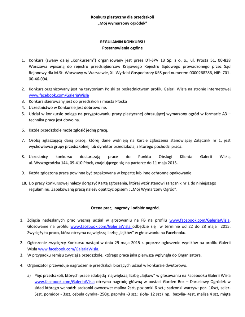 Konkurs plastyczny dla przedszkoli „Mój wymarzony ogródek” REGULAMIN KONKURSU Postanowienia ogólne 1. Konkurs (zwany dalej „Konkursem”) organizowany jest przez DT-SPV 13 Sp. z o. o., ul. Prosta 51, 00-838 Warszawa wpisaną do rejestru przedsiębiorców Krajowego Rejestru Sądowego prowadzonego przez Sąd Rejonowy dla M.St. Warszawy w Warszawie, XII Wydział Gospodarczy KRS pod numerem 0000268286, NIP: 70100-46-094. 2. Konkurs organizowany jest na terytorium Polski za pośrednictwem profilu Galerii Wisła na stronie internetowej www.facebook.com/GaleriaWisla 3. Konkurs skierowany jest do przedszkoli z miasta Płocka 4. Uczestnictwo w Konkursie jest dobrowolne. 5. Udział w konkursie polega na przygotowaniu pracy plastycznej obrazującej wymarzony ogród w formacie A3 – technika pracy jest dowolna. 6. Każde przedszkole może zgłosić jedną pracę. 7. Osobą zgłaszającą daną pracę, której dane widnieją na Karcie zgłoszenia stanowiącej Załącznik nr 1, jest wychowawca grupy przedszkolnej lub dyrektor przedszkola, z którego pochodzi praca. 8. Uczestnicy konkursu dostarczają prace do Punktu Obsługi Klienta ul. Wyszogrodzka 144, 09-410 Płock, znajdującego się na parterze do 11 maja 2015. Galerii Wisła, 9. Każda zgłoszona praca powinna być zapakowana w kopertę lub inne ochronne opakowanie. 10. Do pracy konkursowej należy dołączyć Kartę zgłoszenia, której wzór stanowi załącznik nr 1 do niniejszego regulaminu. Zapakowaną pracę należy opatrzyć opisem : „Mój Wymarzony Ogród”. Ocena prac, nagrody i odbiór nagród. 1. Zdjęcia nadesłanych prac wezmą udział w głosowaniu na FB na profilu www.facebook.com/GaleriaWisla. Głosowanie na profilu www.facebook.com/GaleriaWisla odbędzie się w terminie od 22 do 28 maja 2015. Zwycięży ta praca, która otrzyma największą liczbę „lajków” w głosowaniu na Facebooku. 2. Ogłoszenie zwycięzcy Konkursu nastąpi w dniu 29 maja 2015 r. poprzez ogłoszenie wyników na profilu Galerii Wisła www.facebook.com/GaleriaWisla. 3. W przypadku remisu zwycięża przedszkole, którego praca jaka pierwsza wpłynęła do Organizatora. 4. Organizator przewiduje nagrodzenie przedszkoli biorących udział w konkursie dwutorowo: a) Pięć przedszkoli, których prace zdobędą największą liczbę „lajków” w głosowaniu na Facebooku Galerii Wisła www.facebook.com/GaleriaWisla otrzyma nagrodę główną w postaci Garden Box – Darusiowy Ogródek w skład którego wchodzi: sadzonki owocowe: malina 2szt, poziomki 6 szt.; sadzonki warzyw: por- 10szt, seler5szt, pomidor - 3szt, cebula dymka- 250g, papryka -3 szt.; zioła- 12 szt ( np.: bazylia- 4szt, melisa 4 szt, mięta lub tymianek 4 szt.); nasiona: buraki 1szt, fasolka szparagowa 1 szt, groch zielony 1 szt, dynia 1szt, ogórki 1 szt.; zestaw dziecięcych narzędzi ogrodowych. Wartość nagrody to około 190,00zł brutto. b) Pozostałe przedszkola biorące udział w konkursie otrzymają nagrodę w postaci zestawu „Małego ogrodnika”. W skład zestawu wchodzą nasiona, sadzonki i narzędzia ogrodnicze. Wartość jednego zestawu wynosi 100 brutto. 5. Nagrody zostaną dostarczone do przedszkola przez Organizatora w terminie ustalonym indywidualnie w przeciągu dwóch tygodni od zakończenia konkursu. 6. Odbiór nagród potwierdza się podpisaniem stosownego dokumentu. 7. Organizatorzy zastrzegają sobie prawo do publikowania nagrodzonych prac. Za ich publikację autorowi nie przysługuje wynagrodzenie. 8. Udział w konkursie jest jednoznaczny z przyjęciem warunków zawartych w niniejszym regulaminie. Reklamacje 1. Wszelkie reklamacje i zastrzeżenia dotyczące niniejszego Konkursu mogą być zgłaszane na piśmie do dnia 3 czerwca 2015 roku (decyduje data stempla pocztowego) na adres: DT-SPV 13 Sp. z o.o., ul. Prosta 51, 00-838 Warszawa z dopiskiem: Galeria Wisła - Konkurs dla przedszkoli „Mój wymarzony ogródek”. 2. Reklamacja musi być złożona w formie pisemnej i powinna zawierać: - imię, nazwisko, dokładny adres składającego reklamację oraz numer telefonu kontaktowego; - dokładny opis i powód reklamacji w tym daty i miejsca zdarzenia, którego roszczenie dotyczy; - treść żądania. 3. Organizator będzie rozpatrywać reklamacje w terminie 7 dni roboczych na podstawie niniejszego Regulaminu. Składający reklamację zostanie powiadomiony o sposobie rozpatrzenia reklamacji listem poleconym wysłanym na adres podany w reklamacji w terminie 2 dni roboczych od daty rozpatrzenia reklamacji. 4. W przypadku nie uwzględnienia zgłoszonej reklamacji osoba zgłaszająca reklamację może dochodzić swoich roszczeń przed sądem powszechnym. Postanowienia końcowe 1. Organizator oświadcza, iż Konkurs nie jest grą losową ani zakładem wzajemnym w rozumieniu przepisów ustawy z dnia 19 listopada 2009 roku o grach hazardowych. 2. Informacje o Konkursie, w tym niniejsze zasady, dostępne są przez cały okres trwania Konkursu w biurze Organizatora. 3. Organizator oświadcza, iż nagrody zostaną wydane zgodnie z przepisami ustawy z dnia 26.07.1991 r. o podatku dochodowym od osób fizycznych (Dz. U. 2012 r. poz. 361). 4. Organizator jest odpowiedzialny za ewentualne naliczenie i odprowadzenie podatku do właściwego Urzędu Skarbowego. 5. Uczestnicy Konkursu akceptują treść Regulaminu i poddają się jego postanowieniom. 6. Wszelkie informacje o Konkursie dostępne w materiałach reklamowych mają jedynie charakter informacyjny. 7. Organizator zastrzega sobie prawo do wprowadzania zmian w Regulaminie, które nie zmieniają w istotny sposób jego zasad. 8. Zmiany wchodzą w życie w momencie ogłoszenia ich na stronie Galerii Wisła (www.galeria-wisla.pl). 9. Załącznik do regulaminu stanowi jego integralną część. Załącznik nr 1 do Regulaminu konkursu plastycznego dla przedszkoli „Mój wymarzony ogród” KARTA ZGŁOSZENIA Konkurs dla przedszkoli „Mój wymarzony ogródek” Nazwa przedszkola Adres (ulica, miejscowość) Osoba zgłaszają