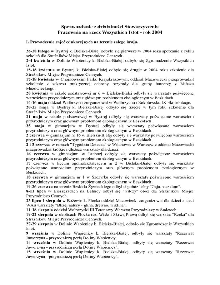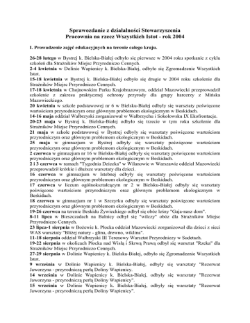 Sprawozdanie z działalności Stowarzyszenia Pracownia na rzecz Wszystkich Istot - rok 2004 I. Prowadzenie zajęć edukacyjnych na terenie całego kraju. 26-28 lutego w Bystrej k. Bielska-Białej odbyło się pierwsze w 2004 roku spotkanie z cyklu szkoleń dla StraŜników Miejsc Przyrodniczo Cennych. 2-4 kwietnia w Dolinie Wapienicy k. Bielska-Białej, odbyło się Zgromadzenie Wszystkich Istot. 15-18 kwietnia w Bystrej k. Bielska-Białej odbyło się drugie w 2004 roku szkolenie dla StraŜników Miejsc Przyrodniczo Cennych. 17-18 kwietnia w Chojnowskim Parku Krajobrazowym, oddział Mazowiecki przeprowadził szkolenie z zakresu praktycznej ochrony przyrody dla grupy harcerzy z Mińska Mazowieckiego. 20 kwietnia w szkole podstawowej nr 6 w Bielsku-Białej odbyły się warsztaty poświęcone wartościom przyrodniczym oraz głównym problemom ekologicznym w Beskidach. 14-16 maja oddział Wałbrzyski zorganizował w Wałbrzychu i Sokołowsku IX Ekofrontacje. 20-23 maja w Bystrej k. Bielska-Białej odbyło się trzecie w tym roku szkolenie dla StraŜników Miejsc Przyrodniczo Cennych. 21 maja w szkole podstawowej w Bystrej odbyły się warsztaty poświęcone wartościom przyrodniczym oraz głównym problemom ekologicznym w Beskidach. 25 maja w gimnazjum w Bystrej odbyły się warsztaty poświęcone wartościom przyrodniczym oraz głównym problemom ekologicznym w Beskidach. 2 czerwca w gimnazjum nr 16 w Bielsku-Białej odbyły się warsztaty poświęcone wartościom przyrodniczym oraz głównym problemom ekologicznym w Beskidach. 2 i 3 czerwca w ramach "Tygodnia Dziecka" w Wilanowie w Warszawie oddział Mazowiecki przeprowadził krótkie i dłuŜsze warsztaty dla dzieci. 16 czerwca w gimnazjum w Istebnej odbyły się warsztaty poświęcone wartościom przyrodniczym oraz głównym problemom ekologicznym w Beskidach. 17 czerwca w liceum ogólnokształcącym nr 2 w Bielsku-Białej odbyły się warsztaty poświęcone wartościom przyrodniczym oraz głównym problemom ekologicznym w Beskidach. 18 czerwca w gimnazjum nr 1 w Szczyrku odbyły się warsztaty poświęcone wartościom przyrodniczym oraz głównym problemom ekologicznym w Beskidach. 19-26 czerwca na terenie Beskidu śywieckiego odbył się obóz leśny "Gaja-nasz dom". 8-11 lipca w Bieszczadach na Balnicy odbył się "wilczy" obóz dla StraŜników Miejsc Przyrodniczo Cennych. 23 lipca-1 sierpnia w BoŜewie k. Płocka oddział Mazowiecki zorganizował dla dzieci z sieci WAS warsztaty "BliŜej natury - glina, drewno, wiklina". 11-18 sierpnia oddział Wałbrzyski III Terenowy Warsztat Przyrodniczy w Sudetach. 19-22 sierpnia w okolicach Płocka nad Wisłą i Skrwą Prawą odbył się warsztat "Rzeka" dla StraŜników Miejsc Przyrodniczo Cennych. 27-29 sierpnia w Dolinie Wapienicy k. Bielska-Białej, odbyło się Zgromadzenie Wszystkich Istot. 9 września w Dolinie Wapienicy k. Bielska-Białej, odbyły się warsztaty "Rezerwat Jaworzyna - przyrodniczą perłą Doliny Wapienicy. 14 września w Dolinie Wapienicy k. Bielska-Białej, odbyły się warsztaty "Rezerwat Jaworzyna - przyrodniczą perłą Doliny Wapienicy". 15 września w Dolinie Wapienicy k. Bielska-Białej, odbyły się warsztaty "Rezerwat Jaworzyna - przyrodniczą perłą Doliny Wapienicy". 16-19 września w Puszczy Białowieskiej odbył się warsztat "Las" dla StraŜników Miejsc Przyrodniczo Cennych. 17 września w Dolinie Wapienicy k. Bielska-Białej, odbyły się warsztaty "Rezerwat Jaworzyna - przyrodniczą perłą Doliny Wapienicy". 21 września w Dolinie Wapienicy k. Bielska-Białej, odbyły się warsztaty "Rezerwat Jaworzyna - przyrodniczą perłą Doliny Wapienicy". 22 września w Dolinie Wapienicy k. Bielska-Białej, odbyły się warsztaty "Rezerwat Jaworzyna - przyrodniczą perłą Doliny Wapienicy". 23 września w Budzowie i Zembrzycach k. Suchej Beskidzkiej, odbyły się warsztaty przyrodnicze poświęcone wartościom i ochronie Beskidóww. 30 września w Dolinie Wapienicy k. Bielska-Białej, odbyły się warsztaty "Rezerwat Jaworzyna - przyrodniczą perłą Doliny Wapienicy". 13-14 października w Bystrej k. Bielska-Białej odbyły się warsztaty dla uczniów gimnazjum z Wrocławia. 26-28 listopada na Koziej Górze koło Bystrej odbyło się Zgromadzenie Wszystkich Istot. 9-12 grudnia w Bystrej k. Bielska-Białej odbyło się pierwsze z nowego cyklu szkolenie dla StraŜników Miejsc Przyrodniczo Cennych. II. Prowadzenie działalności wydawniczej. W 2004 roku wydaliśmy 10 numerów miesięcznika Dzikie śycie. W lutym wydaliśmy ksiąŜkę "Muzyczne Dzikie śycie". We wrześniu wydaliśmy ksiąŜka Tomasza Boreckiego - "Prawda w sporze o Tatry". We wrześniu wydaliśmy ksiąŜka Aldo Leopold "Zapiski z Piaszczystej Krainy". III. Działania na rzecz ochrony przyrody. 7 stycznia w Bystrej odbyło się spotkanie z Włodzimierzem Jankowskim specjalistą SGS firmy certyfikującej gospodarkę leśną RDLP Katowice pod względem jej zgodności ze standardami gospodarki proekologicznej. 15 stycznia w Katowicach odbyło się posiedzenie Wojewódzkiej Komisji Ochrony Przyrody woj. śląskiego, w której pracach uczestniczy nasz przedstawiciel. Burzliwa dyskusja, jaka wywiązała się wśród członków WKOP dotyczyła planów ochrony dla rezerwatów przyrody m.in. Pilsko, Romanka. 17-18 stycznia w schronisku na Balnicy w Bieszczadach nasi aktywiści spotkali się z członkami słowackiej organizacji Vlk. Pracownia zamierza wspólnie ze Słowakami wykupić cenny przyrodniczo teren 18-nasto hektarową łąkę połoŜoną przy słowackim rezerwacie Udawa. 21 stycznia członkowie oddziału Północno-Wschodniego odbyli wizję terenową nad doliną Rospudy. 23 stycznia odział Północno-Wschodni zaaranŜował w Augustowie spotkanie przedstawicieli rolników z przedstawicielami Banku Światowego. 12 lutego w Katowicach odbyło się posiedzenie Wojewódzkiej Komisji Ochrony Przyrody woj. śląskiego, w której pracach uczestniczy nasz przedstawiciel. Przedmiotem obrad był program M