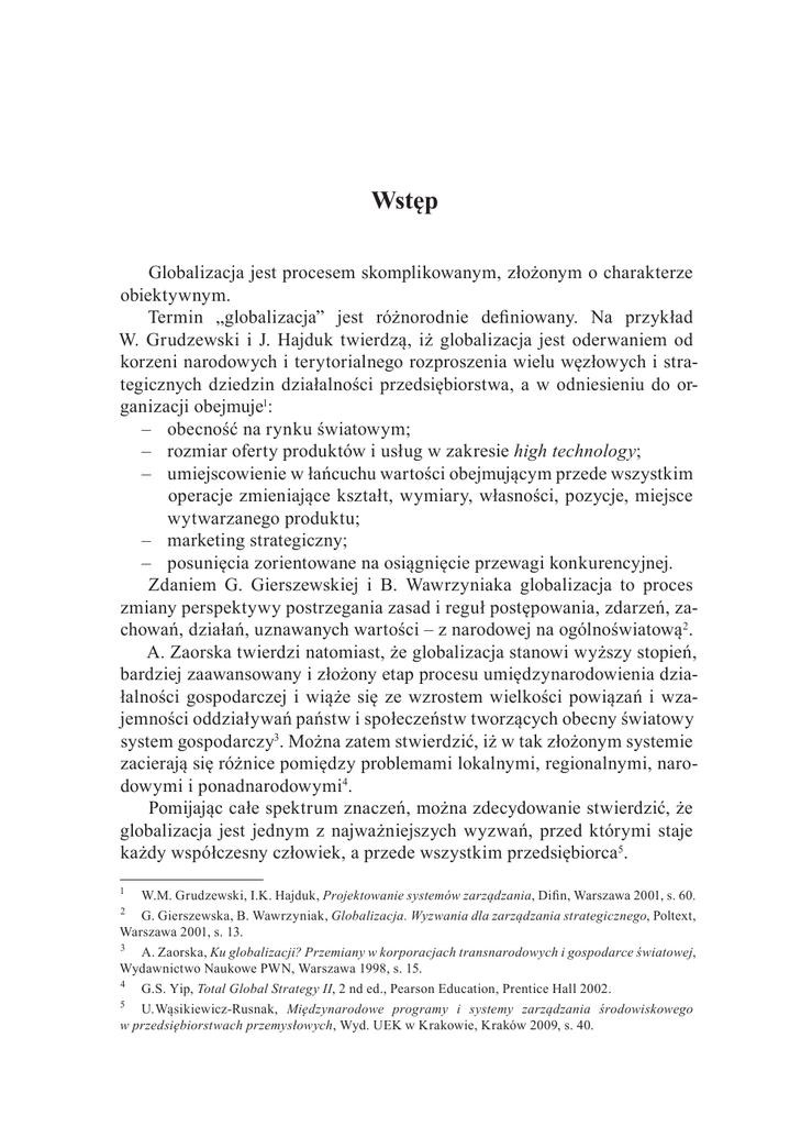Wstęp Globalizacja jest procesem skomplikowanym, złożonym o charakterze obiektywnym. Termin „globalizacja” jest różnorodnie definiowany. Na przykład W. Grudzewski i J. Hajduk twierdzą, iż globalizacja jest oderwaniem od korzeni narodowych i terytorialnego rozproszenia wielu węzłowych i strategicznych dziedzin działalności przedsiębiorstwa, a w odniesieniu do organizacji obejmuje1: – obecność na rynku światowym; – rozmiar oferty produktów i usług w zakresie high technology; – umiejscowienie w łańcuchu wartości obejmującym przede wszystkim operacje zmieniające kształt, wymiary, własności, pozycje, miejsce wytwarzanego produktu; – marketing strategiczny; – posunięcia zorientowane na osiągnięcie przewagi konkurencyjnej. Zdaniem G. Gierszewskiej i B. Wawrzyniaka globalizacja to proces zmiany perspektywy postrzegania zasad i reguł postępowania, zdarzeń, zachowań, działań, uznawanych wartości – z narodowej na ogólnoświatową2. A. Zaorska twierdzi natomiast, że globalizacja stanowi wyższy stopień, bardziej zaawansowany i złożony etap procesu umiędzynarodowienia działalności gospodarczej i wiąże się ze wzrostem wielkości powiązań i wzajemności oddziaływań państw i społeczeństw tworzących obecny światowy system gospodarczy3. Można zatem stwierdzić, iż w tak złożonym systemie zacierają się różnice pomiędzy problemami lokalnymi, regionalnymi, narodowymi i ponadnarodowymi4. Pomijając całe spektrum znaczeń, można zdecydowanie stwierdzić, że globalizacja jest jednym z najważniejszych wyzwań, przed którymi staje każdy współczesny człowiek, a przede wszystkim przedsiębiorca5. 1 W.M. Grudzewski, I.K. Hajduk, Projektowanie systemów zarządzania, Difin, Warszawa 2001, s. 60. 2 G. Gierszewska, B. Wawrzyniak, Globalizacja. Wyzwania dla zarządzania strategicznego, Poltext, Warszawa 2001, s. 13. 3 A. Zaorska, Ku globalizacji? Przemiany w korporacjach transnarodowych i gospodarce światowej, Wydawnictwo Naukowe PWN, Warszawa 1998, s. 15. 4 5 G.S. Yip, Total Global Strategy II, 2 nd ed., Pearson Education, Prentice Hall 2002. U.Wąsikiewicz-Rusnak, Międzynarodowe programy i systemy zarządzania środowiskowego w przedsiębiorstwach przemysłowych, Wyd. UEK w Krakowie, Kraków 2009, s. 40. Wstęp Zarządzanie współczesnym przedsiębiorstwem z perspektywy globalizacji, stwarza konieczność budowania nowego podejścia strategicznego. W takiej bowiem sytuacji wydaje się słusznym przyjmowanie podejścia, iż nie można z góry pozbawiać jednostki gospodarczej możliwości rozwoju z tegoż powodu, że nie uwzględnimy sił i czynników globalizacji, które mają ogromny wpływ na funkcjonowanie podmiotów gospodarczych o charakterze lokalnym czy regionalnym. Zdaniem G. Stonehouse’a zagadnienia globalnej i transnarodowej strategii oraz zarządzania strategicznego obejmują6: 1. Strategię globalną i transnarodową, gdzie wyróżniamy: – strategię globalną i transnarodową, – globalną/transnarodową obsługę marketingową, – strategię wobec filii. 2. Zarządzanie globalne i transnarodowe, do którego należą: – zarządzanie zasobami ludzkimi, – zarządzanie produkcją i logistyką w skali globalnej, – zarządzanie technologią w skali globalnej, – zarządzanie marketingiem, – zarządzanie finansami, – struktura organizacyjna i kontrola globalna. Przyjęcie transnarodowej i globalnej strategii powinno pomóc organizacji gospodarczej określać jak postrzega ona swoją pozycję w otoczeniu globalnym, a także w jaki sposób winny być formułowane jej strategie. Transnarodowa obsługa marketingowa winna określać standardy obsługi klientów na rynku globalnym. W jej ramach powinno się także monitorować rynek i reakcje na zmiany jakie w nim zachodzą. Strategia wobec filii, polega na budowie odpowiedzialnej struktury umożliwiającej monitorowanie oddziałów organizacji zlokalizowanych w różnych częściach świata. Zarządzanie zasobami ludzkimi w skali globalnej stwarza możliwość opracowania takiej polityki, która umożliwia bezproblemową zmianę kraju zamieszkania oraz powoływania globalnych menedżerów. Zarządzanie produkcją i logistyką powinno umożliwiać określenie zasad zarządzania głównymi działaniami, które ukierunkowane być powinny na uzyskanie wartości dodanej poprzez planowanie i realizację produkcji w skali globalnej, tworzenie globalnych łańcuchów logistycznych, przy uwzględnieniu lokalizacji przedsiębiorstw produkcyjnych, a w końcu organizację globalnych zamówień (np. zamiast dla pojedynczego oddziału 6 G. Stonehouse, et.al. red. wyd. pol. G. Gierszewska, Globalizacja. Strategia i zarządzanie. Fielberg SJA, Warszawa 2001, s. 10. 8 Wstęp organizacja zakupów dla całej grupy, dająca możliwość wynegocjowania preferencji ceny). Zarządzanie technologią w skali globalnej, polega przede wszystkim na wymianie doświadczeń a także na tworzeniu systemów rozwoju mających służyć całej organizacji, a nie tylko jej poszczególnym jednostkom składowym. W ramach zarządzania globalnego i transnarodowego powinno się także realizować marketing międzynarodowy oraz segmentację i pozycjonowanie na rynkach globalnych. Bardzo istotnym a zarazem dość trudnym elementem zarządzania globalnego do realizacji w praktyce jest zarządzanie finansami. W ramach jego realizacji powinno się uwzględniać: ryzyko kursowe, wycenę transferu, budowanie konkurencyjności globalnej. Struktura organizacyjna i kontrola globalna określają jaki kształt przyjmie organizacja zarówno dla jak również podczas realizacji stawianych sobie celów strategicznych. Bardzo ważne znaczenie odgrywa tutaj kultura organizacyjna, która tworzona jest przez wspólne założenia, wartości, postawy pracowników jak również menedżerów. Celem głównym niniejszego opracowania jest „analiza i ocena najnowszych trendów w rozwoju zarządzania z uwzględnieniem jego
