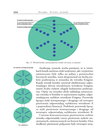 244 Enigma. Bliżej prawdy Rys. 15. Wirnik bomby sześcioznakowej (widok od strony ze stykami) Analizując rysunek, trzeba pamiętać, że w wirnikach bomb zarówno styki wejściowe, jak i wyjściowe umieszczone były tylko na jednej z powierzchni bocznych wirnika, toteż dysponował on liczbą styków podwojoną w stosunku do wirnika Enigmy. Każdy wirnik bomby zawierał okablowanie odpowiadające dwom niezależnym wirnikom Enigmy, zatem liczba styków ulegała kolejnemu podwojeniu. Opisy na rysunku obok zakładają umieszczenie wirnika w bombie w najwyższym rzędzie, odpowiadającym szybkim wirnikom Enigmy. Przewody łączące styki zewnętrznego i drugiego od zewnątrz pierścienia odpowiadają szybkiemu wirnikowi A z poprzedniej ilustracji. Podobnie przewody łączące styki pierścienia wewnętrznego i drugiego od wewnątrz odpowiadają szybkiemu wirnikowi B. Czterem koncentrycznym pierścieniom styków wirnika odpowiadały cztery pierścienie styków stacjonarnych, umieszczonych na froncie bomby. Dwa środkowe pierścienie połączone były wewnątrz urzą- Bomby 245 Ramka 11 Zasada działania bomby Turinga-Welchmana W opisie bomby wspomnieliśmy o dwóch elementach, które nie zostały przedstawione w szczegółach: tablicy diagonalnej Welchmana i rejestrze testowym. Ich sposób funkcjonowania jest ściśle powiązany z wewnętrzną konstrukcją bomby i ukaże się niejako samoistnie w trakcie omawiania konstrukcji urządzenia, którą przedstawimy poniżej. Prezentacja oparta na rzeczywistej konstrukcji bomby byłaby nieczytelna, posłużymy się zatem przykładem uproszczonym – bombą służącą do łamania szyfru znanej z wcześniejszych przykładów Enigmy sześcioznakowej. Jedyną różnicą pomiędzy urządzeniem rzeczywistym i przykładowym jest odmienna liczba styków w wirnikach i łączących je przewodów. Dla potrzeb przykładu niezbędna jest ściąga odpowiednia dla sześcioznakowej Enigmy. Załóżmy, że ma ona postać: pozycja tekst jawny szyfrogram 012345 ABECAD CADEEB Na podstawie powyższej ściągi można skonstruować następujący cykl: Zasadniczą częścią konstrukcji bomby, ukrytą przed okiem operatora wewnątrz obudowy, są wiązki kabli w liczbie równej liczbie liter alfabetu maszyny szyfrującej, z których każda zawiera takąż liczbę przewodów (dla sześcioznakowej Enigmy mamy 6 wiązek po 6 przewodów). Wiązki te, podobnie jak wejścia i wyjścia mieszaczy, są dostępne dla operatora za pośrednictwem gniazd na tylnej ścianie urządzenia. Załóżmy, że oznaczymy wiązki dużymi literami alfabetu (A,…, F), a przewody w każdej wiązce – małymi (a,…,f). Przygotowując bombę do sprawdzenia menu, włączamy mieszacze pomiędzy wiązki (A…F) zgodnie ze strukturą cykli zawartych w menu: ciąg dalszy na stronie 247 246 Enigma. Bliżej prawdy dzenia z zewnętrznymi pierścieniami styków wirnika umieszczonego w kolejnym rzędzie poniżej. Zewnętrzny i wewnętrzny pierścień styków szybkiego wirnika były połączone z gniazdami umieszczonymi na tylnej ścianie urządzenia – w panelu konfiguracyjnym. Gniazda można było łączyć 26-żyłowymi przewodami z gniazdami odpowiadającymi innym odpowiednikom Enigmy; wyjście jednej maszyny z wejściem innej itd. Zestaw wirników, których wejścia i wyjścia były dostępne poprzez gniazdo na tylnej ścianie bomby, nosił w żargonie BP miano dwustronnego mieszacza (double-ended scrambler)*. Dodatkowo częścią mieszacza był reflektor, który w bombie przyjmował postać wiązki kabli łączących styki wirnika wolnego A i B. Mieszacz był w istocie równoważnikiem jednej maszyny szyfrującej Enigma, bez uwzględnienia łącznicy. Typowa bomba, począwszy od Agnus Dei, zawierała 3 banki, z których każdy składał się z 12 mieszaczy i stanowiła odpowiednik 36 maszyn szyfrujących. Znajomość konstrukcji bomby pozwala powrócić do cykli i opisać sposób użycia urządzenia. Przypomnijmy pochodzący z wcześniejszego przykładu (por. rys. na stronie 168) fragment diagramu przekształceń pomiędzy prawdopodobnym tekstem jawnym depeszy i odpowiadającym mu szyfrogramem, ograniczając zainteresowanie do zidentyfikowanych w nim cykli. Rys. 16. Cykl w szyfrogramie Diagram wskazuje, że w drugiej i czwartej pozycji szyfrogramu następuje przekształcenie litery E tekstu jawnego w literę J szyfrogramu, w pozycji trzeciej – litery J w literę L itd. Strzałki w diagramie obrazują przekształcenia znaków tekstu jawnego w znaki szyfrogramu. Pamiętamy jednak, że szyfr Enigmy jest samoodwrotny: jeśli w danej pozycji maszyny X przekształcane jest w Y, to zarazem Y przechodzi w X. Ta –––––––––––––– * Kiedy w późniejszym okresie do budowy bomb przystąpili także Amerykanie, do opisania zestawu wirników używali terminu „komutator” (commutator). Bomby 247 W przykładowym menu przejście od znaku A do C następuje w pozycji zerowej szyfrogramu. W konfiguracji bomby tej sytuacji odpowiada włączenie pomiędzy wiązki A oraz C mieszacza znajdującego się w pozycji zerowej (np. AAA). Przejście od litery C do E następuje w trzeciej pozycji szyfrogramu, toteż pomiędzy wiązki C oraz E włączamy mieszacz przesunięty o trzy pozycje w stosunku do poprzedniego (AAD); analogicznie konfigurujemy pozostałe mieszacze. Przed uruchomieniem bomby należy podłączyć dowolnie wybrany przewód w jednej z wiązek wchodzących w skład menu do źródła napięcia – załóżmy, że wybieramy w tym celu przewód b wiązki A (oznaczając go jako Ab). Jednocześnie tę samą wiązkę przewodów podłączamy do rejestru testowego, którego zadaniem jest wykrycie warunku zatrzymania bomby – tak przygotowana bomba jest gotowa do uruchomienia. Rysunek ilustruje stan bomby w jednej z pozycji w trakcie testowania menu: Pogrubioną linią zaznaczono przewody, które w danym położeniu wirników posiadają połączenie z przewodem Ab i w konsekwencji – ze źró