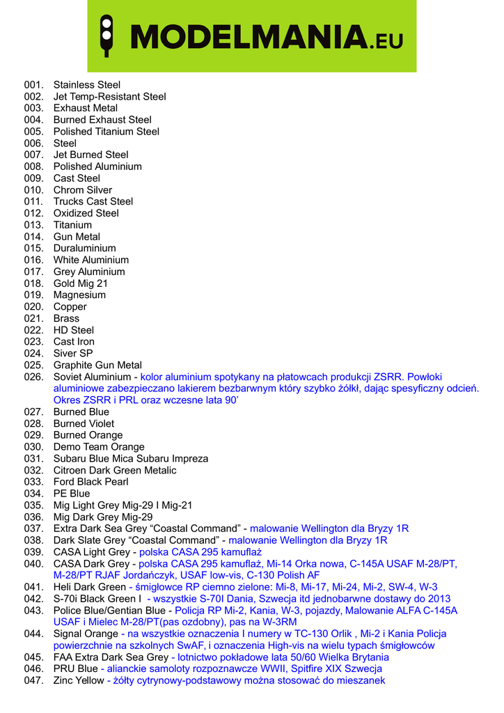 001. 002. 003. 004. 005. 006. 007. 008. 009. 010. 011. 012. 013. 014. 015. 016. 017. 018. 019. 020. 021. 022. 023. 024. 025. 026. 027. 028. 029. 030. 031. 032. 033. 034. 035. 036. 037. 038. 039. 040. 041. 042. 043. 044. 045. 046. 047. Stainless Steel Jet Temp-Resistant Steel Exhaust Metal Burned Exhaust Steel Polished Titanium Steel Steel Jet Burned Steel Polished Aluminium Cast Steel Chrom Silver Trucks Cast Steel Oxidized Steel Titanium Gun Metal Duraluminium White Aluminium Grey Aluminium Gold Mig 21 Magnesium Copper Brass HD Steel Cast Iron Siver SP Graphite Gun Metal Soviet Aluminium - kolor aluminium spotykany na płatowcach produkcji ZSRR. Powłoki aluminiowe zabezpieczano lakierem bezbarwnym który szybko żółkł, dając spesyficzny odcień. Okres ZSRR i PRL oraz wczesne lata 90’ Burned Blue Burned Violet Burned Orange Demo Team Orange Subaru Blue Mica Subaru Impreza Citroen Dark Green Metalic Ford Black Pearl PE Blue Mig Light Grey Mig-29 I Mig-21 Mig Dark Grey Mig-29 Extra Dark Sea Grey “Coastal Command” - malowanie Wellington dla Bryzy 1R Dark Slate Grey “Coastal Command” - malowanie Wellington dla Bryzy 1R CASA Light Grey - polska CASA 295 kamuflaż CASA Dark Grey - polska CASA 295 kamuflaż, Mi-14 Orka nowa, C-145A USAF M-28/PT, M-28/PT RJAF Jordańczyk, USAF low-vis, C-130 Polish AF Heli Dark Green - śmigłowce RP ciemno zielone: Mi-8, Mi-17, Mi-24, Mi-2, SW-4, W-3 S-70i Black Green I - wszystkie S-70I Dania, Szwecja itd jednobarwne dostawy do 2013 Police Blue/Gentian Blue - Policja RP Mi-2, Kania, W-3, pojazdy, Malowanie ALFA C-145A USAF i Mielec M-28/PT(pas ozdobny), pas na W-3RM Signal Orange - na wszystkie oznaczenia I numery w TC-130 Orlik , Mi-2 i Kania Policja powierzchnie na szkolnych SwAF, i oznaczenia High-vis na wielu typach śmigłowców FAA Extra Dark Sea Grey - lotnictwo pokładowe lata 50/60 Wielka Brytania PRU Blue - alianckie samoloty rozpoznawcze WWII, Spitfire XIX Szwecja Zinc Yellow - żółty cytrynowy-podstawowy można stosować do mieszanek 048. 049. 050. 051. 052. 053. 054. 055. 056. 057. 058. 059. 060. 061. 062. 063. 064. 065. 066. 067. 068. 069. 070. 071. 072. 073. 074. 075. 076. 077. 078. 079. 080. 081. 082. 083. 084. 085. 086. 087. 088. 089. 090. 091. 092. 093. 094. 095. 096. 097. 098. Signal Red - Lotnictwo SAR, Cost Guard, Straż Graniczna Pure Orange - sprzęt techniczny na lotniskach Black Signal White Trafic Orange - US Cost Guard - Alaska Brown Red - Su-22M4 polskie, okręty pod linią wodną Deck Green M-28 - samoloty M-28 kamuflaż, Kraków, Radom, Powidz An-26 z białymi nr bocznymi/niebieski z dołu Olive Green M-28 - samoloty M-28 kamuflaż Kraków, Radom, Powidz An-26 z białymi nr bocznymi/niebieski z dołu Sand M-28 - samoloty M-28 kamuflaż, Kraków, Radom, Powidz An-26 z białymi nr bocznymi/niebieski z dołu Copper Brown - lotnictwo polskie 80-90 Su-22 i Lim’y inne Blutorange Light Blue Grey-Błękitek I - Mi-8 MTV Marynarka Wojenne RP Dark Blue Grey-Błękitek II - Mi-8 MTV Marynarka Wojenna RP Brown - lotnictwo polskie 80-90 Su-22, Mig-23 i Lim’y i inne Mid Brown - lotnictwo polskie 80-90 Su-22 i Lim’y Black Olive 7 - lotnictwo polskie An-2, Su-22, Su-20, Mi Olive Green 6 - polskie An-2 i Su Olive Drab 5 - polskie An-2 i Su Mig Interior Green 4 - wnętrza do samolotów Mig-221 I 23, tablice do śmigłowców Mil Interior Grey 3 - wnętrza do polskich śmigłowców , klapy, spody Mi-2 Aircraft Light Blue 2 - spody polskich samolotów i śmigłowców Aircraft Mid Blue 1 - spody i boki - polskie lotnictwo i śmigłowce Khaki Grey - 36 SPLT Bryza i inne polskie samoloty i śmigłowce Pastel Blue - 36 SPLT Bryza I inne polskie samoloty i śmigłowce (Mi-14 dół) Dark Ad Grey - 36 SPLT Bryza I inne polskie samoloty i śmigłowce Light Green - 36 SPLT Bryza, inne polskie samoloty i śmigłowce Light Blue PZL - malowanie ALFA pasy, sanitarne(wraz z żółtym), wczesny Aeroflot lata 50/60 Sapphire Blue PZL - malowanie ALFA od dołu , Orlik SP-PPC, An-26 z PRL i wczesne LWP, Jak-40 Signal Green PZL - SP-DDA “Skytruck” White PZL Traffic Red PZL Night Blue PZL - od dołu SP-DDA( Papuga ), wczesny Aeroflot Traffic Blue PZL - pasy ozdobne SP-DDA , malowanie An-24/26 28 typ-LOT Sky Blue PZL - pasy ozdobne na SP-DDA, wczesny Aeroflot lata 50/60 PLL LOT Dark Blue - współczesny LOT Dark Ghost Grey Nose Cone Dark Gray - do osłon radarów Milka-Purple - Ju-52 I An-2 z krową Soviet Cargo Grey - typowy kolor dla lotnictwa transportowego epoki Układu Warszawskiego. Stosowany na naszych transportowcach. Mexican Police Blue - Federalna Policja Meksyk Lotnictwo An-2 Cream - podstawowy kolor stosowany w WSK Mielec Aeroflot Dark Grey Mi-14 Azurblue - kamuflaż Mi-14 Grey-Green - kamuflaż Mi-14 Orka Light Grey (1001) - nowa Orka LPR-Yellow - śmigłowce EC-135 Lotniczego Pogotowia Ratunkowego Soviet Chromate Yellow - podkładówka dla LWP i obecnie Polish Green (LWP) - zielony dla lotnictwa LWP Fire Red - Straż Pożarna LPR Antracyt LPR Blue