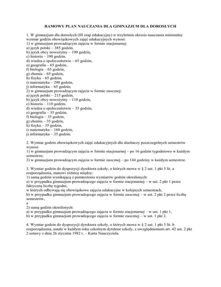 RAMOWY PLAN NAUCZANIA DLA GIMNAZJUM DLA DOROSŁYCH 1. W gimnazjum dla dorosłych (III etap edukacyjny) w trzyletnim okresie nauczania minimalny wymiar godzin obowiązkowych zajęć edukacyjnych wynosi: 1) w gimnazjum prowadzącym zajęcia w formie stacjonarnej: a) język polski – 385 godzin, b) język obcy nowożytny – 190 godzin, c) historia – 190 godzin, d) wiedza o społeczeństwie – 65 godzin, e) geografia – 65 godzin, f) biologia – 65 godzin, g) chemia – 65 godzin, h) fizyka – 65 godzin, i) matematyka – 290 godzin, j) informatyka – 65 godzin; 2) w gimnazjum prowadzącym zajęcia w formie zaocznej: a) język polski – 215 godzin, b) język obcy nowożytny – 110 godzin, c) historia – 110 godzin, d) wiedza o społeczeństwie – 35 godzin, e) geografia – 35 godzin, f) biologia – 35 godzin, g) chemia – 35 godzin, h) fizyka – 35 godzin, i) matematyka – 160 godzin, j) informatyka – 35 godzin. 2. Wymiar godzin obowiązkowych zajęć edukacyjnych dla słuchaczy poszczególnych semestrów wynosi: 1) w gimnazjum prowadzącym zajęcia w formie stacjonarnej – po 16 godzin tygodniowo w każdym semestrze; 2) w gimnazjum prowadzącym zajęcia w formie zaocznej – po 144 godziny w każdym semestrze. 3. Wymiar godzin do dyspozycji dyrektora szkoły, o których mowa w § 2 ust. 1 pkt 5 lit. a rozporządzenia, stanowi różnicę między: 1) sumą godzin wynikającą z pomnożenia wymiarów godzin określonych: a) w przypadku gimnazjum prowadzącego zajęcia w formie stacjonarnej – w ust. 2 pkt 1 przez faktyczną liczbę tygodni, w których odbywają się obowiązkowe zajęcia edukacyjne w kolejnych semestrach, b) w przypadku gimnazjum prowadzącego zajęcia w formie zaocznej – w ust. 2 pkt 2 przez liczbę semestrów, a 2) sumą godzin określonych: a) w przypadku gimnazjum prowadzącego zajęcia w formie stacjonarnej – w ust. 1 pkt 1, b) w przypadku gimnazjum prowadzącego zajęcia w formie zaocznej – w ust. 1 pkt 2. 4. Wymiar godzin do dyspozycji dyrektora szkoły, o których mowa w § 2 ust. 1 pkt 5 lit. b rozporządzenia, ustala w każdym roku szkolnym dyrektor szkoły, z uwzględnieniem art. 42 ust. 2 pkt 2 ustawy z dnia 26 stycznia 1982 r. – Karta Nauczyciela.