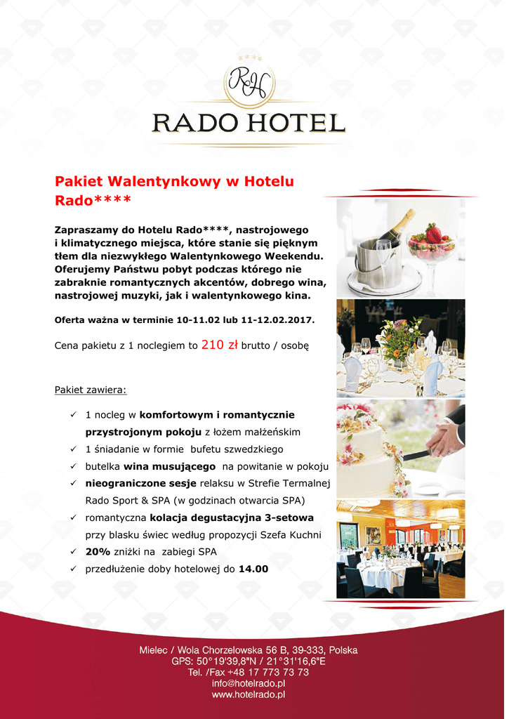 Pakiet Walentynkowy w Hotelu Rado**** Zapraszamy do Hotelu Rado****, nastrojowego i klimatycznego miejsca, które stanie się pięknym tłem dla niezwykłego Walentynkowego Weekendu. Oferujemy Państwu pobyt podczas którego nie zabraknie romantycznych akcentów, dobrego wina, nastrojowej muzyki, jak i walentynkowego kina. Oferta ważna w terminie 10-11.02 lub 11-12.02.2017. Cena pakietu z 1 noclegiem to 210 zł brutto / osobę Pakiet zawiera: 1 nocleg w komfortowym i romantycznie przystrojonym pokoju z łożem małżeńskim 1 śniadanie w formie bufetu szwedzkiego butelka wina musującego na powitanie w pokoju nieograniczone sesje relaksu w Strefie Termalnej Rado Sport & SPA (w godzinach otwarcia SPA) romantyczna kolacja degustacyjna 3-setowa przy blasku świec według propozycji Szefa Kuchni 20% zniżki na zabiegi SPA przedłużenie doby hotelowej do 14.00 Na specjalne życzenie zagwarantujemy Państwu także dodatkowe usługi: bukiet ulubionych kwiatów dla ukochanej, tort z okazji rocznicy i wiele innych…. Transport w obie strony Mielec – Hotel Rado – Mielec koszt 20 PLN Prosimy o wcześniejszą rezerwację dodatkowych atrakcji oraz zabiegów SPA * możliwość zamiany standardowego pokoju na apartament Oferta ważna do 12.02.2017 r.