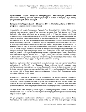 Baka przeciwko Węgrom (wyrok – 23 czerwca 2016 r., Wielka Izba, skarga nr 20261/12 – przyjęta do rozpatrzenia na wniosek rządu) 1 Wprowadzenie nowych przepisów konstytucyjnych oznaczających przedwczesne zakończenie kadencji prezesa Sądu Najwyższego w reakcji na krytykę z jego strony przeprowadzanych reform prawnych Baka przeciwko Węgrom (wyrok – 23 czerwca 2016 r., Wielka Izba, skarga nr 20261/12 – przyjęta do rozpatrzenia na wniosek rządu) András Baka, były sędzia Europejskiego Trybunału Praw Człowieka (1991-2008), w 2009 r. został wybrany przez parlament węgierski na stanowisko prezesa Sądu Najwyższego na 6 letnią kadencję, która miała zakończyć się w czerwcu 2015 r. W tym charakterze był również przewodniczącym Krajowej Rady Sądownictwa (KRS) i miał prawny obowiązek wypowiadać się na temat projektów ustaw mających wpływ na wymiar sprawiedliwości. W okresie między lutym i listopadem 2011 r. A. Baka skrytykował niektóre reformy prawne, w tym propozycję obniżenia wieku emerytalnego sędziów z 70 do 62 lat. Wyrażał swoje opinie za pośrednictwem rzecznika, w publicznych listach i komunikatach prasowych, jak również w wystąpieniu w parlamencie. Od kwietnia 2010 r. na Węgrzech została podjęta reforma konstytucyjna. W jej rezultacie w grudniu 2011 r. zostały przyjęte przepisy przejściowe do nowej konstytucji węgierskiej przewidujące, że następcą prawnym Sądu Najwyższego będzie Kúria (historyczna nazwa Sądu Najwyższego) a kadencja prezesa Sądu Najwyższego zakończy się wraz z wejściem w życie Ustawy Zasadniczej. W rezultacie stało się to 1 stycznia 2012 r., a więc 3,5 roku przed upływem normalnej kadencji. A. Baka utracił wynagrodzenie, do jakiego był uprawniony jako prezes Sądu Najwyższego oraz niektóre świadczenia przysługujące po zaprzestaniu pełnienia tej funkcji. Zgodnie z kryteriami wyboru prezesa Kúrii, kandydaci muszą mieć przynajmniej pięcioletnie doświadczenie sędziowskie na Węgrzech. Okres pełnienia funkcji sędziego sądu międzynarodowego nie jest brany pod uwagę. To spowodowało, że A. Baka nie spełniał nowych kryteriów ubiegania się o urząd prezesa Kúrii. W grudniu 2011 r. parlament wybrał Pétera Daráka na prezesa Kúrii a Tünde Handó na przewodniczącego Krajowej Rady Sądownictwa. Baka pozostał w Kúrii jako zwykły sędzia. W skardze do Trybunału A. Baka zarzucił w szczególności, że został pozbawiony dostępu do sądu z powodu tego, że wymóg wcześniejszego zakończenia kadencji prezesa został wpisany do Ustawy Zasadniczej i w rezultacie nie mógł stać się przedmiotem kontroli sądowej nawet przez Trybunał Konstytucyjny (art.6 Konwencji). Twierdził również, że odwołanie było rezultatem publicznie wyrażanej przez niego krytyki polityki rządu dotyczącej reformy sądownictwa (art.10). 27 maja 2014r., Izba (Sekcja II) wydała wyrok, w którym jednogłośnie uznała, iż doszło do naruszenia art. 6 ust. 1 i art. 10 Konwencji. Sprawa została przyjęta do rozpatrzenia przez Wielką Izbę na wniosek rządu. W tym przypadku przedwczesne zakończenie kadencji skarżącego jako prezesa Sądu Najwyższego nie zostało skontrolowane przez zwykły sąd ani inne ciało sprawujące władzę OPRACOWANIE MAREK ANTONI NOWICKI 2 Baka przeciwko Węgrom (wyrok – 23 czerwca 2016 r., Wielka Izba, skarga nr 20261/12 – przyjęta do rozpatrzenia na wniosek rządu) sądową, nie było też takiej możliwości. Brak kontroli sądowej był rezultatem ustawodawstwa, którego zgodność z wymaganiami rządów prawa budziła wątpliwości. Trybunał odnotował rosnące znaczenie, jakie dokumenty międzynarodowe i Rady Europy, podobnie, jak orzecznictwo sądów międzynarodowych oraz praktyki innych ciał międzynarodowych wiążą z rzetelnością proceduralną w przypadkach usunięcia lub odwołania sędziów. Każda decyzja mającą wpływ na zakończenie sprawowania urzędu przez sędziego, wymaga interwencji organów, które byłyby niezależne od władzy wykonawczej i ustawodawczej. Biorąc to pod uwagę, Trybunał uważał, że państwo naruszyło samą istotę prawa skarżącego dostępu do sądu zagwarantowanego w art.6 ust.1 Konwencji. W rezultacie doszło do jego naruszenia (piętnaście do dwóch). W związku z zarzutem na tle art. 10 Konwencji Trybunał uważał za konieczne przypomnienie sekwencji wydarzeń w tej sprawie. Skarżący, jako prezes Sądu Najwyższego i przewodniczący KRS publicznie wyraził swoje poglądy na temat rozmaitych reform ustawodawczych dotykających sądownictwo. 12 lutego 2011r. rzecznik skarżącego wyraził w jednej z gazet jego zaniepokojenie treścią projektu ustawy nakazującej unieważnienie ostatecznych wyroków skazujących. 24 marca 2011r. skarżący zabrał głos w parlamencie na temat niektórych aspektów projektu nowej ustawy zasadniczej Węgier. 7 kwietnia 2011r. wraz z innymi prezesami sądów zwrócił się z listem do prezydenta i premiera, w którym skrytykował propozycję zawartą w projekcie ustawy zasadniczej Węgier skrócenia wieku obowiązkowego przechodzenia przez sędziów na emeryturę. 11 kwietnia 2011r zwrócił się z listem do premiera, w którym ponownie skrytykował propozycję dotyczącą wieku emerytalnego sędziów, podkreślając, że jest poniżająca i narusza zasady niezawisłości i nieusuwalności sędziów. 14 kwietnia 2011r. skarżący jako przewodniczący KRS wraz z plenum Sądu Najwyższego i innymi prezesami sądów, wydał komunikat prasowy krytykujący ponownie nowy wiek emerytalny sędziów, jak również propozycję zmian w Krajowej Radzie Sądownictwa. W komunikacie tym znalazł się pogląd, że nowy wiek emerytalny został uregulowany w Ustawie Zasadniczej, aby uniknąć w ten sposób możliwości kontroli sądowej przez Trybunał Konstytucyjny oraz sugestia, że za tym podejściem stały motywacje polityczne. 4 sierpnia 2011r. skarżący zakwestionował niektóre nowe p