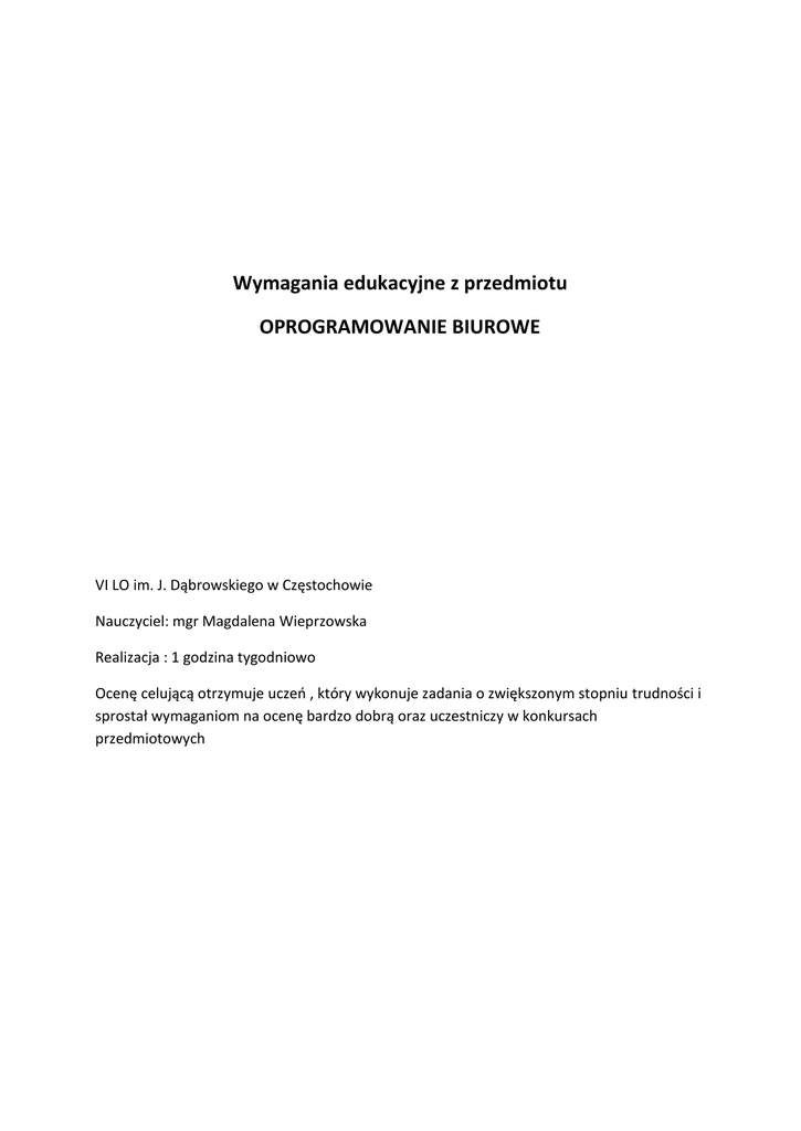 Wymagania edukacyjne z przedmiotu OPROGRAMOWANIE BIUROWE VI LO im. J. Dąbrowskiego w Częstochowie Nauczyciel: mgr Magdalena Wieprzowska Realizacja : 1 godzina tygodniowo Ocenę celującą otrzymuje uczeń , który wykonuje zadania o zwiększonym stopniu trudności i sprostał wymaganiom na ocenę bardzo dobrą oraz uczestniczy w konkursach przedmiotowych Uczeń : Zna przepisy BHP w szkolnej pracowni komputerowej Zna regulamin pracowni komputerowej dopuszcza dostający teczny X X dobry X bardzo dobry X x x x x x x x Zna podstawowe bloki komputera Zna podstawowe prawne zasady użytkowania oprogramowania x x x x Rozumie zasady funkcjonowania sieci Internet Zna podstawowe usługi sieci Internet oraz funkcje Komputerów i routerów Wie jak efektywnie gromadzić informacje w trakcie eksplorowania zasobów Potrafi efektywnie korzystać z możliwości oferowanych przez portale internetowe Potrafi efektywnie gospodarować czasem X X X X X X X X X X X X X X Zna mechanizm funkcjonowania poczty elektronicznej Potrafi samodzielnie rozwiązywać problemy związane z obsługą poczty elektronicznej X X X X zna ogólne zasady redagowania dokumentów potrafi wykonywać zaawansowane operacje na czcionkach i akapitach x X X potrafi korzystać ze stylów i modyfikować je X X X X X X X X x x potrafi napisać podanie i cv x wykorzystuje tabele i tabulatory wstawia i redaguje zależności w edytorze równań x X X Projektuje proste układy slajdów Potrafi projektować złożone sterowanie slajdami X Komponuje prezentacje wspomagające wystąpienia Zna pojęcia dotyczące zasad adresowania i umie je wykorzystywać X X x x X X Potrafi wykonywać i wiązać operacje w różnych arkuszach i skoroszytach X potrafi zaproponować optymalną interpretację graficzną dla danych z tabeli wykorzystuje arkusz kalkulacyjny jako bazę danych X X X X X x X x X X x X x x X x X X potrafi zorganizować arkusz dla właściwego korzystania z sum pośrednich zaawansowanie przekształca dane praktycznie stosuje arkusz kalkulacyjny zna podstawowe problemy zarządzania informacją wymienia dane pomiędzy edytorem tekstu a arkuszem kalkulacyjnym x importuje dane pochodzące z różnych źródeł do arkusza kalkulacyjnego X wypełnia druki zewnętrzne za pomocą korespondencji seryjnej x