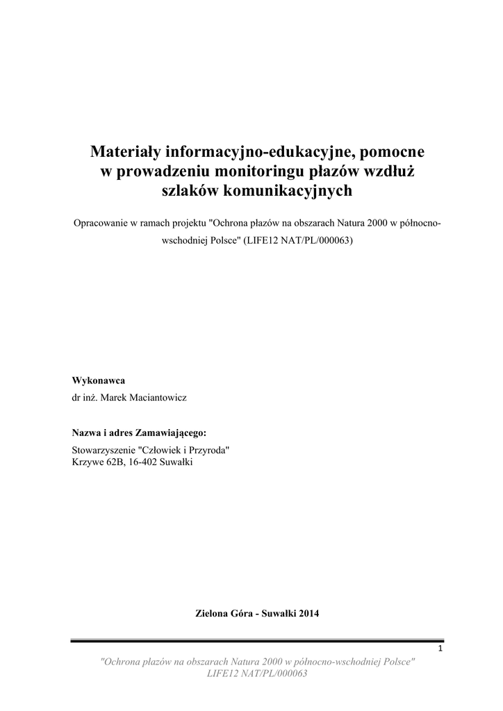Materiały informacyjno-edukacyjne, pomocne w prowadzeniu monitoringu płazów wzdłuż szlaków komunikacyjnych Opracowanie w ramach projektu "Ochrona płazów na obszarach Natura 2000 w północnowschodniej Polsce" (LIFE12 NAT/PL/000063) Wykonawca dr inż. Marek Maciantowicz Nazwa i adres Zamawiającego: Stowarzyszenie "Człowiek i Przyroda" Krzywe 62B, 16-402 Suwałki Zielona Góra - Suwałki 2014 1 "Ochrona płazów na obszarach Natura 2000 w północno-wschodniej Polsce" LIFE12 NAT/PL/000063 Spis treści I. Wstęp II. Instrukcja prowadzenia badań śmiertelności płazów na drogach II.1. Terminy prac terenowych i aktywności gatunków II.2. Badanie śmiertelności płazów II.3. Badanie wielkości migracji płazów przez drogę III. Instrukcja sporządzania dokumentacji fotograficznej IV. Instrukcja korzystania z odbiorników GPS V. Instrukcja gromadzenia i przetwarzania zebranych informacji VI. Instrukcja sposobu przekazywania danych do bazy centralnej VII. Materiały pomocnicze do rozpoznawania przynależności gatunkowej płazów VIII. Literatura 2 "Ochrona płazów na obszarach Natura 2000 w północno-wschodniej Polsce" LIFE12 NAT/PL/000063 I. Wstęp Płazy to zwierzęta amfibiotyczne, które żyją zarówno w środowisku wodnym jak i lądowym. Stąd nazywane są gatunkami ziemno-wodnymi. W Polsce występuje 18 gatunków płazów. Osobniki dorosłe najczęściej żyją na lądzie. W zbiornikach wodnych większą część roku spędzają kumaki oraz żaby: wodna, jeziorkowa i śmieszka. Żaba wodna i śmieszka są również często spotykane w rzekach. Jednak cechą wspólną wszystkich płazów jest rozród, który odbywa się wiosną w środowisku wodnym. Wówczas większość gatunków odbywa wędrówki - najczęściej z miejsc zimowania - do zbiorników rozrodczych. Z jaj składanych w wodzie rozwijają się larwy (w przypadku płazów bezogonowych nazywane kijankami), które po zakończeniu rozwoju larwalnego przeobrażają się (metamorfoza) i wychodzą na ląd. Niekiedy larwy pozostają w zbiornikach i zimują. Jesienią często odbywają się wędrówki osobników dojrzałych do miejsc zimowania. Wędrujące płazy możemy najczęściej spotkać: - podczas wiosennych wędrówek do miejsc rozrodu, - podczas opuszczania zbiorników rozrodczych przez młode osobniki (dyspersja), - podczas wędrówek jesiennych do miejsc zimowania. Najbardziej liczne i spektakularne są wiosenne wędrówki do zbiorników, stanowiących miejsca rozrodu. Jeżeli szlaki migracji przecinają drogi, może dochodzić do masowej śmierci płazów, co niekiedy prowadzi do zaniku lokalnej populacji. j es ie ń habitat letni miejsce hibernacji la wiosna to miejsce rozrodu Fig. 1. Roczne migracje płazów 3 "Ochrona płazów na obszarach Natura 2000 w północno-wschodniej Polsce" LIFE12 NAT/PL/000063 II. Instrukcja prowadzenia badań śmiertelności płazów na drogach Drogi mogą przecinać szlaki migracyjne pomiędzy terenami godowymi, miejscami rozrodu, miejscami rozchodzenia się młodocianych osobników oraz miejscami zimowania. Okres obserwacji musi być ściśle powiązany z ekologią występujących gatunków. Generalnie przyjmuje się, że płazy są aktywne w okresie od początku marca do drugiej połowy października (lub jego końca w wypadku korzystnych warunków meteorologicznych). Największa aktywność migracyjna płazów przypada na miesiące wiosenne, w okresie ich rozrodu (marzec-maj), dlatego bardzo ważne jest uchwycenie najwcześniejszych obserwacji w rocznym cyklu życiowym płazów. Gody płazów są poprzedzone migracjami do miejsc rozrodu, a wędrówki te mogą mieć charakter masowy oraz rozproszony, dlatego też istotne jest uwzględnienie zmienności czasowej dla poszczególnych gatunków rozmnażających się w rożnych terminach. Większość występujących w Polsce gatunków płazów po odbyciu godów i złożeniu jaj opuszcza zbiorniki rozrodcze. Są to m.in. ropuchy, grzebiuszki, rzekotki oraz żaby: trawna i moczarowa. Obserwacja tego zjawiska powinna również zostać ujęta podczas monitoringu oraz stanowić pomocny element w analizie szlaków migracji. Prace terenowe należy zaplanować kilka tygodni wcześniej od rozpoznania kameralnego na podstawie map i zdjęć lotniczych i satelitarnych, dostępnych w Internecie (np. serwisy Geoportal, Google). Można również wykonać rekonesans terenowy i sprawdzić jak wygląda sytuacja na miejscu, zidentyfikowanych na mapach zbiorników wodnych, mogących stanowić potencjalne miejsca rozrodu. Obecność płazów w zbiornikach możemy dodatkowo potwierdzić na podstawie bezpośrednich obserwacji osobników w ciągu dnia oraz identyfikacji głosów godowych (w zależności od specyfiki gatunku są to liczenia dzienne np. dla kumaka nizinnego, żab brunatnych, ropuchy szarej oraz nasłuchy wieczorne i nocne w przypadku rzekotki drzewnej czy ropuchy zielonej). Potwierdzeniem obecności płazów w zbiornikach są również złoża jaj – głównie pakiety skrzeku żab brunatnych, sznury z jajami ropuchy szarej oraz charakterystycznie zawinięte liście roślin wodnych z jajami traszek (Rybacki i Maciantowicz 2006). Drugim dogodnym okresem, w którym można łatwo rejestrować większość gatunków, jest czas przeobrażania się płazów (metamorfozy), gdy młode osobniki wychodzą na ląd i rozprzestrzeniają się w różnych kierunkach (dyspersja). Ma to 4 "Ochrona płazów na obszarach Natura 2000 w północno-wschodniej Polsce" LIFE12 NAT/PL/000063 najczęściej miejsce od czerwca do sierpnia, w zależności od gatunku. Najwcześniej obserwowane są młode osobniki żab brunatnych (trawnej i moczarowej) oraz ropuchy szarej. Fig. 2. Terminy rozrodu i przeobrażenia płazów Polski (na podst. Berger 2000) Okres rozwoju larwalnego trwa średnio od dwu i pół do trzech miesięcy, ale może się wydłużyć w przypadku wystąpienia niekorzystnych warunków meteorologicznych (niskie temperatury) czy silnego zacienienia zbi
