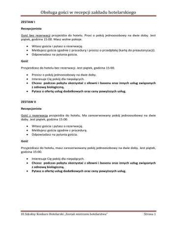 Obsługa gości w recepcji zakładu hotelarskiego ZESTAW I Recepcjonista Gość bez rezerwacji przyjeżdża do hotelu. Prosi o pokój jednoosobowy na dwie doby. Jest piątek, godzina 15:00. Masz wolne pokoje. Witasz gościa i pytasz o rezerwację. Meldujesz gościa zgodnie z procedurą i prosisz o przedpłatę (kartę do preautoryzacji). Odpowiadasz na pytania gościa. Gość Przyjeżdżasz do hotelu bez rezerwacji. Jest piątek, godzina 15:00. Prosisz o pokój jednoosobowy na dwie doby. Interesuje Cię pokój dla niepalących. Chcesz podczas pobytu skorzystać z siłowni i basenu oraz innych usług związanych z odnową biologiczną. Pytasz o ofertę usług dodatkowych oraz ceny powyższych usług. ZESTAW II Recepcjonista Gość z rezerwacją przyjeżdża do hotelu. Ma zarezerwowany pokój jednoosobowy na dwie doby. Jest piątek, godzina 15:00. Witasz gościa i pytasz o rezerwację. Meldujesz gościa zgodnie z procedurą. Odpowiadasz na pytania gościa. Gość Przyjeżdżasz do hotelu, masz zarezerwowany pokój jednoosobowy na dwie doby. Jest piątek, godzina 15:00. Interesuje Cię pokój dla niepalących. Chcesz podczas pobytu skorzystać z siłowni i basenu oraz innych usług związanych z odnową biologiczną. Pytasz o ofertę usług dodatkowych oraz ceny powyższych usług. III Szkolny Konkurs Hotelarski „Zostań mistrzem hotelarstwa” Strona 1 Obsługa gości w recepcji zakładu hotelarskiego ZESTAW III Recepcjonista Gość bez rezerwacji przyjeżdża do hotelu. Prosi o pokój o podwyższonym standardzie na dwie doby. Jest piątek, godzina 15:00. Masz wolne pokoje. Witasz gościa i pytasz o rezerwację. Proponujesz mu pokój Junior Suite. Meldujesz gościa zgodnie z procedurą i prosisz o przedpłatę (kartę do preautoryzacji). Odpowiadasz na pytania gościa. W niedzielę rano gość chce wcześnie wyjechać – proponujesz paczkę śniadaniową. Gość Przyjeżdżasz do hotelu bez rezerwacji. Jest piątek, godzina 15:00. Prosisz o pokój o podwyższonym standardzie Junior Suite na dwie doby. Interesuje Cię pokój dla niepalących. Pytasz o ofertę usług gastronomicznych w hotelu. Chcesz w niedzielę rano wcześnie wyjechać (o godz. 6.00) – pytasz o śniadanie. ZESTAW IV Recepcjonista Gość z rezerwacją przyjeżdża do hotelu. Ma zarezerwowany pokój Junior Suite na dwie doby. Jest piątek, godzina 15:00. Witasz gościa i pytasz o rezerwację. Meldujesz gościa zgodnie z procedurą. Odpowiadasz na pytania gościa. W niedzielę rano gość chce wcześnie wyjechać – proponujesz paczkę śniadaniową. Gość Przyjeżdżasz do hotelu i masz rezerwację – pokój Junior Suite na dwie doby. Jest piątek, godzina 15:00. Interesuje Cię pokój dla niepalących. Pytasz o ofertę usług gastronomicznych w hotelu. Chcesz w niedzielę rano wcześnie wyjechać (o godz. 6.00) – pytasz o śniadanie. III Szkolny Konkurs Hotelarski „Zostań mistrzem hotelarstwa” Strona 2 Obsługa gości w recepcji zakładu hotelarskiego ZESTAW V Recepcjonista Gość bez rezerwacji przyjeżdża do hotelu. Prosi o apartament na dwie doby. Jest piątek, godzina 15:00. Masz wolne pokoje. Witasz gościa i pytasz o rezerwację. Meldujesz gościa zgodnie z procedurą i prosisz o przedpłatę (kartę do preautoryzacji). Odpowiadasz na pytania gościa. Gość Przyjeżdżasz do hotelu bez rezerwacji. Jest piątek, godzina 15:00. Prosisz o pokój jednoosobowy z na dwie doby. Interesuje Cię pokój dla niepalących. Jesteś pierwszy raz we Wrocławiu i chcesz podczas pobytu zwiedzić miasto. Pytasz o atrakcje i możliwość zwiedzania miasta z przewodnikiem. ZESTAW VI Recepcjonista Gość z rezerwacją przyjeżdża do hotelu. Ma zarezerwowany apartament na dwie doby. Jest piątek, godzina 15:00. Witasz gościa i pytasz o rezerwację. Meldujesz gościa zgodnie z procedurą. Odpowiadasz na pytania gościa. Gość Przyjeżdżasz do hotelu w piątek o godzinie 15:00. Masz zarezerwowany apartament na dwie doby. Interesuje Cię pokój dla niepalących. Jesteś pierwszy raz we Wrocławiu i chcesz podczas pobytu zwiedzić miasto. Pytasz o atrakcje i możliwość zwiedzania miasta z przewodnikiem. III Szkolny Konkurs Hotelarski „Zostań mistrzem hotelarstwa” Strona 3 Obsługa gości w recepcji zakładu hotelarskiego III Szkolny Konkurs Hotelarski „Zostań mistrzem hotelarstwa” Strona 4