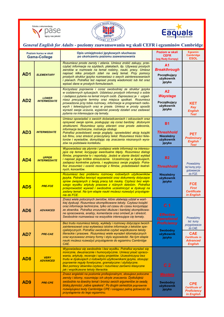 General English for Adults - poziomy zaawansowania wg skali CEFR i egzaminów Cambridge Poziom kursu w skali Gama-College AD1 AD2 AD3 AD4 ELEMENTARY LOWER INTERMEDIATE INTERMEDIATE UPPER INTERMEDIATE AD5 PRE-FCE AD6 ADVANCED AD7 PRE-CAE Opis umiejętności językowych słuchacza po ukończeniu poziomu zaawansowania Rozumiesz proste zwroty i zdania. Umiesz zrobić zakupy, przeczytać informacje na szyldach, plakatach, itp. Używasz prostych zwrotów w rozmowie na temat rodziny, nauki, pracy. Umiesz napisać kilka prostych zdań na swój temat. Przy pomocy prostych struktur języka rozmawiasz o swych zainteresowaniach i planach. Potrafisz też napisać prostą wiadomość lub list oraz wpisać dane w prostych formularzach. Korzystasz poprawnie i coraz swobodniej ze struktur języka w codziennych sytuacjach. Udzielasz prostych informacji o sobie i zadajesz pytania na temat innych osób. Zapraszasz je i uzgadniasz precyzyjnie terminy oraz miejsca spotkań. Rozumiesz prowadzone przy tobie rozmowy, informacje w programach radiowych i telewizyjnych oraz w prasie. Umiesz w prosty sposób wyrazić swoje uczucia, wyjaśniać powody działań oraz zadawać pytania na interesujące cię tematy. Poziom w skali CEFR (wg Rady Europy) Początkujący użytkownik języka A2 Waystage Początkujący użytkownik języka Threshhold Wypowiadasz się płynnie i podajesz wiele informacji na interesujące cię temat, korygując ewentualne błędy. Rozumiesz dialogi filmów, programów tv i reportaży. Jesteś w stanie śledzić wykład i napisać jego krótkie streszczenie. Uczestnicząc w dyskusjach, zadajesz konkretne pytania, i wygłaszasz swoje poglądy. Potrafisz zrozumieć i ocenić recenzje z filmów, przedstawień teatralnych, koncertów. B2 Bez trudu rozumiesz teksty, wykłady i rozmowy dotyczące twoich zainteresowań oraz wyławiasz istotne informacje z tekstów specjalistycznych. Potrafisz swobodnie czytać współczesne teksty literackie i prasowe. Rozumiesz wiele wyrażeń idiomatycznych oraz wyczuwasz zmiany formy i stylu wypowiedzi. Na tym etapie nauki możesz rozważyć przystąpienie do egzaminu Cambridge CAE. ESOL A1 Breakthrough Umiesz opowiadać o swoich doświadczeniach i odczuciach oraz opisywać swoje opinie, posługując się coraz bardziej złożonymi strukturami. Rozumiesz opisy zdarzeń oraz proste zalecenia, informacje techniczne, instrukcje obsługi. Potrafisz przedstawić swoje poglądy, opowiedzieć akcję książki lub filmu, oraz streścić przeczytany tekst. Rozumiesz treści felietonów i wywiadów, domyślając się znaczenia nieznanych wyrazów na podstawie kontekstu. Rozumiesz bez problemu rozmowy rodowitych użytkowników języka. Potrafisz tworzyć wypowiedzi oraz dokumenty dotyczące spraw związanych z twoją pracą lub nauką. Czytasz bez większego wysiłku artykuły prasowe z różnych dziedzin. Potrafisz przeprowadzić wywiad i swobodnie uczestniczyć w dyskusji na zadany temat. Na tym etapie nauki możesz rozważyć przystąpienie do FCE. Znasz wiele potocznych zwrotów, które ułatwiają udział w wartkiej dyskusji. Rozumiesz skomplikowane teksty. Czytasz książki oraz informacje techniczne, tylko od czasu do czasu korzystając ze słownika. Potrafisz zrozumieć dłuższe i bardziej skomplikowane opracowania, analizy, komentarze oraz omówić je i streścić. Swobodnie rozmawiasz na wszystkie interesujące cię tematy. Egzamin Cambridge KET Key English Test B1 Niezależny użytkownik języka Threshhold Niezależny użytkownik języka PET Preliminary English Test Prowadzimy też kursy przygotowawcze do FCE. FCE First Certificate in English C1 Effective Operational Proficiency Swobodny użytkownik języka Prowadzimy też kursy przygotowacze do CAE. CAE Certificate in Advanced English Wypowiadasz się swobodnie i bez wysiłku. Potrafisz wyrażać się ironicznie, dwuznacznie i humorystycznie. Umiesz pisać opracowania, artykuły, recenzje i opisy projektów. Uczestniczysz bez VERY trudu w dyskusjach z rodowitymi użytkownikami języka, stosując AD8 ADVANCED poprawnie reguły fonetyczne, gramatyczne i stylistyczne. Prosimy o wybranie formy płatności. C Przypominamy, 2 Bez pomocynajbardziej słownika czytasz idogodnej rozumiesz zarówno klasyczne jak i współczesne teksty literackie. że rezerwacja miejsca w grupie następuje w momencie podpisania umowy Znasz angielski na poziomie profesjonalnym, stosujesz potoczne Mastery i wpłaty pierwszejzwroty ratyi idiomy, należności zaukryte kurs. rozumiejąc ich znaczenia. Dyskutujesz AD9 PRE-CPE swobodnie na dowolny temat i bronisz swoich argumentów ze swadą bliską płynności „native speakera”. Po drugim semestrze poprawnie rozwiązujesz testy Cambridge CPE i osiągasz pełną gotowość do przystąpienia do tego egzaminu. Swobodny użytkownik języka CPE Certificate of Proficiency in English