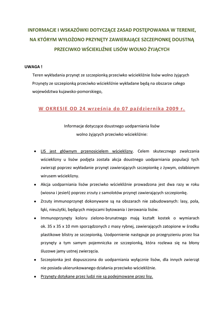 INFORMACJE I WSKAZÓWKI DOTYCZĄCE ZASAD POSTĘPOWANIA W TERENIE, NA KTÓRYM WYŁOŻONO PRZYNĘTY ZAWIERAJĄCE SZCZEPIONKĘ DOUSTNĄ PRZECIWKO WŚCIEKLIŹNIE LISÓW WOLNO ŻYJĄCYCH UWAGA ! Teren wykładania przynęt ze szczepionką przeciwko wściekliźnie lisów wolno żyjących Przynęty ze szczepionką przeciwko wściekliźnie wykładane będą na obszarze całego województwa kujawsko-pomorskiego, W O K R E S IE O D 24 wr z e ś n i a d o 0 7 p a ź d z i e r n i ka 200 9 r . Informacje dotyczące doustnego uodparniania lisów wolno żyjących przeciwko wściekliźnie: LIS jest głównym przenosicielem wścieklizny. Celem skutecznego zwalczania wścieklizny u lisów podjęta została akcja doustnego uodparniania populacji tych zwierząt poprzez wykładanie przynęt zawierających szczepionkę z żywym, osłabionym wirusem wścieklizny. Akcja uodparniania lisów przeciwko wściekliźnie prowadzona jest dwa razy w roku (wiosna i jesieo) poprzez zrzuty z samolotów przynęt zawierających szczepionkę. Zrzuty immunoprzynęt dokonywane są na obszarach nie zabudowanych: lasy, pola, łąki, nieużytki, będących miejscami bytowania i żerowania lisów. Immunoprzynęty koloru zielono-brunatnego mają kształt kostek o wymiarach ok. 35 x 35 x 10 mm sporządzonych z masy rybnej, zawierających zatopione w środku plastikowe blistry ze szczepionką. Uodpornienie następuje po przegryzieniu przez lisa przynęty a tym samym pojemniczka ze szczepionką, która rozlewa się na błony śluzowe jamy ustnej zwierzęcia. Szczepionka jest dopuszczona do uodparniania wyłącznie lisów, dla innych zwierząt nie posiada ukierunkowanego działania przeciwko wściekliźnie. Przynęty dotykane przez ludzi nie są podejmowane przez lisy. Wskazówki dla mieszkaoców terenów, na których wykładane są immunoprzynęty do doustnego uodparniania lisów wolno żyjących przeciwko wściekliźnie Nie należy dotykad i niszczyd napotkanych immunoprzynęt, Zagrożeniem dla człowieka może byd bezpośredni kontakt immunoprzynęt z otwartymi ranami, otarciami skóry, śluzówkami jamy ustnej i nosa oraz oczami, W każdym przypadku kontaktu człowieka z immunoprzynętą należy miejsca eksponowane przemyd wodą z mydłem i bezwzględnie powiadomid lekarza medycyny, stację „SANEPID-u” lub lekarza weterynarii, Zwierzęta domowe i gospodarskie, które zetknęły się z immunoprzynętą należy poddad badaniu i obserwacji. Obserwacja winna byd przeprowadzona przez lekarza weterynarii, protokolarnie opisana z uwzględnieniem danych hodowcy oraz wszelkich jego spostrzeżeo dotyczących badanego zwierzęcia, Fakt podjęcia lekarsko-weterynaryjnej obserwacji zwierzęcia mającego kontakt z immunoprzynętą należy zgłosid właściwemu terytorialnie powiatowemu lekarzowi weterynarii, który ustali tok dalszego postępowania. Aby akcja doustnego szczepienia lisów wolno żyjących przebiegała bezpiecznie i efektywnie, prosi się o: Nie wypuszczanie swobodnie psów i kotów oraz nie organizowanie polowao z psami w okresie 3 tygodni od wyłożenia szczepionki, Nie dotykanie, nie podnoszenie i nie niszczenie napotkanych immunoprzynęt, Zgłaszanie wszelkich kontaktów ludzi lub zwierząt domowych z immunoprzynętami w najbliższych przychodniach lekarskich, szpitalach zakaźnych, stacjach ”SANEPID-u”, lecznicach weterynaryjnych lub Inspektoratach Weterynarii, Szczególne pouczenie dzieci o powyższych zasadach postępowania. Kujawsko-Pomorski Wojewódzki Lekarz Weterynarii