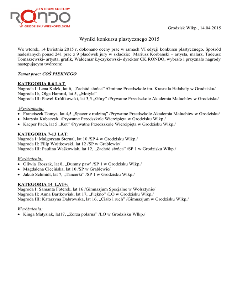 Grodzisk Wlkp., 14.04.2015 Wyniki konkursu plastycznego 2015 We wtorek, 14 kwietnia 2015 r. dokonano oceny prac w ramach VI edycji konkursu plastycznego. Spośród nadesłanych ponad 241 prac z 9 placówek jury w składzie: Mariusz Korbański – artysta, malarz, Tadeusz Tomaszewski- artysta, grafik, Waldemar Łyczykowski- dyrektor CK RONDO, wybrało i przyznało nagrody następującym twórcom: Temat prac: COŚ PIĘKNEGO KATEGORIA 0-6 LAT Nagroda I: Lena Kałek, lat 6, „Zachód słońca” /Gminne Przedszkole im. Krasnala Hałabały w Grodzisku/ Nagroda II:, Olga Hamrol, lat 5, „Motyle” Nagroda III: Paweł Królikowski, lat 3,5 „Góry” /Prywatne Przedszkole Akademia Maluchów w Grodzisku/ Wyróżnienia: Franciszek Tomys, lat 4,5 „Spacer z rodziną” /Prywatne Przedszkole Akademia Maluchów w Grodzisku/ Marysia Kubaczyk /Prywatne Przedszkole Wiercipięta w Grodzisku Wlkp./ Kacper Pach, lat 5 „Kot” /Prywatne Przedszkole Wiercipięta w Grodzisku Wlkp./ KATEGORIA 7-13 LAT: Nagroda I: Małgorzata Sternal, lat 10 /SP 4 w Grodzisku Wlkp./ Nagroda II: Filip Wojtkowski, lat 12 /SP w Grąblewie/ Nagroda III: Paulina Waśkowiak, lat 12, „Zachód słońca” /SP 1 w Grodzisku Wlkp./ Wyróżnienia: Oliwia Roszak, lat 8, „Dumny paw’ /SP 1 w Grodzisku Wlkp./ Magdalena Ciecińska, lat 10 /SP w Grąblewie/ Jakub Schmidt, lat 7, „Tancerki” /SP 1 w Grodzisku Wlkp./ KATEGORIA 14 LAT+: Nagroda I: Samanta Foterek, lat 16 /Gimnazjum Specjalne w Wolsztynie/ Nagroda II: Anna Bartkowiak, lat 17, „Piękno” /LO w Grodzisku Wlkp./ Nagroda III: Katarzyna Dąbrowska, lat 16, „Ciało i ruch” /Gimnazjum w Grodzisku Wlkp./ Wyróżnienia: Kinga Matysiak, lat17, „Zorza polarna” /LO w Grodzisku Wlkp./ Temat prac: NATURA – OBECNOŚC OBOWIĄZKOWA KATEGORIA 7-13 LAT Nagroda I: Maria Ksiąg, lat 11, „Natura nadaje kolor naszemu życiu” /SP nr 1 w Grodzisku Wlkp./ Nagroda II: Jakub Schmidt, lat 7, „Polskie krajobrazy” /SP nr 1 w Grodzisku Wlkp./ Nagroda III: Julia Szelejewska, lat 12, „Widok z mojego okna” /SP nr 1 w Grodzisku Wlkp./ Wyróżnienia: Piotr Wlekły, lat 8, „Natura” / SP nr 1 w Grodzisku Wlkp./ Marcjanna Wielgosz, lat 13 /ZS w Ptaszkowie/ Kornelia Kurek, lat 8 /SP w Grąblewie/ KATEGORIA 14+ LAT: Nagroda I: Natalia Kaminiczna, lat 17, „Frenzjia 04”, /LO w Grodzisku Wlkp./ Nagroda II: Olga Wawrzyniak, lat 17, „Splątani w samotności”, /LO w Grodzisku Wlkp./ Nagroda III: Kamila Zygalska, lat 16, /Gimnazjum Specjalne w Wolsztynie/ Jury: Mariusz Korbański …............................................................................................................. Tadeusz Tomaszewski …....................................................................................................... Waldemar Łyczykowski ….................................................................................................... Oficjalne ogłoszenie werdyktu oraz wręczenie nagród laureatom odbędzie się w środę, 22 kwietnia 2015 r. o godz. 15.00 w Centrum Kultury RONDO. Zapraszamy na wystawę pokonkursową nagrodzonych prac.