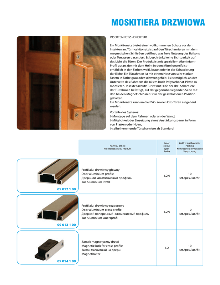 mosKitiera drzwiowa INSEKTENNETZ - DREHTUR Ein Moskitonetz bietet einen vollkommenen Schutz vor den Insekten an. Türmoskitonetz ist auf den Türscharnieren mit dem magnetischen Schließen geöffnet, was freie Nutzung des Balkons oder Terrassen garantiert. Es beschränkt keine Sichtbarkeit auf das Licht die Türen. Der Produkt ist mit speziellem AluminiumProfil getan, der mit dem Holm in dem Mittel gesteift ist erhältlich in den Farben weiß, braun oder in der Schattierung der Eiche. Ein Türrahmen ist mit einem Netz von sehr starken Fasern in Farbe grau oder schwarz gefüllt. Es ist möglich, an der Unterseite des Rahmens die 80 cm hoch Polycarbonat-Platte zu montieren. Insektenschutz Tür ist mit Hilfe der drei Scharniere der Türrahmen befestigt, auf der gegenüberliegenden Seite mit den beiden Magnetschlösser ist in der geschlossenen Position gehalten. Ein Moskitonetz kann an die PVC- sowie Holz- Türen eingebaut werden. Vorteile des Systems: ◊ Montage auf dem Rahmen oder an der Wand, ◊ Möglichkeit der Einsetzung eines Verstärkungspanel in Form von Platten oder Holm, ◊ selbsthemmende Türscharniere als Standard nazwa / article Наименование / Produkt kolor colour цвет Farbe ilość w opakowaniu Packing количество в упаковке Verpackung Profil alu. drzwiowy główny Door aluminium profile Дверьной алюминиевый профиль Tür Aluminium Profil 1,2,9 10 szt./pcs./шт./St. Profil alu. drzwiowy rozporowy Door aluminium cross profile Дверной поперечный алюминиевый профиль Tür Aluminium Quersprofil 1,2,9 10 szt./pcs./шт./St. 1,2 10 szt./pcs./шт./St. 09 012 1 00 09 013 1 00 Zamek magnetyczny drzwi Magnetic lock for cross profile Замок магнитный на двери Magnethalter 09 014 1 00 79 mosKitiera drzwiowa nazwa / article Наименование / Produkt Zawias obrotowy drzwiowy Aluminum hinge for door Петля дверная Aluminium Türscharnier kolor colour цвет Farbe ilość w opakowaniu Packing количество в упаковке Verpackung 1,2 10 szt./pcs./шт./St. 7,8 10 mb/rm/м/lM 09 015 1 00 Uszczelka szczotkowa Brush seal - cinerious Уплотнитель щётка- серый Bürste - aschgrau 80 09 016 0 00 Narożnik alu. wew. drzwiowy Aluminum inside corner Уголок внутренний дверной алюминиевый Aluminium Innenecke 20 szt./pcs./шт./St. 09 017 0 00 Uchwyt balkonowy zewnętrzny D Door exterior handle big Внешний балконной держатель (большой) Bediengriff groß 1,2,9 10 szt./pcs./шт./St. Uchwyt balkonowy zewnętrzny M Door exterior handle small Внешний балконной держатель (маленький) Bediengriff klein 1,2,9 10 szt./pcs./шт./St. Klamka drzwiowa wewnętrzna profilowana Interior handle shaped Внутренняя профилированная дверная ручка Türgriff groß 1,2,9 10 szt./pcs./шт./St. 09 018 1 00 09 018 1 00 M 09 019 1 00 mosKitiera drzwiowa nazwa / article Наименование / Produkt Klamka drzwiowa wewnętrzna płaska Interior handle flat Внутренняя плоская дверная ручка Türgriff klein kolor colour цвет Farbe ilość w opakowaniu Packing количество в упаковке Verpackung 1,2,9 10 szt./pcs./шт./St. 1,2 10 szt./pcs./шт./St. 09 020 1 00 Zapinka profilu rozporowego Cross profile connector Соеденитель поперечного алюминиевого профиля Spange für Tür Aluminium Quersprofil 09 021 1 00 Sprężyna do zawiasu samozamykającego Spring for self-locking hinge Пружина доводчик Feder für Türscharnier 09 022 0 00 kolor/colour/цвет/Farbe 1 - biały/white/белый/weiß 2 - brąz/brown/коричневый/braun 3 - ciemny brąz/dark brown/тёмно-коричневый/dunkel braun 4 - dąb/oak/дуб/Eiche 5 - mahoń/mahogany/махонь/Mahogoni 6 - orzech/nut/oрех/Nuss 7 - czarny/black/чёрный/schwarz 8 - popielaty/cinerious/серая/aschgrau struktura drewna/wooden structure/Структура дерева/ Holzstruktur 9 - złoty dąb/golden oak/золотой дуб/goldene Eiche 10 - mahoń/mahogany/махонь/Mahogoni 10 szt./pcs./шт./St. 81