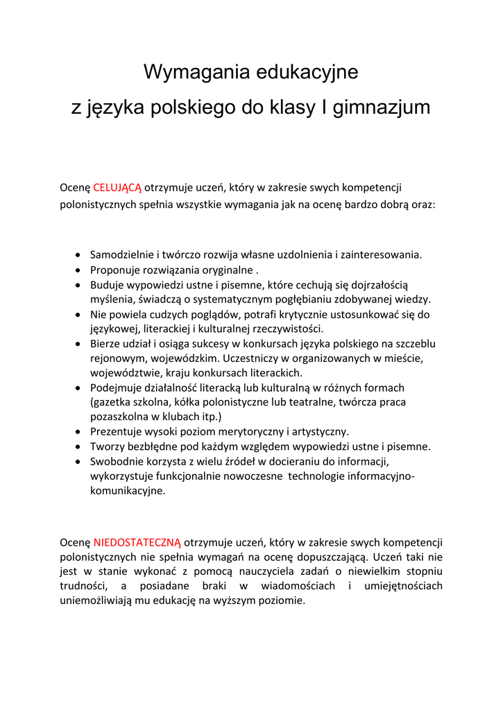 Wymagania edukacyjne z języka polskiego do