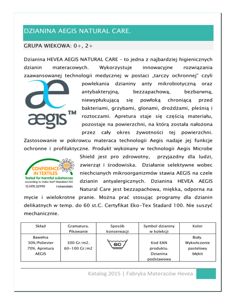 DZIANINA AEGIS NATURAL CARE. GRUPA WIEKOWA: 0+, 2+ Dzianina HEVEA AEGIS NATURAL CARE – to jedna z najbardziej higienicznych dzianin materacowych. Wykorzystuje innowacyjne rozwiązania zaawansowanej technologii medycznej w postaci „tarczy ochronnej” czyli powlekania dzianiny antybakteryjną, niewypłukującą anty mikrobiotyczną bezzapachową, się powłoką oraz bezbarwną, chroniącą przed bakteriami, grzybami, glonami, drożdżami, pleśnią i roztoczami. Apretura staje się częścią materiału, pozostaje na powierzchni, na którą została nałożona przez cały okres żywotności tej powierzchni. Zastosowanie w pokrowcu materaca technologii Aegis nadaje jej funkcje ochronne i profilaktyczne. Produkt wykonany w technologii Aegis Microbe Shield jest pro zdrowotny, zwierząt i środowiska. przyjazdny dla ludzi, Działanie selektywne wobec niechcianych mikroorganizmów stawia AEGIS na czele dzianin antyalergicznych. Dzianina HEVEA AEGIS Natural Care jest bezzapachowa, miękka, odporna na mycie i wielokrotne pranie. Można prać stosując programy dla dzianin delikatnych w temp. do 60 st.C. Certyfikat Eko-Tex Stadard 100. Nie suszyć mechanicznie. Skład Gramatura. Sposób Symbol dzianiny Pikowanie konserwacji w kolekcji Bawełna Kolor Biały. 30%/Poliester 300 Gr/m2. Kod EAN Wykończenie 70%. Apretura 60-100 Gr/m2 produktu. pastelowy Dzianina błękit AEGIS podstawowa Katalog 2015 | Fabryka Materaców Hevea Katalog 2015 | Fabryka Materaców Hevea