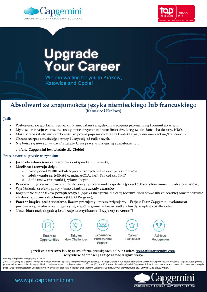 Absolwent ze znajomością języka niemieckiego lub francuskiego (Katowice i Kraków) Jeśli: Posługujesz się językiem niemieckim/francuskim i angielskim w stopniu przynajmniej komunikatywnym, Myślisz o rozwoju w obszarze usług biznesowych z zakresu: finansów, księgowości, łańcucha dostaw, HRO, Masz ochotę szkolić swoje zdolności językowe poprzez codzienny kontakt z językiem niemieckim/francuskim, Chcesz czerpać satysfakcję z pracy i uczyć się od najlepszych, Nie boisz się nowych wyzwań i zależy Ci na pracy w przyjaznej atmosferze, to... ...oferta Capgemini jest właśnie dla Ciebie! Praca z nami to przede wszystkim: Jasno określona ścieżka zawodowa - ekspercka lub liderska, Możliwość rozwoju dzięki: o bazie ponad 20 000 szkoleń prowadzonych online oraz przez trenerów o zdobywaniu certyfikatów, m.in. ACCA, SAP, Prince2 czy PMP o dofinansowaniu nauki języków obcych, Wysokie, międzynarodowe standardy pracy i praca wśród ekspertów (ponad 900 certyfikowanych profesjonalistów), Wyróżnienia za efekty pracy - jasno określone zasady awansów, Bogaty pakiet dodatków pozapłacowych (opieka medyczna dla całej rodziny, dodatkowe ubezpieczenie) oraz możliwość elastycznej formy zatrudnienia (FLEXI Program), Praca w inspirującej atmosferze. Razem pracujemy i razem świętujemy – Projekt Teatr Capgemini, wolontariat pracowniczy, wydarzenia integracyjne, wspólne granie w kosza, siatkę – każdy znajdzie coś dla siebie! Nasze biura mają dogodną lokalizację z certyfikatem „Przyjazny rowerom”! Jeżeli zainteresowała Cię nasza oferta, prześlij swoje CV na adres [email protected]. w tytule wiadomości podając nazwę targów pracy. Prosimy o dopisanie następującej klauzuli: „Wyrażam zgodę na przetwarzanie przez Capgemini Polska Sp. z o.o. danych osobowych zawartych w mojej ofercie pracy na potrzeby procesów rekrutacji prowadzonych obecnie i w przyszłości zgodnie z przepisami ustawy z dnia 29 sierpnia 1997r. o ochronie danych osobowych (Dz. U. 2002, Nr 101, poz. 926 ze zm.) Zezwalam również Capgemini Polska Sp z o.o. na przetwarzanie moich danych osobowych poza Europejskim Obszarem Gospodarczym, w tym przez jednostki w Indiach oraz klientów Capgemini obejmujących wewnętrzne oraz zewnętrzne obszary EEA.”