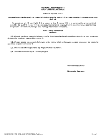 UCHWAŁA NR XV/135/2016 RADY GMINY PAWŁOWICE z dnia 26 stycznia 2016 r. w sprawie wyrażenia zgody na zawarcie kolejnych umów najmu i dzierżawy zawartych na czas oznaczony do 3 lat. Na podstawie art. 18 ust. 2 pkt. 9 lit. a ustawy z dnia 8 marca 1990 r. o samorządzie gminnym (tekst jednolity: Dz. U. 2015 r. poz. 1515 z późniejszymi zmianami), po pozytywnym zaopiniowaniu przez Komisję Gospodarki i Mienia Komunalnego oraz Komisję Działalności Społecznej. Rada Gminy Pawłowice uchwala: § 1. Wyrazić zgodę na zawarcie kolejnych umów dzierżawy dla nieruchomości gruntowych na czas oznaczony do trzech lat zgodnie z załącznikiem numer 1. § 2. Wyrazić zgodę na zawarcie kolejnych umów najmu lokali użytkowych na czas oznaczony do trzech lat zgodnie z załącznikiem numer 2. § 3. Wykonanie uchwały powierza się Wójtowi Gminy Pawłowice. § 4. Uchwała wchodzi w życie z dniem podjęcia. Przewodniczący Rady Aleksander Szymura Id: 561D84F3-317D-4C7C-AB29-73796E97B822. Podpisany Strona 1 Załącznik Nr 1 do Uchwały Nr XV/135/2016 Rady Gminy Pawłowice z dnia 26 stycznia 2016 r. Wykaz umów dzierżaw dla nieruchomości gruntowych, dla których zostanie zawarta kolejna umowa dzierżawy na czas oznaczony do 3 lat. L.p. Nr umowy 1. 2. 3. OI.2600.0188.2013 0391.2013 0387.2013 Data zawarcia umowy 2013-04-15 2013-08-22 2013-08-14 4. 5. 6. 7. 8. 9. 10. 11. 0551.2013 0467.2013 0469.2013 OI.2600.0081.2013 OI.2600.0189.2013 OI.2600.0208.2013 0535.2013 0444.2013 2013-10-29 2013-09-25 2013-09-25 2013-02-01 2013-04-18 2013-05-08 2013-10-21 2013-09-16 Janusz Langer Maria Buchta Alfred Piechoczek Władysława Makowiecka Janina Szuścik Bronisław Janecki Kotorc Tomasz Sabina Habraszka 12. 13. 14. 15. 16. 17. 0536.2013 0468.2013 0555.2013 0265.2013 OI.2600.0167.2013 0388.2013 2013-10-21 2013-09-25 2013-11-05 2013-06-10 2013-04-02 2013-08-14 Michał Nabagło Stanisław Gogol Leon Pisarek Franciszek Brejza Czesław Fojcik Telekomunikacja Polska S.A. 18. 19. 0183.2015 GOS 132/11/2013 2015-05-25 2013-06-12 Marek Krawczyk MKS PROMYK 20. GOS 132/05/2014 2014-01-02 LKS Krzyżowice 21. GOS 132/02/2014 2014-01-02 UKS Warszowice Id: 561D84F3-317D-4C7C-AB29-73796E97B822. Podpisany Dzierżawca Andrzej Duda Krystian Kornas Telekomunikacja Polska S.A. Wykorzystanie gruntu Działalność rolnicza Działalność rolnicza Usytuowanie szafy telekomunikacyjnej Działalność rolnicza Działalność rolnicza Działalność rolnicza Działalność rolnicza Działalność rolnicza Działalność rolnicza Działalność rolnicza Miejsce pod garaż blaszany Działalność rolnicza Działalność rolnicza Działalność rolnicza Działalność rolnicza Działalność rolnicza Usytuowanie szafy telekomunikacyjnej Parking dla samochodów Boisko sportowe z zapleczem wykorzystywane na działalność statutową klubu. Boisko sportowe wykorzystywane na działalność statutową klubu. Boisko sportowe wykorzystywane na działalność statutową klubu. Strona 1 Załącznik Nr 2 do Uchwały Nr XV/135/2016 Rady Gminy Pawłowice z dnia 26 stycznia 2016 r. Wykaz umów najmu lokali użytkowych, dla których zostanie zawarta kolejna umowa najmu na czas oznaczony do 3 lat. L.p. Nr umowy 1. 20120.4.2013/SP Data zawarcia 2013-04-30 2. RBiM/71442/2/09 2009-04-15 Ludowy Klub Sportowy „Strażak” w Pielgrzymowicach „Zdrowie” Spółka z o.o. 3. RBiM/4120/11/14 2014-10-31 „Zdrowie” Spółka z o.o. 4. RBiM/4120/5/15 2015-05-29 Jacek Szopa 5. RBiM/4120/5/13 2013-04-08 6. RBiM/4120/9/13 2013-12-03 Jolanta Repetowska, Mieczysław Jagiełłowicz, Ali Issa Darwich, Janusz Szopiński Robert Jarosz 7. RBiM/4120/2/14 2014-01-08 GKS „FUTSAL” 8. RBiM/4120/1/14 2014-01-07 TKKF „ROZWÓJ” 9. SP2/7/2010/2011 2011-05-16 Zofia Ruben Id: 561D84F3-317D-4C7C-AB29-73796E97B822. Podpisany Najemca Przedmiot najmu Boisko sportowe wraz z szatnią, magazynem i umywalnią wykorzystywane na działalność statutową klubu. Lokal użytkowy wykorzystywany na świadczenie usług medycznych w przychodni zdrowia w Pniówku. Lokal użytkowy wykorzystywany na świadczenie usług medycznych w przychodni zdrowia w Pniówku. Lokal użytkowy w pomieszczeniach piwnicznych przychodni zdrowia w Pniówku. Lokal użytkowy wykorzystywany na świadczenie usług medycznych w przychodni zdrowia w Pniówku. Lokal użytkowy wykorzystywany na świadczenie usług medycznych w przychodni zdrowia w Golasowicach. Pomieszczenia piwniczne w przychodni zdrowia w Pawłowicach przy ul. Górniczej wykorzystywane na działalność statutową klubu. Pomieszczenia piwniczne w przychodni zdrowia w Pawłowicach przy ul. Górniczej wykorzystywane na działalność statutową klubu. Lokal użytkowy wykorzystywany na świadczenie usług edukacyjnych w formie prowadzenia niepublicznego przedszkola. Strona 1