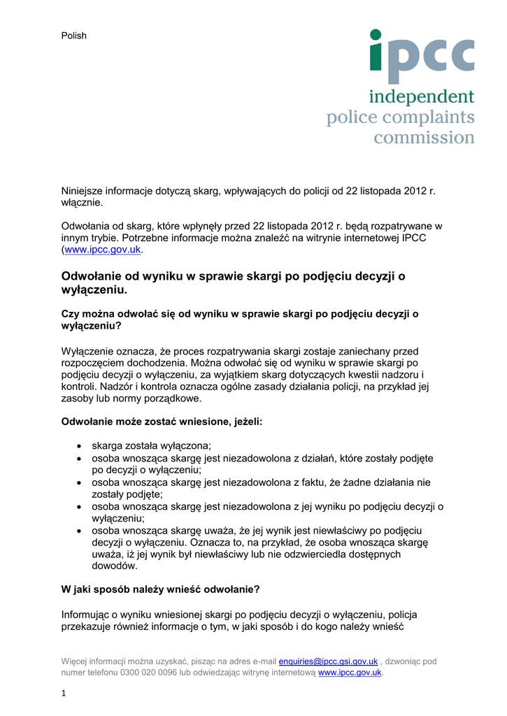 Polish Niniejsze informacje dotyczą skarg, wpływających do policji od 22 listopada 2012 r. włącznie. Odwołania od skarg, które wpłynęły przed 22 listopada 2012 r. będą rozpatrywane w innym trybie. Potrzebne informacje można znaleźć na witrynie internetowej IPCC (www.ipcc.gov.uk. Odwołanie od wyniku w sprawie skargi po podjęciu decyzji o wyłączeniu. Czy można odwołać się od wyniku w sprawie skargi po podjęciu decyzji o wyłączeniu? Wyłączenie oznacza, że proces rozpatrywania skargi zostaje zaniechany przed rozpoczęciem dochodzenia. Można odwołać się od wyniku w sprawie skargi po podjęciu decyzji o wyłączeniu, za wyjątkiem skarg dotyczących kwestii nadzoru i kontroli. Nadzór i kontrola oznacza ogólne zasady działania policji, na przykład jej zasoby lub normy porządkowe. Odwołanie może zostać wniesione, jeżeli: skarga została wyłączona; osoba wnosząca skargę jest niezadowolona z działań, które zostały podjęte po decyzji o wyłączeniu; osoba wnosząca skargę jest niezadowolona z faktu, że żadne działania nie zostały podjęte; osoba wnosząca skargę jest niezadowolona z jej wyniku po podjęciu decyzji o wyłączeniu; osoba wnosząca skargę uważa, że jej wynik jest niewłaściwy po podjęciu decyzji o wyłączeniu. Oznacza to, na przykład, że osoba wnosząca skargę uważa, iż jej wynik był niewłaściwy lub nie odzwierciedla dostępnych dowodów. W jaki sposób należy wnieść odwołanie? Informując o wyniku wniesionej skargi po podjęciu decyzji o wyłączeniu, policja przekazuje również informacje o tym, w jaki sposób i do kogo należy wnieść Więcej informacji można uzyskać, pisząc na adres e-mail [email protected] , dzwoniąc pod numer telefonu 0300 020 0096 lub odwiedzając witrynę internetową www.ipcc.gov.uk. 1 Polish odwołanie. W razie braku takich informacji należy skontaktować się z jednostką policji rozpatrującą skargę. Do kogo należy wnieść odwołanie? Przesyłając informacje dotyczące wyniku wniesionej skargi po podjęciu decyzji o wyłączeniu, policja informuje również do kogo należy wnieść odwołanie. Może to być starszy rangą funkcjonariusz policji lub IPCC. Odwołanie powinno zostać przesłane do właściwej organizacji. W celu uniknięcia opóźnień odwołanie powinno zostać przesłane do organizacji, która, zgodnie z przekazaną informacją, zajmie się jego rozpatrzeniem. Wnoszenie odwołania do IPCC Istnieją trzy sposoby wniesienia odwołania. Należy wybrać jeden z nich: wykorzystanie elektronicznego formularza odwołania IPCC; wydrukowanie, wypełnienie i przesłanie formularza pocztą do IPCC; wypełnienie formularza elektronicznego, zachowanie go oraz przesłanie pocztą elektroniczną do IPCC. Odwołanie powinno wpłynąć do IPCC w ciągu 29 dni od daty pisma informującego o decyzji o zaniechaniu. Okres ten obejmuje również czas, jaki zajmie doręczenie przesyłki pocztowej. Jeżeli odwołanie nie wpłynie do IPCC w ciągu 29 dni, może nie zostać rozpatrzone. Ten termin może zostać przedłużony z uwagi na szczególne okoliczności, które należy szczegółowo wyjaśnić w prośbie o jego przedłużenie. Sposób rozpatrywania odwołania Osoba wnosząca odwołanie zostanie poinformowana listownie o jego wpłynięciu. Po przeprowadzeniu oceny odwołania zostanie podjęta decyzja. Jeżeli rozpatrzenie odwołania należy do jej kompetencji, IPCC skontaktuje się z jednostką policji lub organizacją, przeciw której została wniesiona skarga, w celu poinformowania jej o wniesieniu odwołania. Zostanie do nich wysłana kopia odwołania z prośbą o informacje dotyczące wniesionej przeciw nim skargi. Należy wziąć pod uwagę, że proces odwoławczy nie dotyczy pierwotnie wniesionej skargi. Odwołanie wykaże, czy wynik wniesionej skargi był właściwy. Podtrzymanie odwołania Jeżeli odwołanie zostanie podtrzymane, osoba, która je wniosła zostanie poinformowana o dalszym postępowaniu w sprawie. Więcej informacji można uzyskać, pisząc na adres e-mail [email protected] , dzwoniąc pod numer telefonu 0300 020 0096 lub odwiedzając witrynę internetową www.ipcc.gov.uk. 2 Polish Niepodtrzymanie odwołania Jeżeli odwołanie nie zostanie podtrzymane, osoba, która je wniosła zostanie poinformowana listownie o przyczynach takiej decyzji. Gdzie można znaleźć dalsze informacje? IPCC przygotowała odpowiedzi na najczęściej zadawane pytania dotyczące odwołań. Można je przeczytać na naszej witrynie internetowej. W celu zasięgnięcia dalszych informacji lub w razie wątpliwości co do dalszego postępowania, należy skontaktować się z jednostką policji, która rozpatrywała skargę lub z IPCC. Można również zasięgnąć porady radcy prawnego. W razie kłopotów z wypełnieniem formularza elektronicznego lub konwencjonalnego, lub prośby o formularz w innym języku czy formacie, należy skontaktować się policją lub IPCC. Więcej informacji można uzyskać, pisząc na adres e-mail [email protected] , dzwoniąc pod numer telefonu 0300 020 0096 lub odwiedzając witrynę internetową www.ipcc.gov.uk. 3
