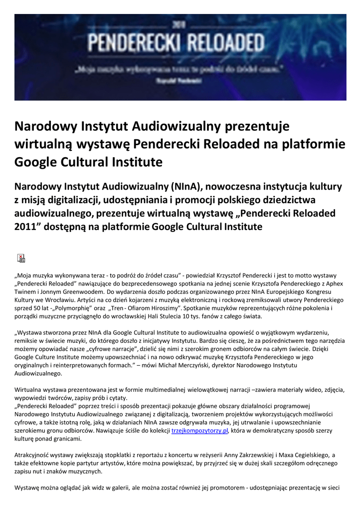 Narodowy Instytut Audiowizualny prezentuje wirtualną wystawę Penderecki Reloaded na platformie Google Cultural Institute Narodowy Instytut Audiowizualny (NInA), nowoczesna instytucja kultury z misją digitalizacji, udostępniania i promocji polskiego dziedzictwa audiowizualnego, prezentuje wirtualną wystawę „Penderecki Reloaded 2011” dostępną na platformie Google Cultural Institute „Moja muzyka wykonywana teraz - to podróż do źródeł czasu” - powiedział Krzysztof Penderecki i jest to motto wystawy „Penderecki Reloaded” nawiązujące do bezprecedensowego spotkania na jednej scenie Krzysztofa Pendereckiego z Aphex Twinem i Jonnym Greenwoodem. Do wydarzenia doszło podczas organizowanego przez NInA Europejskiego Kongresu Kultury we Wrocławiu. Artyści na co dzień kojarzeni z muzyką elektroniczną i rockową zremiksowali utwory Pendereckiego sprzed 50 lat -„Polymorphię” oraz „Tren - Ofiarom Hiroszimy”. Spotkanie muzyków reprezentujących różne pokolenia i porządki muzyczne przyciągnęło do wrocławskiej Hali Stulecia 10 tys. fanów z całego świata. „Wystawa stworzona przez NInA dla Google Cultural Institute to audiowizualna opowieść o wyjątkowym wydarzeniu, remiksie w świecie muzyki, do którego doszło z inicjatywy Instytutu. Bardzo się cieszę, że za pośrednictwem tego narzędzia możemy opowiadać nasze „cyfrowe narracje”, dzielić się nimi z szerokim gronem odbiorców na całym świecie. Dzięki Google Culture Institute możemy upowszechniać i na nowo odkrywać muzykę Krzysztofa Pendereckiego w jego oryginalnych i reinterpretowanych formach.” – mówi Michał Merczyński, dyrektor Narodowego Instytutu Audiowizualnego. Wirtualna wystawa prezentowana jest w formie multimedialnej wielowątkowej narracji –zawiera materiały wideo, zdjęcia, wypowiedzi twórców, zapisy prób i cytaty. „Penderecki Reloaded” poprzez treści i sposób prezentacji pokazuje główne obszary działalności programowej Narodowego Instytutu Audiowizualnego związanej z digitalizacją, tworzeniem projektów wykorzystujących możliwości cyfrowe, a także istotną rolę, jaką w działaniach NInA zawsze odgrywała muzyka, jej utrwalanie i upowszechnianie szerokiemu gronu odbiorców. Nawiązuje ściśle do kolekcji trzejkompozytorzy.pl, która w demokratyczny sposób szerzy kulturę ponad granicami. Atrakcyjność wystawy zwiększają stopklatki z reportażu z koncertu w reżyserii Anny Zakrzewskiej i Maxa Cegielskiego, a także efektowne kopie partytur artystów, które można powiększać, by przyjrzeć się w dużej skali szczegółom odręcznego zapisu nut i znaków muzycznych. Wystawę można oglądać jak widz w galerii, ale można zostać również jej promotorem - udostępniając prezentację w sieci znajomym. Wystawa „Penderecki Reloaded 2011” w Google Cultural Institute:http://www.google.com/culturalinstitute/exhibit/penderecki-reloaded/ARJ5RdMk?hl=pl Użytkownicy zainteresowani muzyką Mistrza, będą mogli odwiedzić pełną kolekcję muzyczną Krzysztofa Pendereckiego na stronie www.trzejkompozytorzy.pl. --Google Cultural Institute to globalna platforma, która powstała w 2011 roku. Za swój główny cel obrał udostępnianie ważnych zasobów kultury i historycznych materiałów online, aby stały się dostępne dla wszystkich internautów na całym świecie. Dzięki nowoczesnym narzędziom Google Cultural Institute utrwala najważniejsze dzieła sztuki oraz archiwalne dokumenty i zachowuje je dla przyszłych pokoleń. Google Cultural Institute współpracuje z ponad 400 innymi instytucjami kultury z ponad 50 krajów. Obok czterech polskich wystaw dziś udostępnionych, internauci z całego świata mogą oglądać historyczne wystawy stworzone przez Muzeum Historii Polski - o Solidarności i zapoczątkowanej przez polskie wydarzenia transformacji w Europie Środkowo-Wschodniej oraz trzy dotyczące Holokaustu, współtworzone z Państwowym Muzeum Auschwitz-Birkenau. Innymi ważnymi projektami Google Cultural Institute były: digitalizacja biblijnych zwojów znad Morza Martwego oraz stworzenie cyfrowej biblioteki, zawierającej zbiór około 5 tysięcy zdjęć fragmentów manuskryptów w niespotykanej dotąd jakości. Inną inicjatywą Google Cultural Institute było uruchomienie Cyfrowego Archiwum Nelsona Mandeli, ogólnodostępnego serwisu internetowego zawierającego tysiące historycznych dokumentów, zdjęć i filmów wideo z życia charyzmatycznego polityka. W ramach Google Cultural Institute funkcjonuje również Art Project, którego celem jest prezentowanie kolekcji arcydzieł i obiektów muzealnych online. Dzięki niemu internauci na całym świecie mogą oglądać zbiory z ponad 300 instytucji partnerskich Google Art Project z ponad 50 krajów świata np. nowojorskiego MoMA i Metropolitan Museum of Art, paryskiego Muzeum Orsay, Muzeum Sztuki Islamskiej w Katarze czy Narodowej Galerii Sztuki Współczesnej w Delhi, a także wybrane eksponaty z Muzeum Sztuki w Łodzi i Muzeum Pałacu w Wilanowie. Narodowy Instytut Audiowizualny dołącza do polskich instytucji na platformie Google Cultural Institute. www.google.com/culturalinstitute Narodowy Instytut Audiowizualny (NInA) to nowoczesna instytucja kultury powołana w celu digitalizacji, udostępniania i promocji polskiego dziedzictwa audiowizualnego. Misją statutową NInA jest utrwalanie, archiwizacja, i upowszechnianie najbardziej wartościowych przejawów kultury filmowej, muzycznej i teatralnej. NInA realizuje projekty wykorzystujące możliwości Internetu i skierowane do szerokiego grona odbiorców. Prowadzi działania z zakresu edukacji medialnej oraz badań dotyczących edukacji audiowizualnej oraz kultury 2.0, współpracując z ekspertami w zakresie nowych mediów, prawa autorskiego i archiwizacji. Instytut inicjuje i wspiera festiwale, koncerty, konferencje i wystawy, podejmując współpracę zarówno z uznanymi jak i alternatywnymi twórcami rodzimymi i zagraniczny