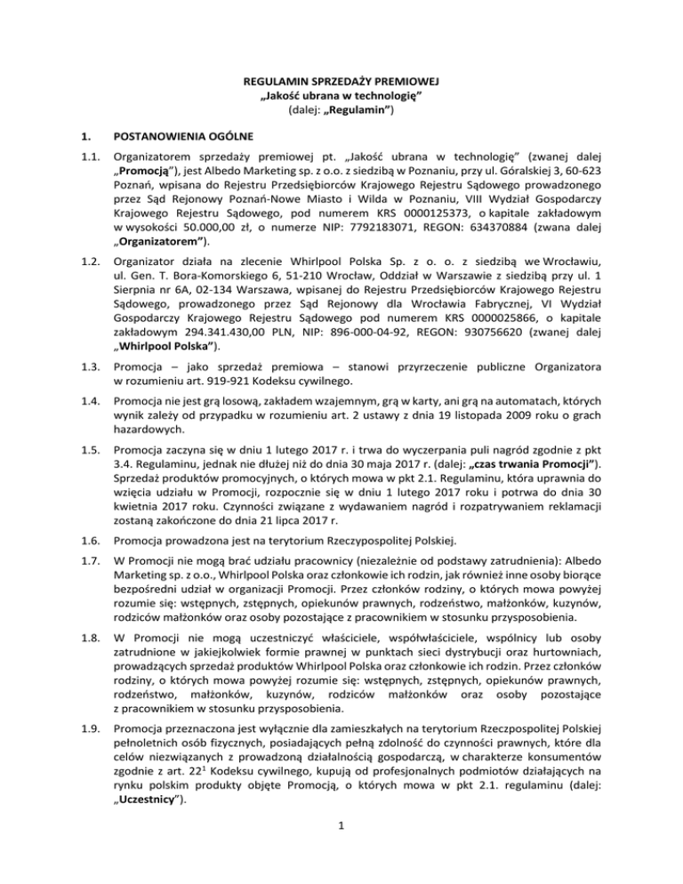 REGULAMIN SPRZEDAŻY PREMIOWEJ „Jakość ubrana w technologię” (dalej: „Regulamin”) 1. POSTANOWIENIA OGÓLNE 1.1. Organizatorem sprzedaży premiowej pt. „Jakość ubrana w technologię” (zwanej dalej „Promocją”), jest Albedo Marketing sp. z o.o. z siedzibą w Poznaniu, przy ul. Góralskiej 3, 60-623 Poznań, wpisana do Rejestru Przedsiębiorców Krajowego Rejestru Sądowego prowadzonego przez Sąd Rejonowy Poznań-Nowe Miasto i Wilda w Poznaniu, VIII Wydział Gospodarczy Krajowego Rejestru Sądowego, pod numerem KRS 0000125373, o kapitale zakładowym w wysokości 50.000,00 zł, o numerze NIP: 7792183071, REGON: 634370884 (zwana dalej „Organizatorem”). 1.2. Organizator działa na zlecenie Whirlpool Polska Sp. z o. o. z siedzibą we Wrocławiu, ul. Gen. T. Bora-Komorskiego 6, 51-210 Wrocław, Oddział w Warszawie z siedzibą przy ul. 1 Sierpnia nr 6A, 02-134 Warszawa, wpisanej do Rejestru Przedsiębiorców Krajowego Rejestru Sądowego, prowadzonego przez Sąd Rejonowy dla Wrocławia Fabrycznej, VI Wydział Gospodarczy Krajowego Rejestru Sądowego pod numerem KRS 0000025866, o kapitale zakładowym 294.341.430,00 PLN, NIP: 896-000-04-92, REGON: 930756620 (zwanej dalej „Whirlpool Polska”). 1.3. Promocja – jako sprzedaż premiowa – stanowi przyrzeczenie publiczne Organizatora w rozumieniu art. 919-921 Kodeksu cywilnego. 1.4. Promocja nie jest grą losową, zakładem wzajemnym, grą w karty, ani grą na automatach, których wynik zależy od przypadku w rozumieniu art. 2 ustawy z dnia 19 listopada 2009 roku o grach hazardowych. 1.5. Promocja zaczyna się w dniu 1 lutego 2017 r. i trwa do wyczerpania puli nagród zgodnie z pkt 3.4. Regulaminu, jednak nie dłużej niż do dnia 30 maja 2017 r. (dalej: „czas trwania Promocji”). Sprzedaż produktów promocyjnych, o których mowa w pkt 2.1. Regulaminu, która uprawnia do wzięcia udziału w Promocji, rozpocznie się w dniu 1 lutego 2017 roku i potrwa do dnia 30 kwietnia 2017 roku. Czynności związane z wydawaniem nagród i rozpatrywaniem reklamacji zostaną zakończone do dnia 21 lipca 2017 r. 1.6. Promocja prowadzona jest na terytorium Rzeczypospolitej Polskiej. 1.7. W Promocji nie mogą brać udziału pracownicy (niezależnie od podstawy zatrudnienia): Albedo Marketing sp. z o.o., Whirlpool Polska oraz członkowie ich rodzin, jak również inne osoby biorące bezpośredni udział w organizacji Promocji. Przez członków rodziny, o których mowa powyżej rozumie się: wstępnych, zstępnych, opiekunów prawnych, rodzeństwo, małżonków, kuzynów, rodziców małżonków oraz osoby pozostające z pracownikiem w stosunku przysposobienia. 1.8. W Promocji nie mogą uczestniczyć właściciele, współwłaściciele, wspólnicy lub osoby zatrudnione w jakiejkolwiek formie prawnej w punktach sieci dystrybucji oraz hurtowniach, prowadzących sprzedaż produktów Whirlpool Polska oraz członkowie ich rodzin. Przez członków rodziny, o których mowa powyżej rozumie się: wstępnych, zstępnych, opiekunów prawnych, rodzeństwo, małżonków, kuzynów, rodziców małżonków oraz osoby pozostające z pracownikiem w stosunku przysposobienia. 1.9. Promocja przeznaczona jest wyłącznie dla zamieszkałych na terytorium Rzeczpospolitej Polskiej pełnoletnich osób fizycznych, posiadających pełną zdolność do czynności prawnych, które dla celów niezwiązanych z prowadzoną działalnością gospodarczą, w charakterze konsumentów zgodnie z art. 221 Kodeksu cywilnego, kupują od profesjonalnych podmiotów działających na rynku polskim produkty objęte Promocją, o których mowa w pkt 2.1. regulaminu (dalej: „Uczestnicy”). 1 1.10. Strona internetowa Promocji dostępna jest pod adresem www.whirlpool-promocja.pl (dalej: „Strona Promocji”). 1.11. W przypadku wyczerpania się puli nagród w Promocji i zakończenia Promocji Organizator nie będzie przyjmował nowych zgłoszeń od Uczestników. 2. WARUNKI UCZESTNICTWA W PROMOCJI 2.1. Promocją objęte są wszystkie modele pralek ładowanych od góry marki „WHIRLPOOL” o identyfikatorze „TDLR” oraz wszystkie modele pralek marki „WHIRLPOOL” ładowanych od przodu o pojemności 6 kg i więcej, dostępne w sieci dystrybucji Whirlpool Polska na terenie Polski w czasie trwania Promocji (zwane dalej „Produktami Promocyjnymi”). 2.2. Promocja polega na nagrodzeniu każdego Uczestnika, który zapewni spełnienie wszystkich następujących działań: 2.2.1. w okresie od 1 lutego 2017 r. do 30 kwietnia 2017 roku zakupi dowolny Produkt Promocyjny; 2.2.2. zachowa paragon fiskalny albo fakturę VAT wystawioną osobie fizycznej nieprowadzącej działalności gospodarczej (bez NIP nabywcy) otrzymany w związku dokonaniem zakupu Produktu Promocyjnego zgodnie z pkt 2.2.1. Regulaminu; 2.2.3. zgłosi Organizatorowi ww. zakup Produktu Promocyjnego w ciągu 30 dni od jego dokonania, jednak nie później niż do dnia 30 maja 2017 roku, poprzez przesłanie prawidłowo wypełnionego formularza zgłoszeniowego, zgodnie z zasadami określonymi w pkt 2.3.-2.5. regulaminu (dalej: „formularz zgłoszeniowy”). 2.3. Prawidłowo wypełniony formularz zgłoszeniowy powinien zawierać następujące dane Uczestnika: 2.3.1. imię i nazwisko; 2.3.2. adres do korespondencji; 2.3.3. numer telefonu komórkowego; 2.3.4. adres e-mail; 2.3.5. informacje o zakupionym Produkcie Promocyjnym w postaci: modelu Produktu Promocyjnego, numeru seryjnego Produktu Promocyjnego, daty zakupu Produktu Promocyjnego. Do formularza zgłoszeniowego powinien zostać dołączony skan dowodu zakupu Produktu Promocyjnego, o którym mowa w pkt 2.2.2. Regulaminu – paragonu fiskalnego lub faktury VAT wystawionej osobie fizycznej nieprowadzącej działalności gospodarczej (bez NIP nabywcy). 2.4. Wypełniając formularz zgłoszeniowy Uczestnik zobowiązany jest złożyć oświadczenie o zapoznaniu się z regulaminem Promocji, wyrazić zgodę na przetwarzanie jego danych osobowych na potrzeby realizacji Promocji, a także