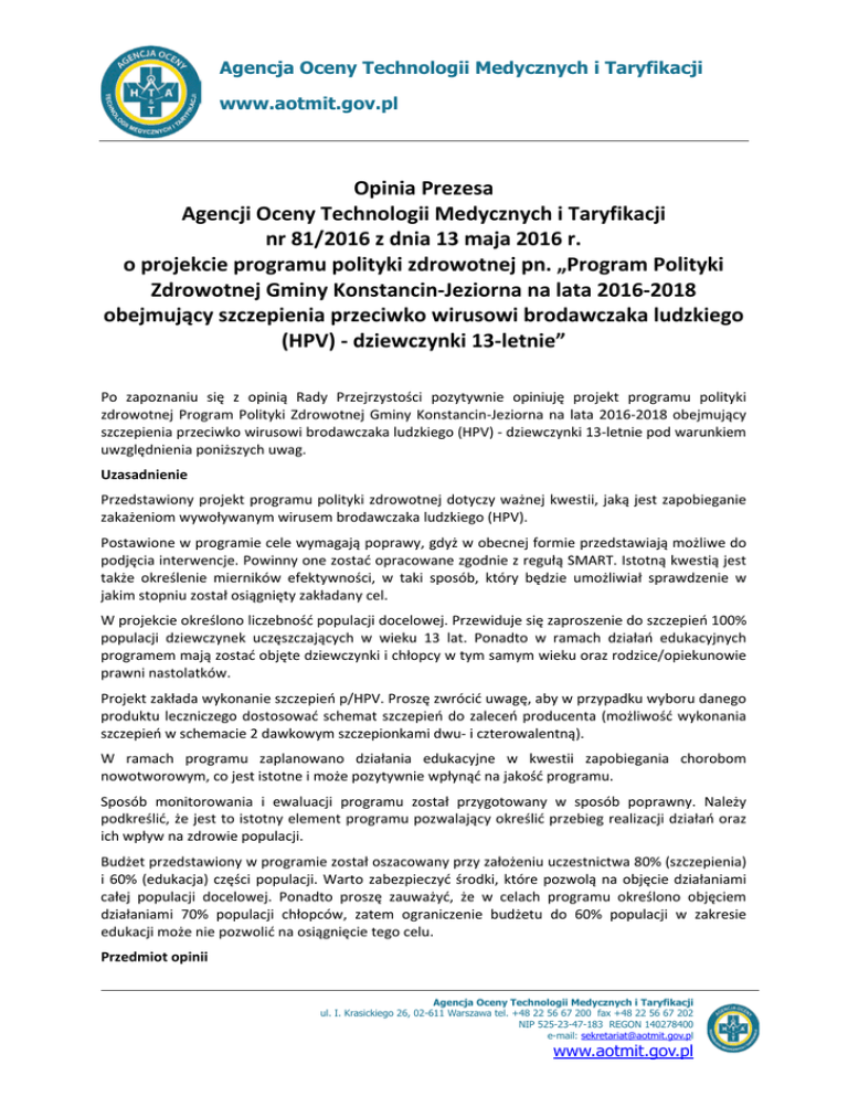 Agencja Oceny Technologii Medycznych i Taryfikacji www.aotmit.gov.pl Opinia Prezesa Agencji Oceny Technologii Medycznych i Taryfikacji nr 81/2016 z dnia 13 maja 2016 r. o projekcie programu polityki zdrowotnej pn. „Program Polityki Zdrowotnej Gminy Konstancin-Jeziorna na lata 2016-2018 obejmujący szczepienia przeciwko wirusowi brodawczaka ludzkiego (HPV) - dziewczynki 13-letnie” Po zapoznaniu się z opinią Rady Przejrzystości pozytywnie opiniuję projekt programu polityki zdrowotnej Program Polityki Zdrowotnej Gminy Konstancin-Jeziorna na lata 2016-2018 obejmujący szczepienia przeciwko wirusowi brodawczaka ludzkiego (HPV) - dziewczynki 13-letnie pod warunkiem uwzględnienia poniższych uwag. Uzasadnienie Przedstawiony projekt programu polityki zdrowotnej dotyczy ważnej kwestii, jaką jest zapobieganie zakażeniom wywoływanym wirusem brodawczaka ludzkiego (HPV). Postawione w programie cele wymagają poprawy, gdyż w obecnej formie przedstawiają możliwe do podjęcia interwencje. Powinny one zostać opracowane zgodnie z regułą SMART. Istotną kwestią jest także określenie mierników efektywności, w taki sposób, który będzie umożliwiał sprawdzenie w jakim stopniu został osiągnięty zakładany cel. W projekcie określono liczebność populacji docelowej. Przewiduje się zaproszenie do szczepień 100% populacji dziewczynek uczęszczających w wieku 13 lat. Ponadto w ramach działań edukacyjnych programem mają zostać objęte dziewczynki i chłopcy w tym samym wieku oraz rodzice/opiekunowie prawni nastolatków. Projekt zakłada wykonanie szczepień p/HPV. Proszę zwrócić uwagę, aby w przypadku wyboru danego produktu leczniczego dostosować schemat szczepień do zaleceń producenta (możliwość wykonania szczepień w schemacie 2 dawkowym szczepionkami dwu- i czterowalentną). W ramach programu zaplanowano działania edukacyjne w kwestii zapobiegania chorobom nowotworowym, co jest istotne i może pozytywnie wpłynąć na jakość programu. Sposób monitorowania i ewaluacji programu został przygotowany w sposób poprawny. Należy podkreślić, że jest to istotny element programu pozwalający określić przebieg realizacji działań oraz ich wpływ na zdrowie populacji. Budżet przedstawiony w programie został oszacowany przy założeniu uczestnictwa 80% (szczepienia) i 60% (edukacja) części populacji. Warto zabezpieczyć środki, które pozwolą na objęcie działaniami całej populacji docelowej. Ponadto proszę zauważyć, że w celach programu określono objęciem działaniami 70% populacji chłopców, zatem ograniczenie budżetu do 60% populacji w zakresie edukacji może nie pozwolić na osiągnięcie tego celu. Przedmiot opinii Agencja Oceny Technologii Medycznych i Taryfikacji ul. I. Krasickiego 26, 02-611 Warszawa tel. +48 22 56 67 200 fax +48 22 56 67 202 NIP 525-23-47-183 REGON 140278400 e-mail: [email protected] www.aotmit.gov.pl Opinia Prezesa AOTMiT nr 81/2016 z dnia 13 maja 2016r. Przedmiotem opinii jest projekt programu polityki zdrowotnej dotyczący zapobiegania zakażeniom HPV w populacji nastoletnich dziewczynek. Budżet zaplanowany na przeprowadzenie programu wynosi 35 000 zł rocznie, zaś okres realizacji programu to lata 2016-2018. Opinia Prezesa Agencji została przygotowana w oparciu o ocenę technologii medycznej proponowanej w ramach programu polityki zdrowotnej zgodnie z kryteriami zawartymi w art. 31a ust. 1 i art. 48 ust. 4 ustawy o świadczeniach wraz z oceną założeń projektu programu polityki zdrowotnej, które wspierają efektywność kliniczną i kosztową technologii medycznej planowanej w programie. Ocena projektu programu polityki zdrowotnej Znaczenie problemu zdrowotnego Przedstawiony projekt programu polityki zdrowotnej porusza istotną kwestię zakażeń wirusem HPV, który jest odpowiedzialny m. in. za występowanie raka szyjki macicy. Opis problemu został przedstawiony w sposób poprawny i wpisuje się w założenia Populacyjnego Programu Profilaktyki i Wczesnego Wykrywania Raka Szyjki Macicy. W projekcie programu odniesiono się do epidemiologii raka szyjki macicy w Polsce. Zgodnie z najbardziej aktualnymi danymi pochodzącymi z Krajowego Rejestru Nowotworów można wnioskować, iż w 2013 r. w województwie mazowieckim na raka szyjki macicy (C53) zachorowało łącznie 360 kobiet, natomiast zmarło 229 kobiet. Cele i efekty programu Celem głównym programu jest zabezpieczenie co najmniej 80% populacji dziewczynek w wieku 13 lat szczepionką przeciwko HPV i objęcie działaniami edukacyjnymi dotyczącymi wirusa raka szyjki macicy co najmniej 70% populacji chłopców w wieku 13 lat, w latach 2016-2018 w gminie KonstancinJeziorna. Dodatkowo wskazano 5 celów szczegółowych. Proszę zwrócić uwagę, że cel główny został sformułowany w sposób niepoprawny, gdyż przedstawia możliwe do podjęcia działania. Tworzenie celów powinno się odbywać zgodnie z zasadą SMART, według której cel główny powinien być m. in. szczegółowy (zawierający czytelny przekaz), mierzalny (liczbowe określenie stopnia jego realizacji), realistyczny (możliwy do osiągnięcia), ambitny/atrakcyjny i terminowy (określony w czasie). Oczekiwane efekty zostały określone poprawnie. W projekcie wskazano mierniki efektywności, jednak odnoszą się one głównie do zgłaszalności do programu, nie zaś do efektów prowadzonych działań (poza oceną zapadalności na raka szyjki macicy). Celem mierników efektywności jest umożliwienie oceny stopnia realizacji celów. W odniesieniu do szczepień warto monitorować w długim horyzoncie czasowym zachorowania na raka szyjki macicy i w miarę możliwości zweryfikować, które z osób dotkniętych nowotworem były wcześniej szczepione. W odniesieniu do działań edukacyjnych warto także zweryfikować zgłaszalność na profilaktyczne badania cytologiczne wśród kobiet oraz stan wiedzy uczestników. Populacja docelowa Populację docelową w projekcie w zakresie szczepień stanowią dz