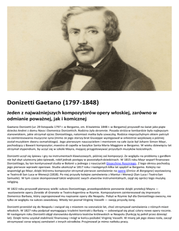 Donizetti Gaetano (1797-1848) Jeden z najważniejszych kompozytorów opery włoskiej, zarówno w odmianie poważnej, jak i komicznej Gaetano Donizetti (ur. 29 listopada 1797 r. w Bergamo, zm. 8 kwietnia 1848 r. w Bergamo) przyszedł na świat jako piąte dziecko Andrei z domu Nava i Domenica Donizettich. Rodzina żyła skromnie. Posada stróża w lombardzie była najlepszym stanowiskiem, jakie otrzymał ojciec Donizettiego, natomiast matka była szwaczką. Rodzice nieprzychylnym okiem patrzyli na zainteresowania muzyczne syna (mimo że jego starszy brat Giuseppe występował w orkiestrze wojskowej a później został muzykiem dworu osmańskiego). Jego pierwszym nauczycielem i mentorem na całe życie był Johann Simon Mayr, pochodzący z Bawarii kompozytor, maestro di capella w bazylice Santa Maria Maggiore w Bergamo. W wieku dziewięciu lat otrzymał stypendium, by uczyć się w szkole Mayra, mającej przygotowywać przyszłych muzyków kościelnych. Donizetti uczył się śpiewu i gry na instrumentach klawiszowych, później zaś kompozycji. Ze względu na problemy z gardłem nie był zbyt użyteczny jako śpiewak, robił jednak postępy w pozostałych dziedzinach. W 1815 roku Mayr wsparł finansowo Donizettiego, by ten kontynuował studia w Bolonii u jednego z nauczycieli Gioacchino Rossiniego. Z tego okresu pochodzą jego pierwsze wprawki operowe. Studia ukończył w 1817 roku i następnych kilka lat spędził w Bergamo. Kolejny raz wspomógł go Mayr, dzięki któremu kompozytor otrzymał pierwsze zamówienie na operę (Enrico di Borgogna) wystawioną w Teatro di San Luca w Wenecji (1818). Po niej przyszły kolejne zamówienia z Mantui i Wenecji (San Luca i Teatro San Samuele). W tym czasie skomponował także większość swych utworów instrumentalnych, zajął się oprócz tego muzyką religijną. W 1822 roku przyszedł pierwszy wielki sukces Donizettiego, prawdopodobnie ponownie dzięki protekcji Mayra — wystawienie opery Zoraida di Granata w Teatro Argentina w Rzymie. Kompozytorem zainteresował się impresario Domenico Barbaia, który zaproponował mu napisanie opery dla Neapolu. Pobyt w Rzymie był dla Donizettiego owocny, nie tylko ze względu na sukces zawodowy. Wtedy też poznał Virginię Vasselli — swoją przyszłą żonę. Donizetti przeniósł się do Neapolu i związał się z miastem na szesnaście lat, choć otrzymywał zamówienia z różnych miast włoskich. W 1827 roku podpisał wymagający trzyletni kontrakt z Barbaią — zobowiązał się pisać cztery nowe opery rocznie. W następnym roku Donizetti objął stanowisko dyrektora teatrów królewskich w Neapolu (funkcję tę pełnił przez dziesięć lat). Dzięki temu uzyskał stabilność finansową i mógł w końcu poślubić Virginię Vasselli. W miarę jak jego sława rosła, zaczął otrzymywać coraz więcej zamówień z innych ośrodków. Przyjmował je mimo natłoku pracy. Kariera Donizettiego rozwijała się prężnie. Rozgłos międzynarodowy przyniosła mu premiera trzydziestej pierwszej opery. Anna Bolena została wystawiona w Teatro Carcano w Mediolanie w 1830 roku. Niedługo potem trafiła na sceny Paryża i Londynu. Okres 1830-1838 był bardzo owocny dla kompozytora: powstało wtedy — liczba imponująca — 25 oper. L'elisir d'amore (1832), Lucrezia Borgia (1833), Maria Stuarda (1834), Lucia di Lamermoor (1835) to tytuły, które cieszyły się największą popularnością i wystawiane były na wielu scenach europejskich. Donizetti był usatysfakcjonowany kolejnymi sukcesami, jego marzeniem był jednak debiut w Paryżu (pierwszą nieudaną próbę datuje się już na 1831 rok). Okazja nadarzyła się w 1835 roku, gdy Rossini, dyrektor paryskiego Théâtre Italien, zamówił dwie nowe opery — jedną u Donizettiego, drugą zaś u kompozytora dorównującego mu pozycją, Vincenzo Belliniego (uznawanego powszechnie za jego rywala). Opera Donizettiego, Marino Faliero, została dobrze przyjęta, choć nie tak owacyjnie jak dzieło Belliniego, I puritani. Kontrapunktem dla sukcesów zawodowych Donizettiego były wydarzenia z życia osobistego — w połowie lat trzydziestych umarli w odstępie kilku tygodni jego oboje rodzice. Kompozytor przeżył jednak najbardziej śmierć żony w 1837 roku, która zmarła w wyniku powikłań przy porodzie. Donizetti opuścił Neapol rok później i przeniósł się na stałe do Paryża, także ze względu na kłopoty z cenzurą. Nastąpił zastój w pracy kompozytora, choć raczej nie z powodu załamania psychicznego, lecz braku zamówień. Donizetti nadzorował wystawienia własnych oper, przerabiał też stare dzieła, m.in. zakazaną przez cenzurę operę Poliuto, która została wystawiona w 1840 roku jako Les martyrs. Udało mu się wystawić w tym samym roku jeszcze dwie inne opery: La fille du régiment oraz La favorite. Gaetano Donizetti, Aria Noriny Quel guardo, il cavaliere z opery Don Pasquale W miarę upływu czasu umacniała się pozycja Donizettiego w Paryżu i zaczął otrzymywać więcej prestiżowych propozycji z innych ośrodków (premiera Adelii w Rzymie, Marii Padilli w mediolańskiej La Scali). Odbywał liczne podróże koncertowe do Włoch i Austrii. W 1842 r. odbyła się premiera jego Lindy di Chamounix w Wiedniu. Sukces był tak znaczny, że Donizetti został mianowany nadwornym kompozytorem i dyrygentem na dworze cesarskim. Łączyło się z tym wysokie wynagrodzenie, choć tak naprawdę nie przybyło kompozytorowi z tego powodu wiele obowiązków. W 1843 roku powrócił do Paryża, gdzie odbyła się premiera jego opery Don Pasquale. Od tego momentu kompozytor dzielił swój czas między Wiedeń i Paryż, robiąc także wypady do Włoch. W 1844 roku odbyła się ostatnia premiera opery Donizettiego pt. Caterina Cornaro. Około 1844-1845 roku nasiliły się u Donizettiego objawy choroby psychicznej spowodowanej syfilisem (pierwsze z nich pojawiły się najpewniej już w 1828 roku, choć nie zostały rozpoznane). Znany z produktywno